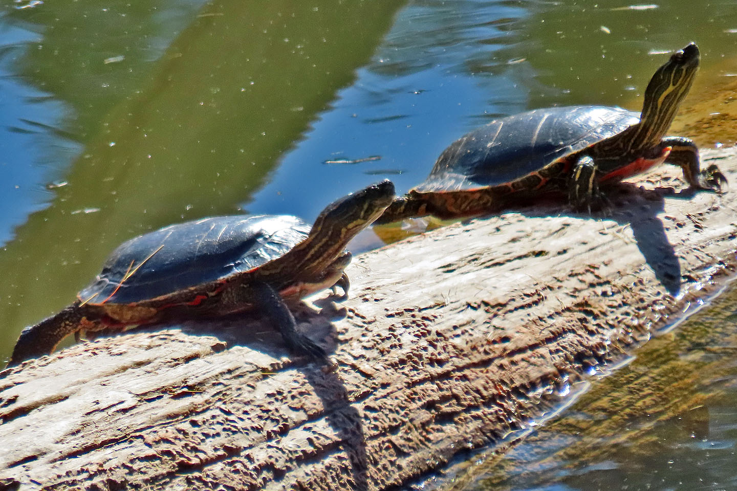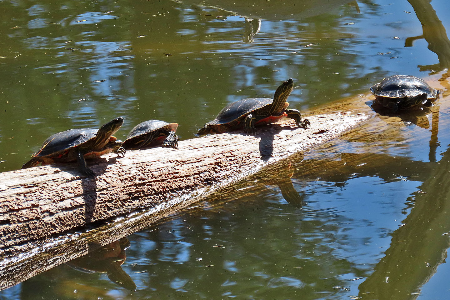We decided to return to Turtle Lake, hoping to see the turtles in the afternoon. We hiked 20 minutes and were rewarded with the sight of four turtles sunbathing on a log in the lake. We may have disturbed two, as they slipped into the water, but they soon returned and climbed back onto the log. Although returning to Turtle Lake added 3 km to our hike, it was worth it.