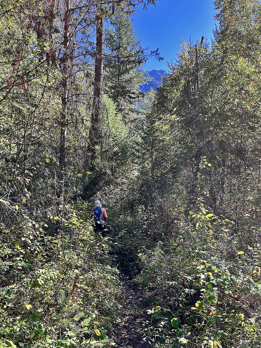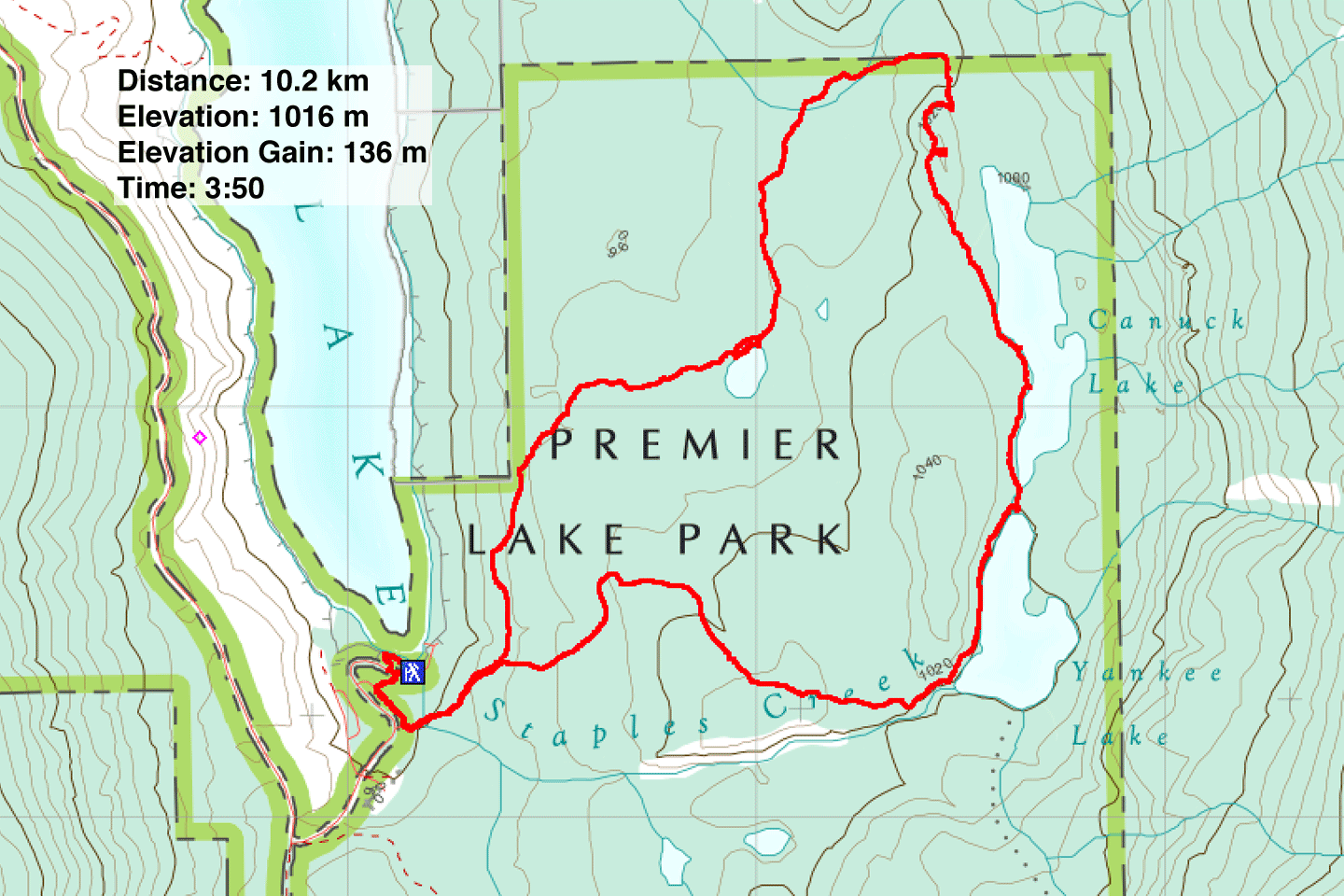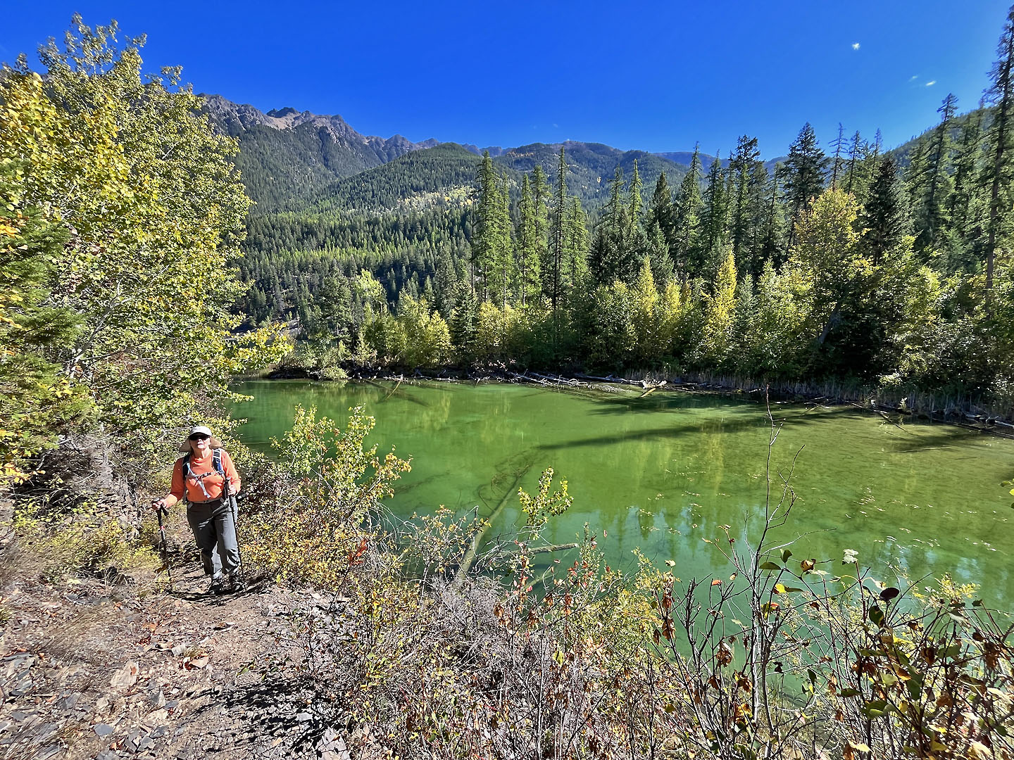 We continued to Canuck Lake and entered a dense forest. The trail climbed over a ridge and dropped down to Canuck Lake. It followed the lakeshore, with trees crowding the edge and brief trails leading to view points of the beautiful blue-green lake. Yankee Lake and Canuck Lake are only 150 m apart, so we soon came to Yankee. We followed the lakeshore trail to the end of the lake and continued back to the fork.