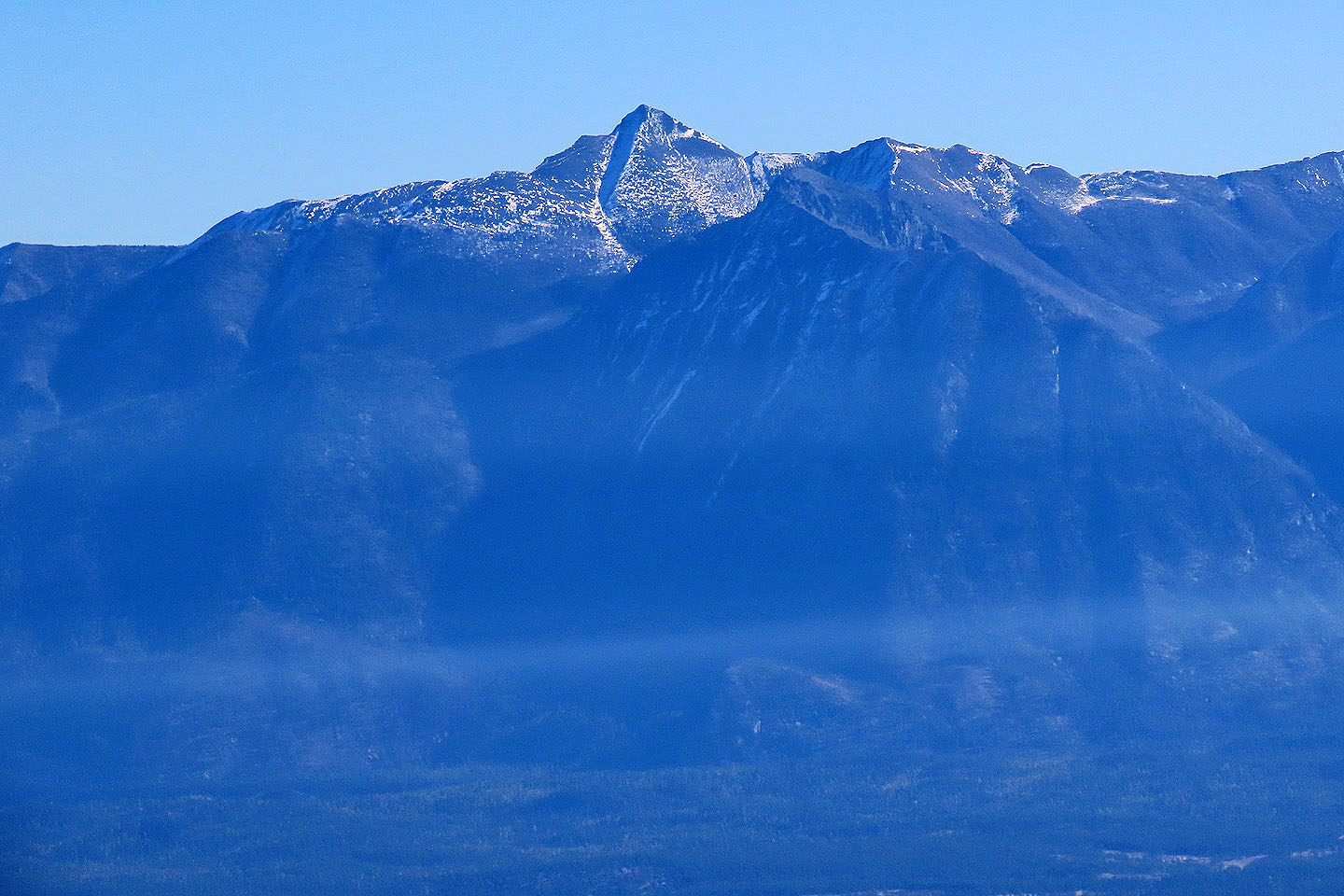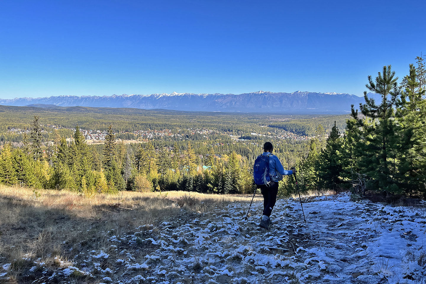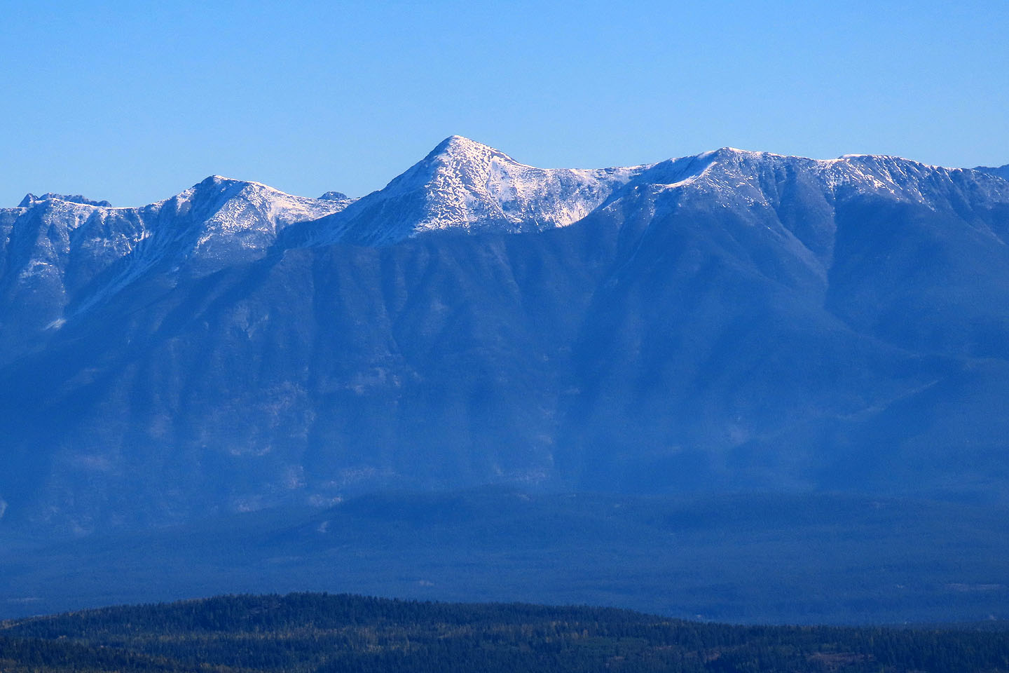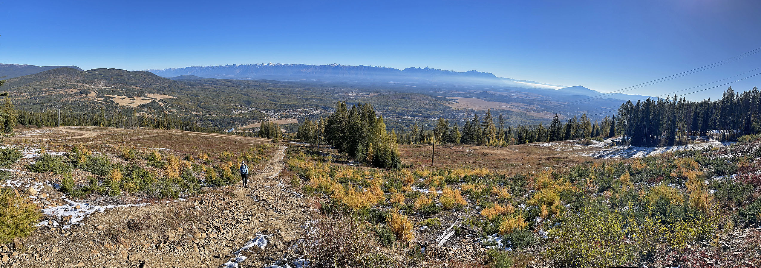 The trail ends at the top of the old T-bar lift in a clearing. From there, we gazed back across the Rocky Mountain Trench to an impressive sight. Stretching across the east horizon over 30 kilometres away were the Rockies.
