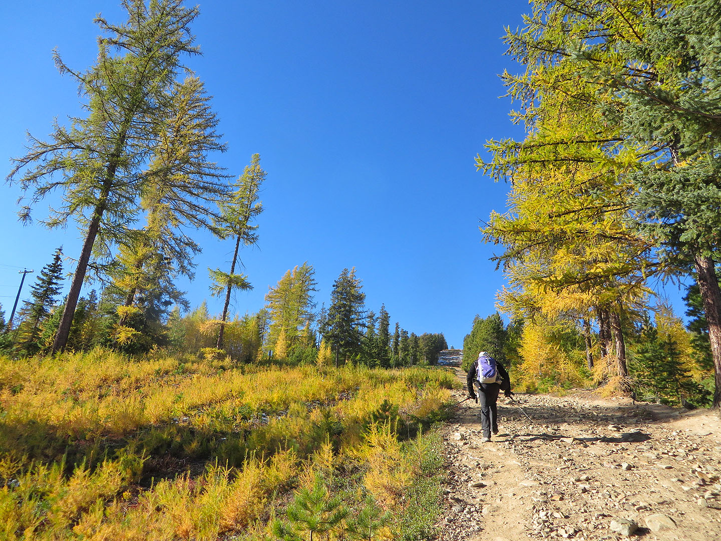 From the parking lot near the chairlift, Dinah and I started up a broad trail. We passed a couple of intersections before reaching Ego Alley Trail. Running parallel to the chairlift, the trail goes straight up a wooded slope. We began seeing yellow larches.