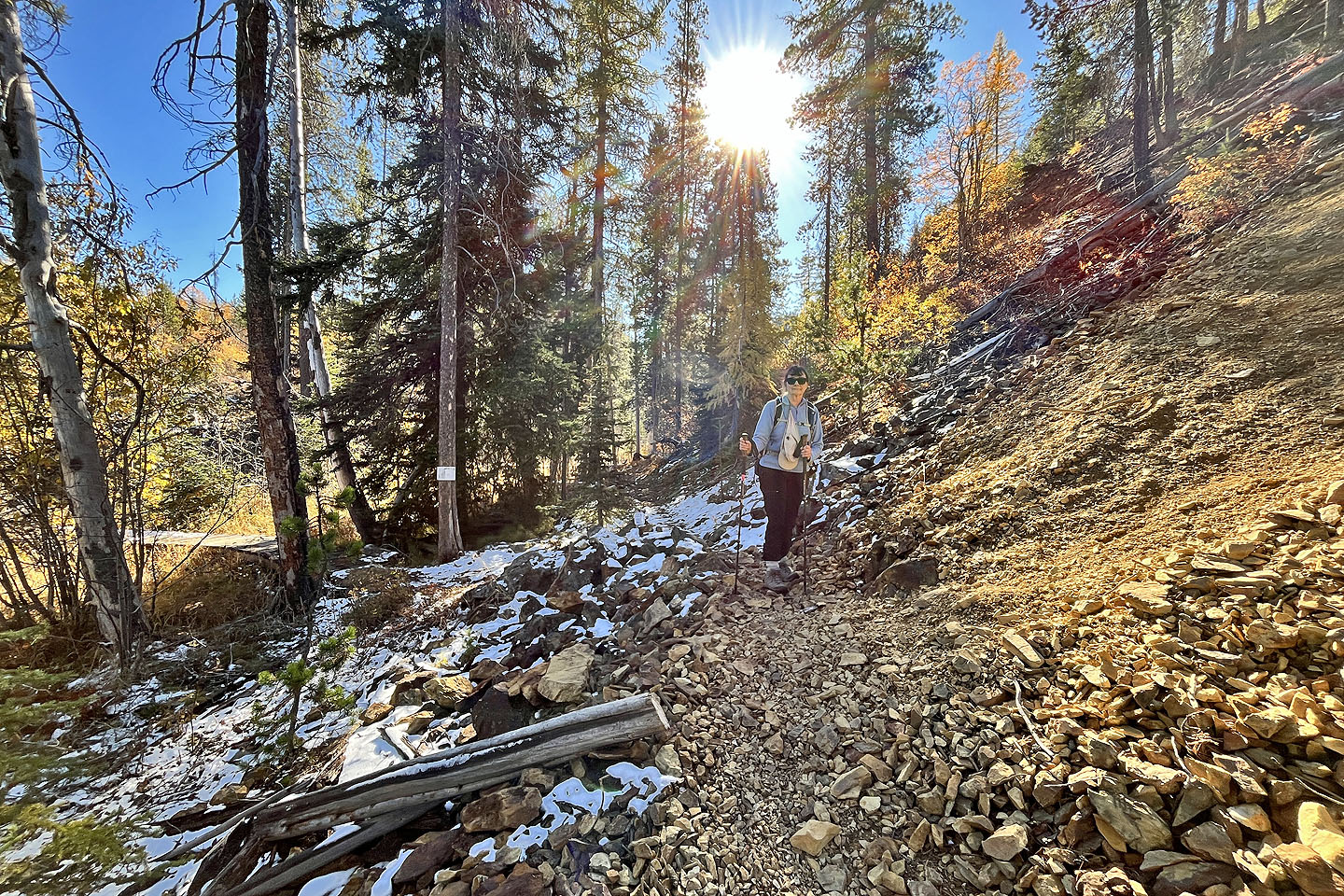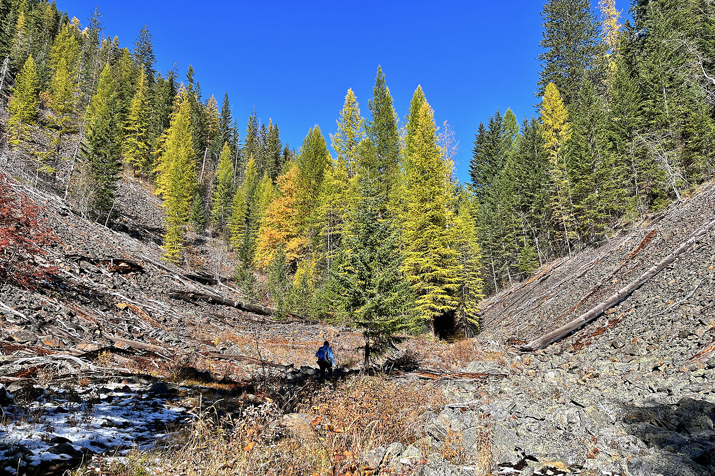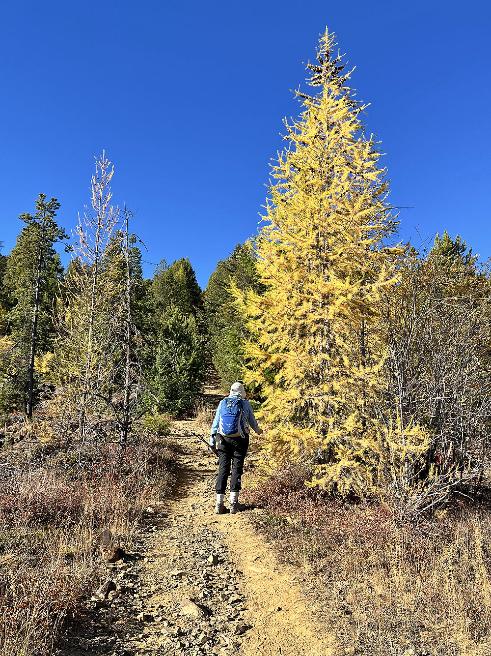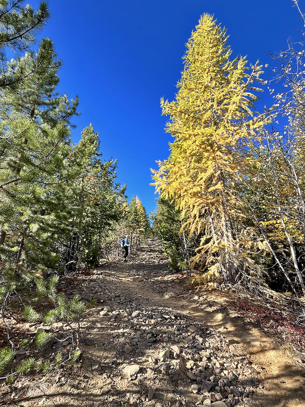 but the views were unremarkable. Eventually, we reached Moe’s Canyon. In clearings, the larches really glowed.