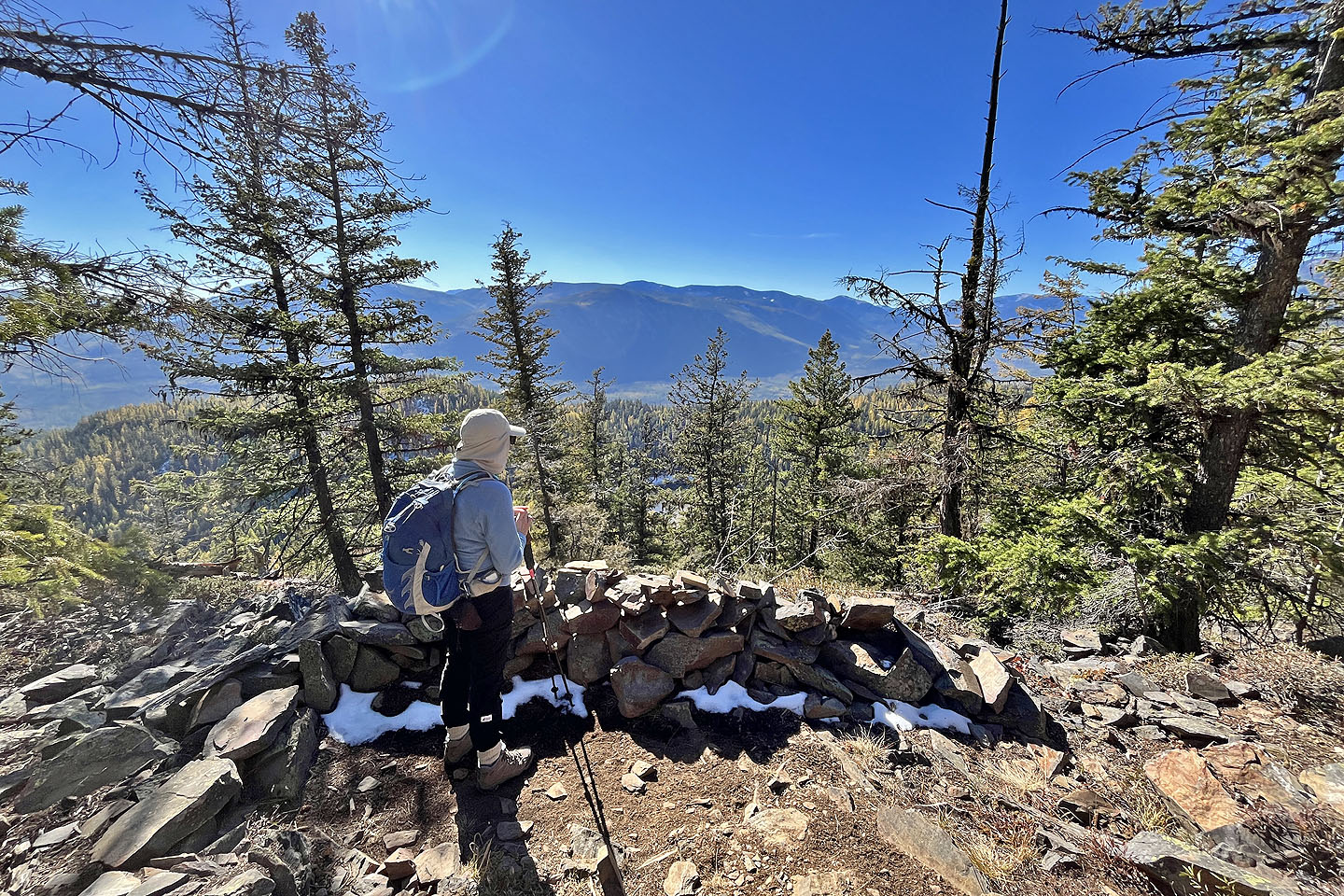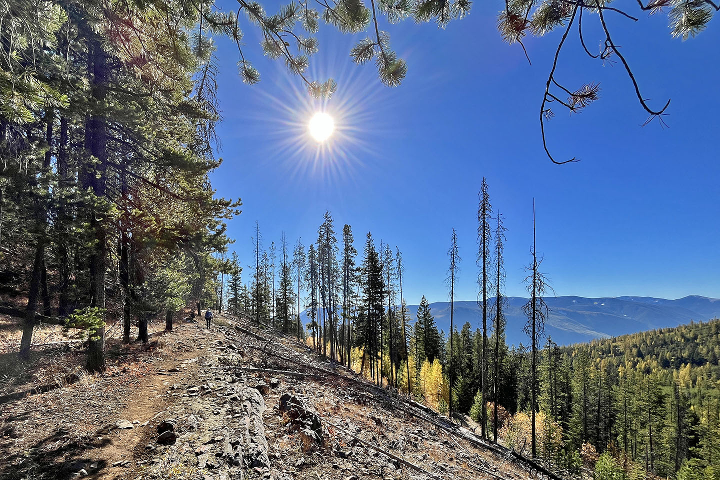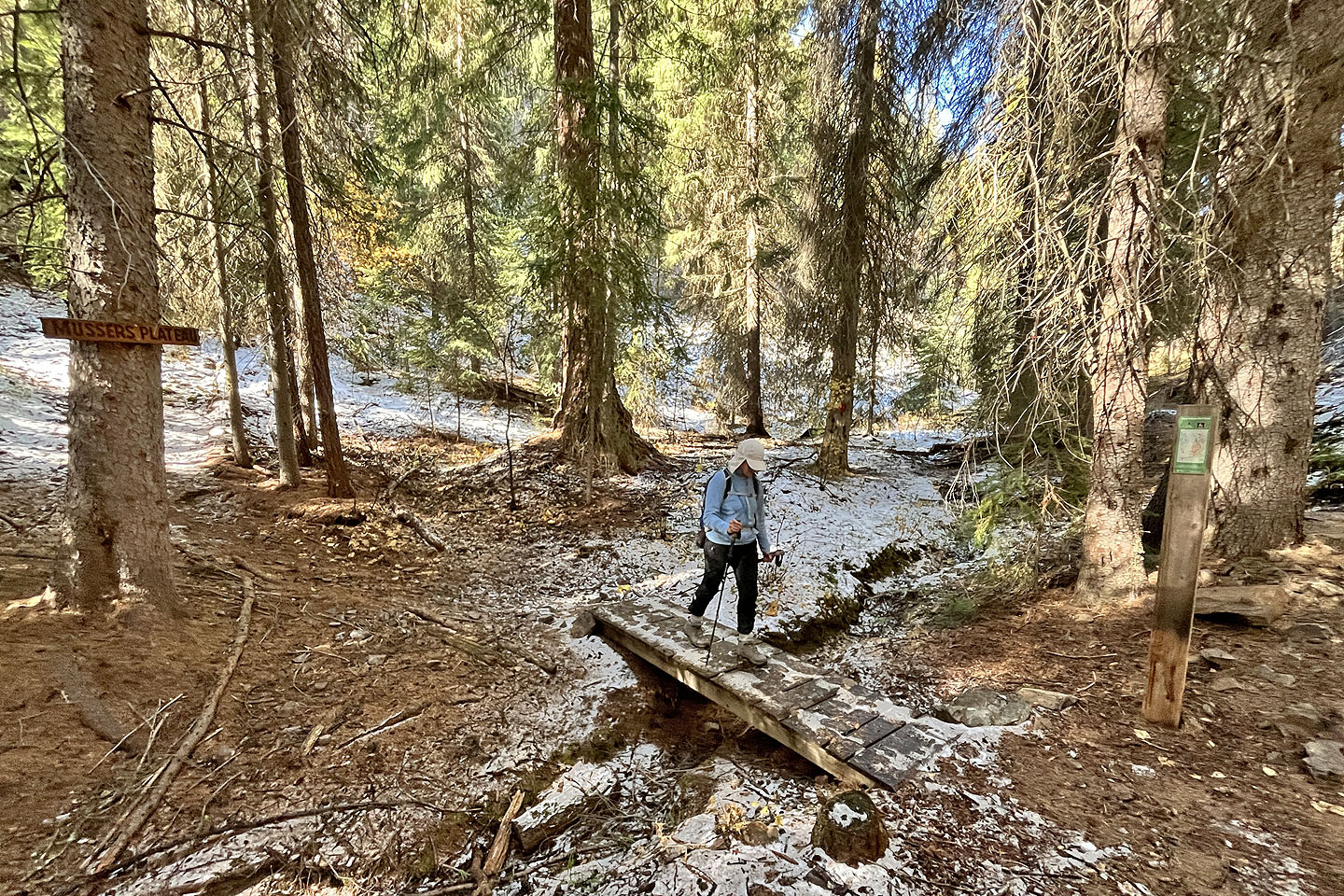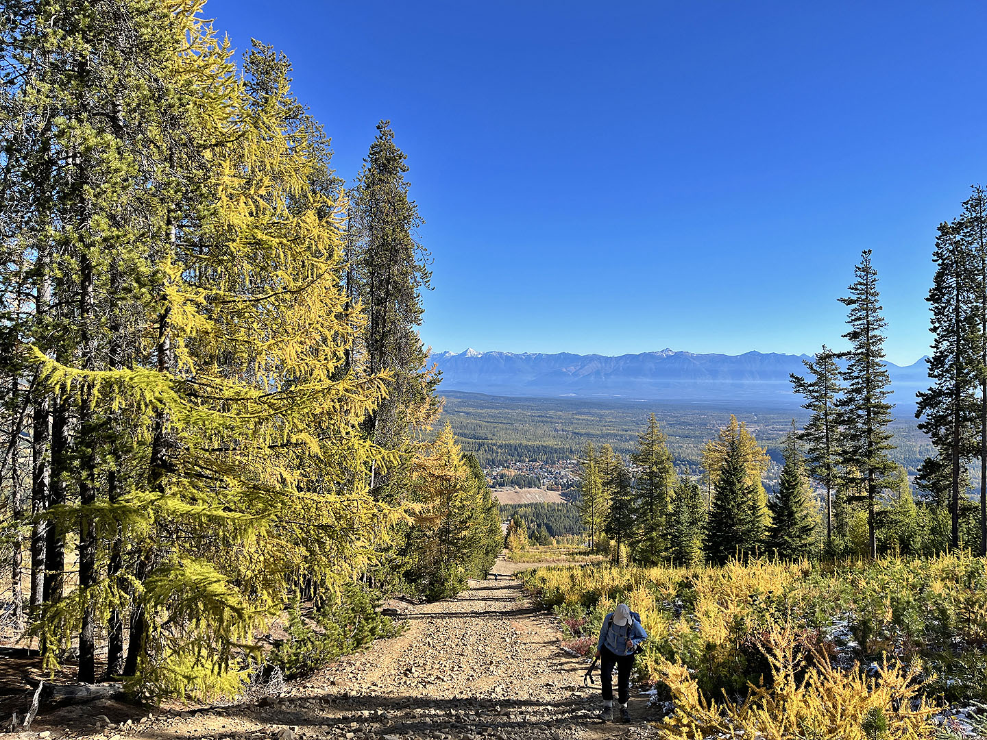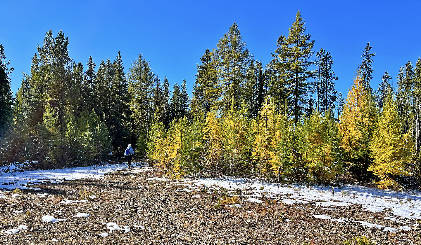 to Musser’s Plateau Trail. It descends through forest with scattered larches. We passed through small clearings,