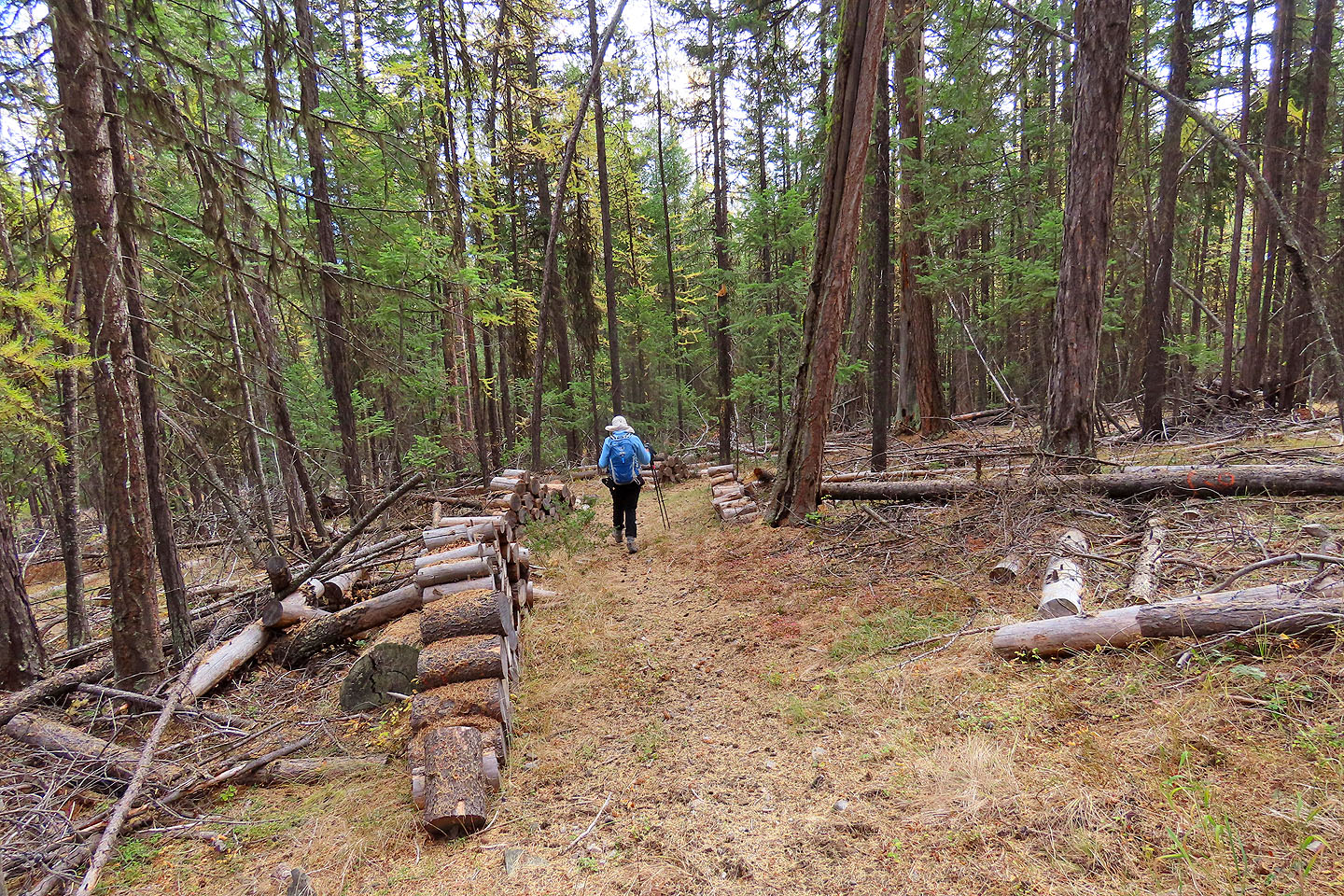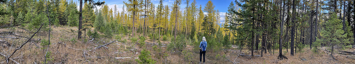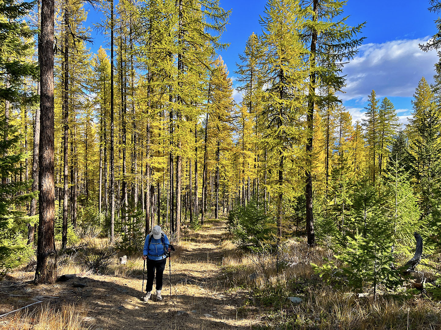 We started on Kinnikinnick Trail. Although it makes a nice loop that passes near our objective, it was too long for us because of the pending rain. We soon left Kinnikinnick and turned onto Arnica. We continued choosing trails that led directly to Kinnikinnick where it crosses high on a ridge. As we hiked, we enjoyed the sight of bright yellow larches lining the paths.