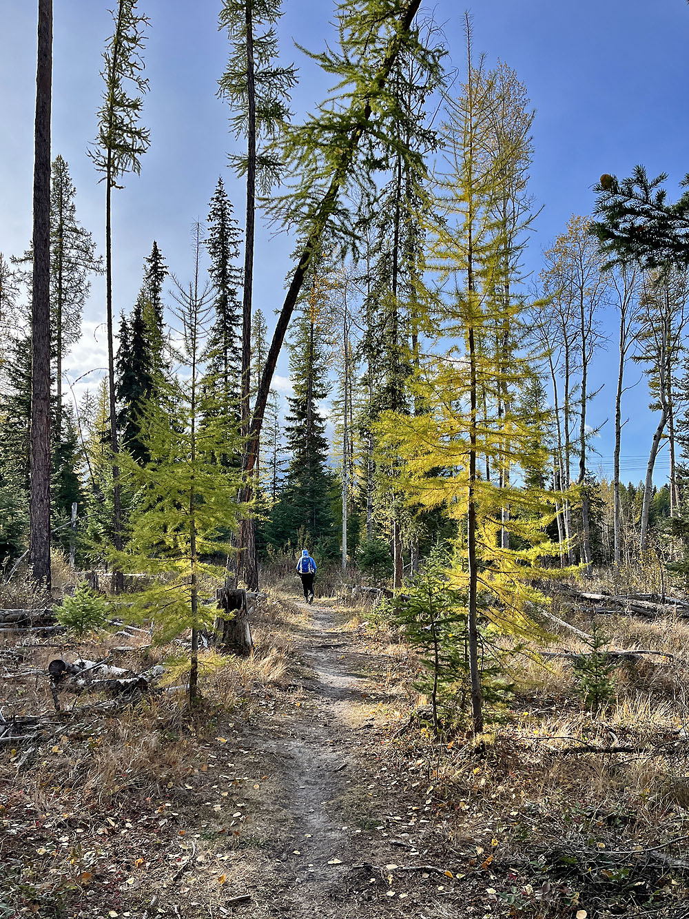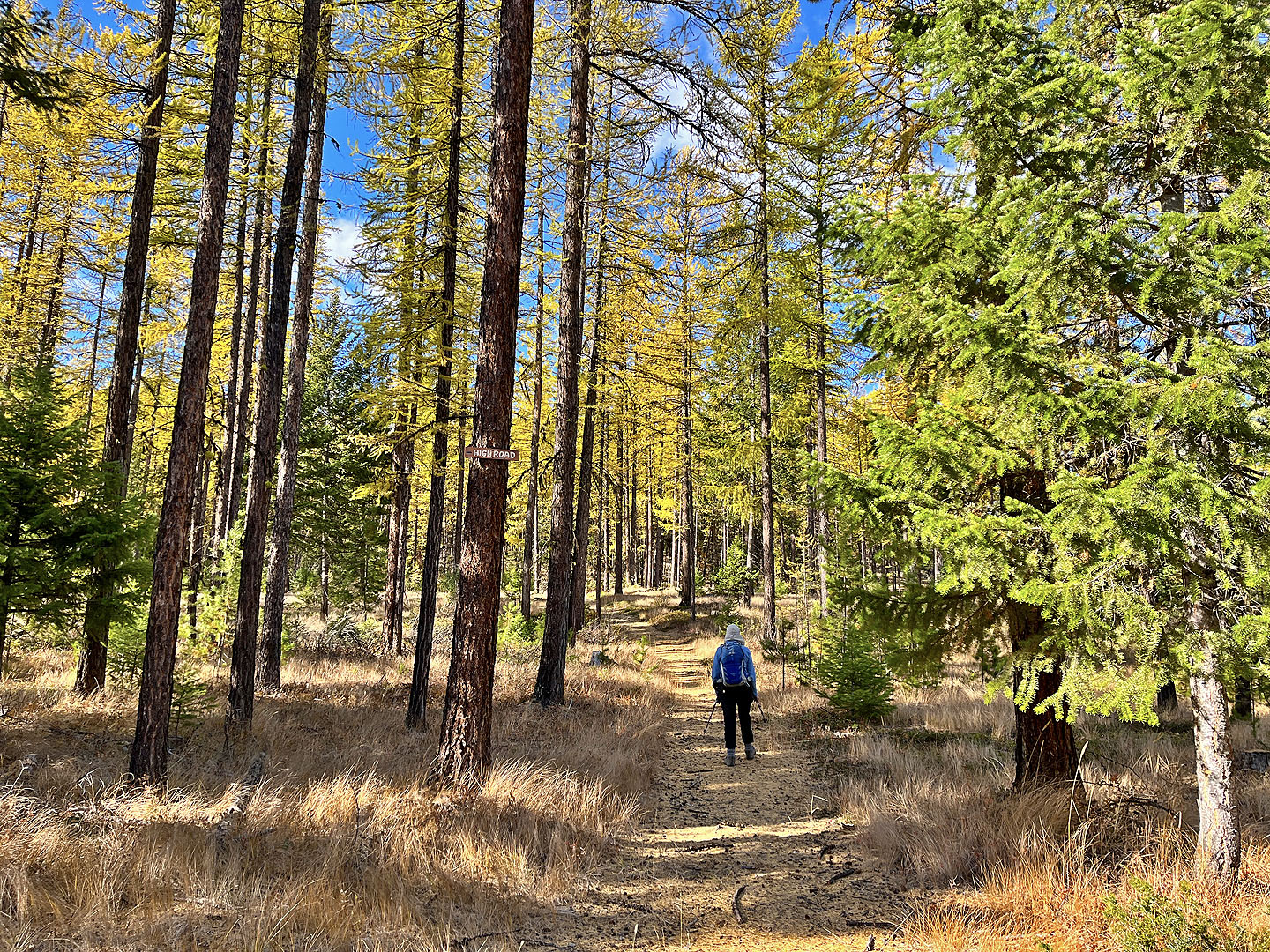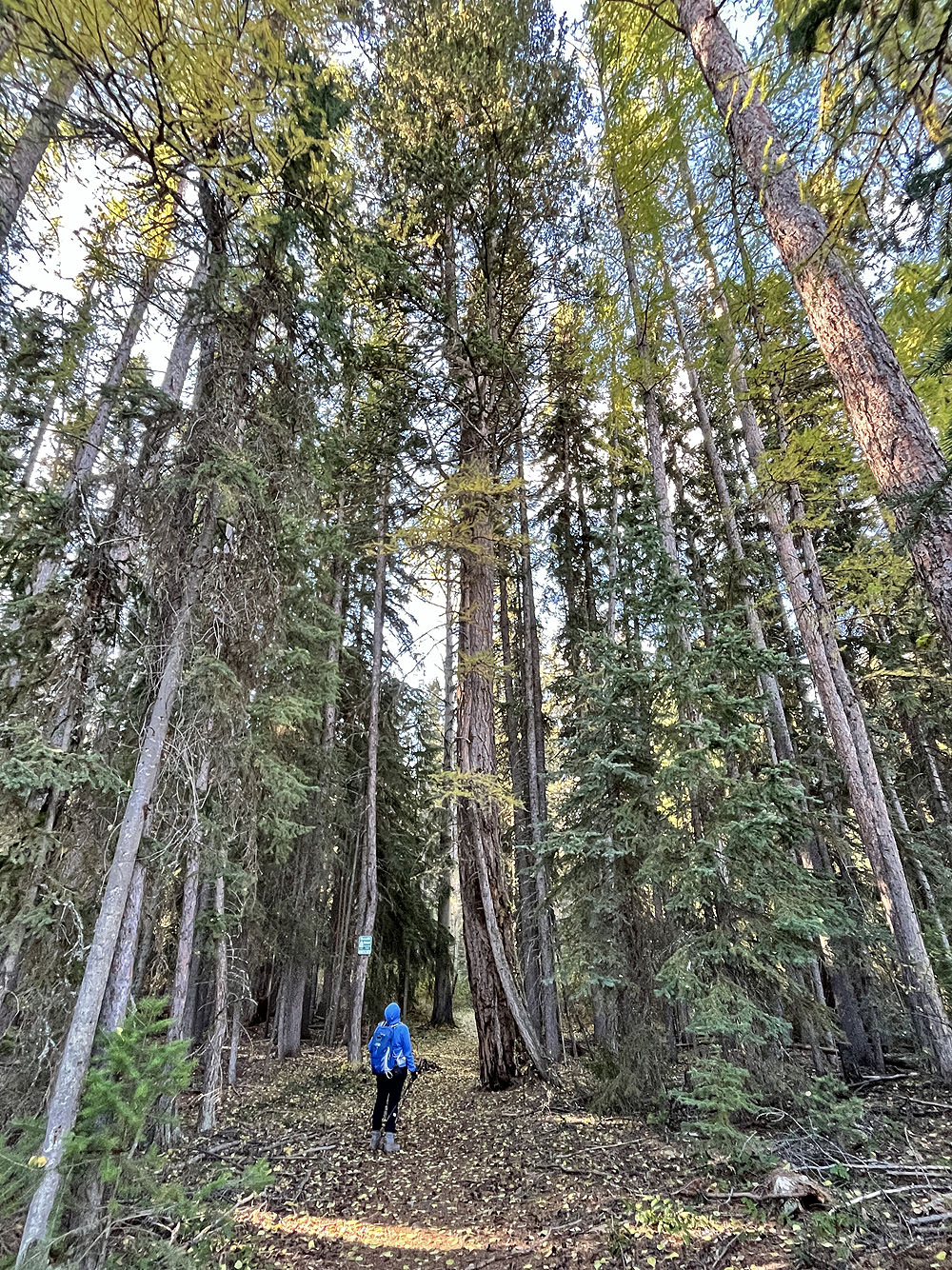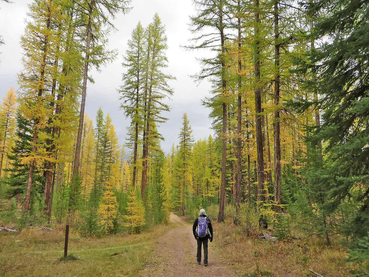 With the forecast threatening afternoon rain, Dinah and I decided on a morning hike ten minutes southeast of Cranbrook. Choosing from the network of trails in South Star Recreation Area, we planned to complete a loop and reach the second highest point in the park. We didn’t expect to find a viewpoint in the forested park, but the colourful larches on an autumn day would keep us engaged.