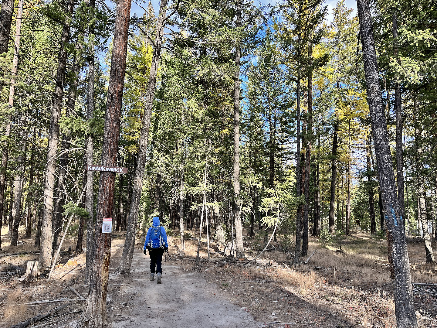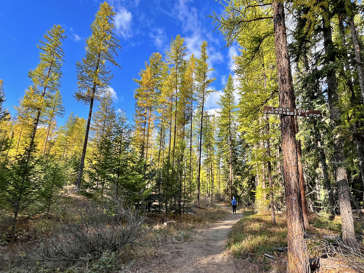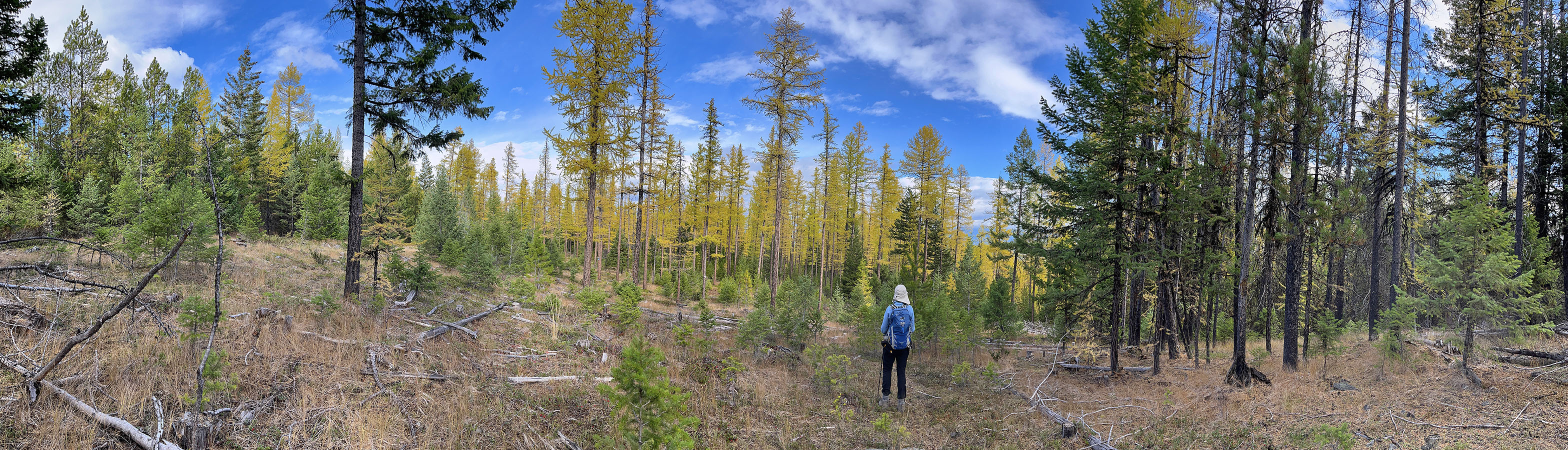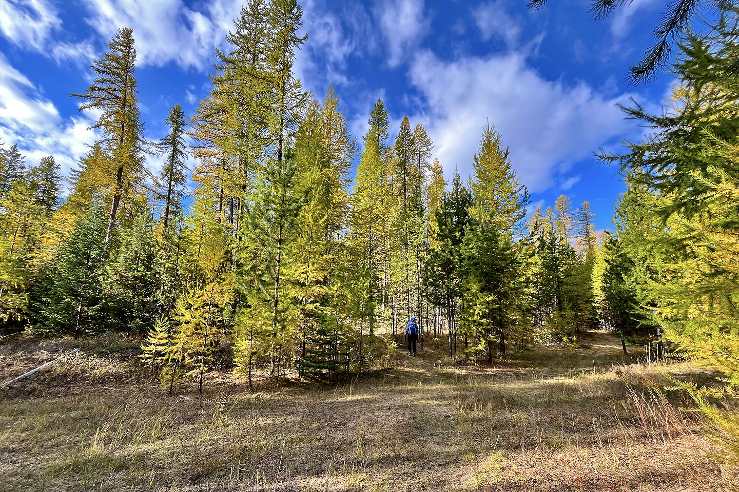 With the forecast threatening afternoon rain, Dinah and I decided on a morning hike ten minutes southeast of Cranbrook. Choosing from the network of trails in South Star Recreation Area, we planned to complete a loop and reach the second highest point in the park. We didn’t expect to find a viewpoint in the forested park, but the colourful larches on an autumn day would keep us engaged.
