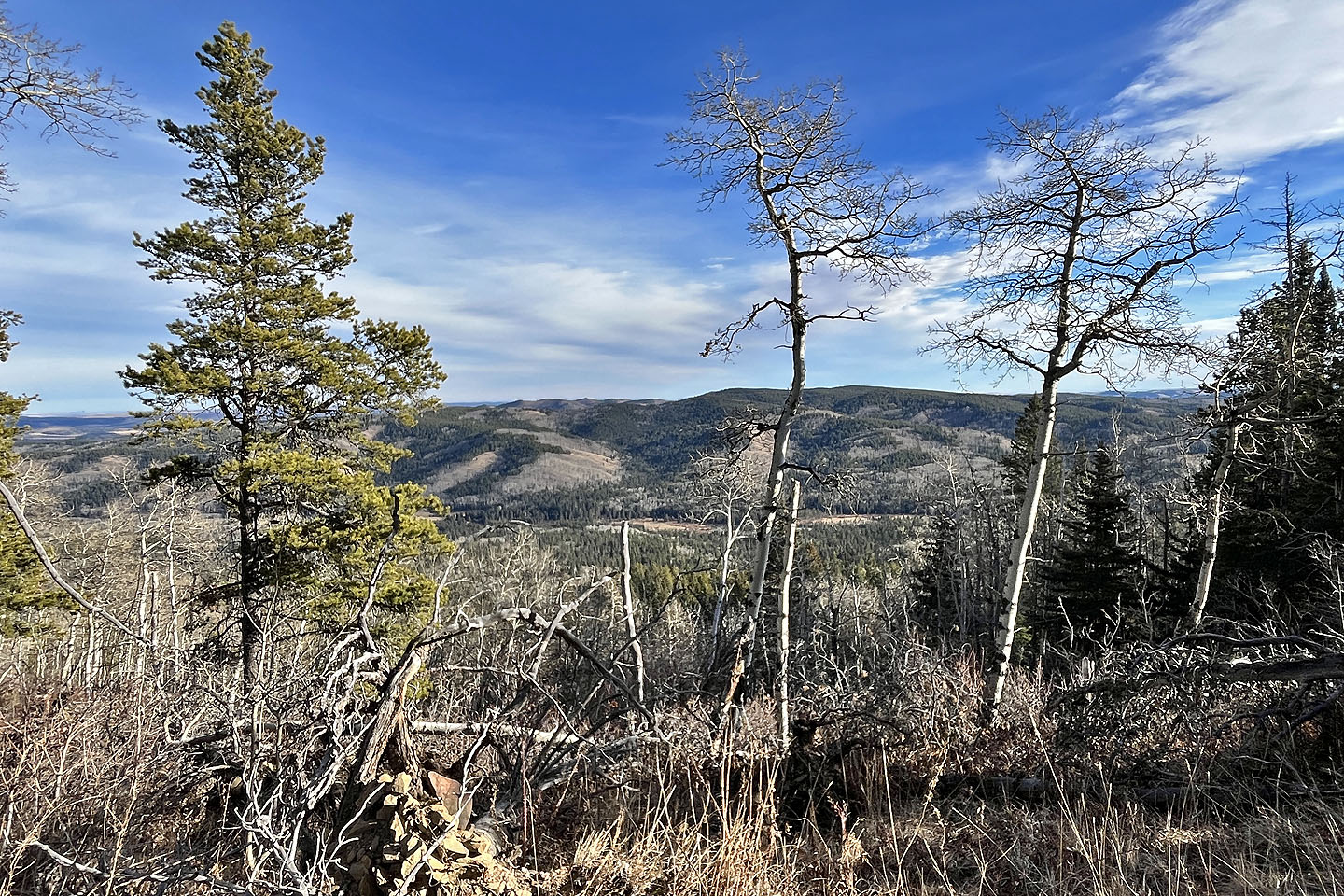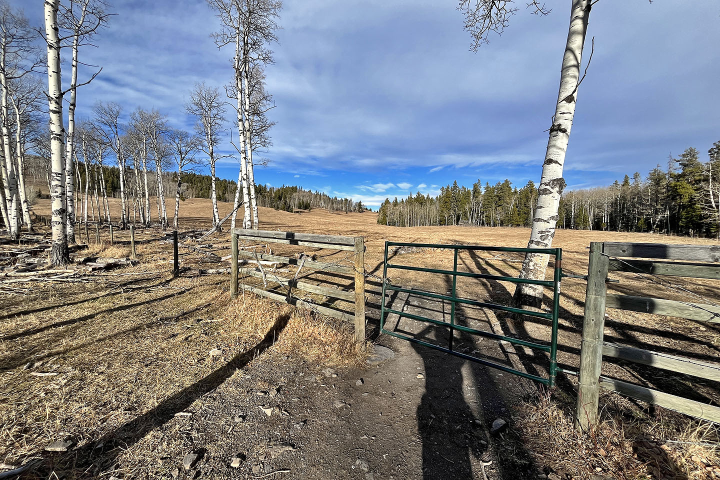 At the pass, we turned right and started up Foran Grade Ridge. The trail ascends a large meadow that offered the best views of the trip before we entered the woods. We climbed the trail to the ridge and soon reached the viewless summit. We continued down and passed a viewpoint where I took the panorama. As we descended, the grade eased, and we passed through an expansive meadow. At the far end, we went through a cattle gate less than 200 m from the parking lot.