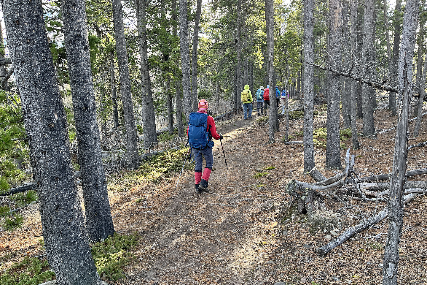 From the parking lot, we took a shortcut across a meadow to Windy Point Trail. After dropping first down, the trail gradually rose through meadows and thin forest. We stopped briefly at a viewpoint overlooking Sheep River before crossing the highway and continuing up the trail.