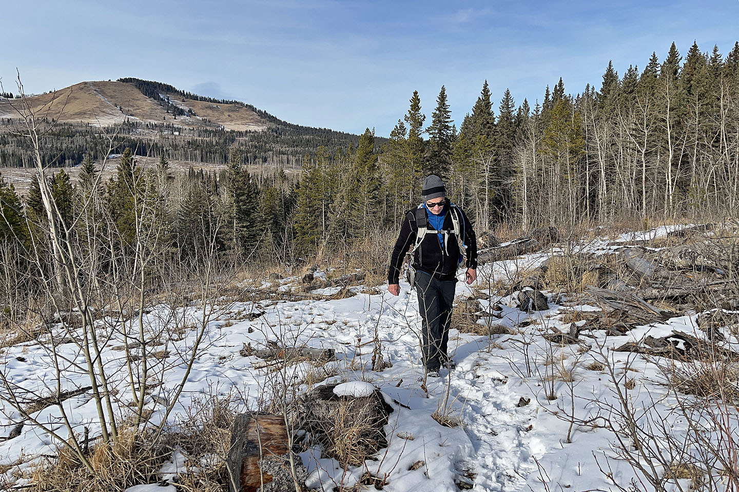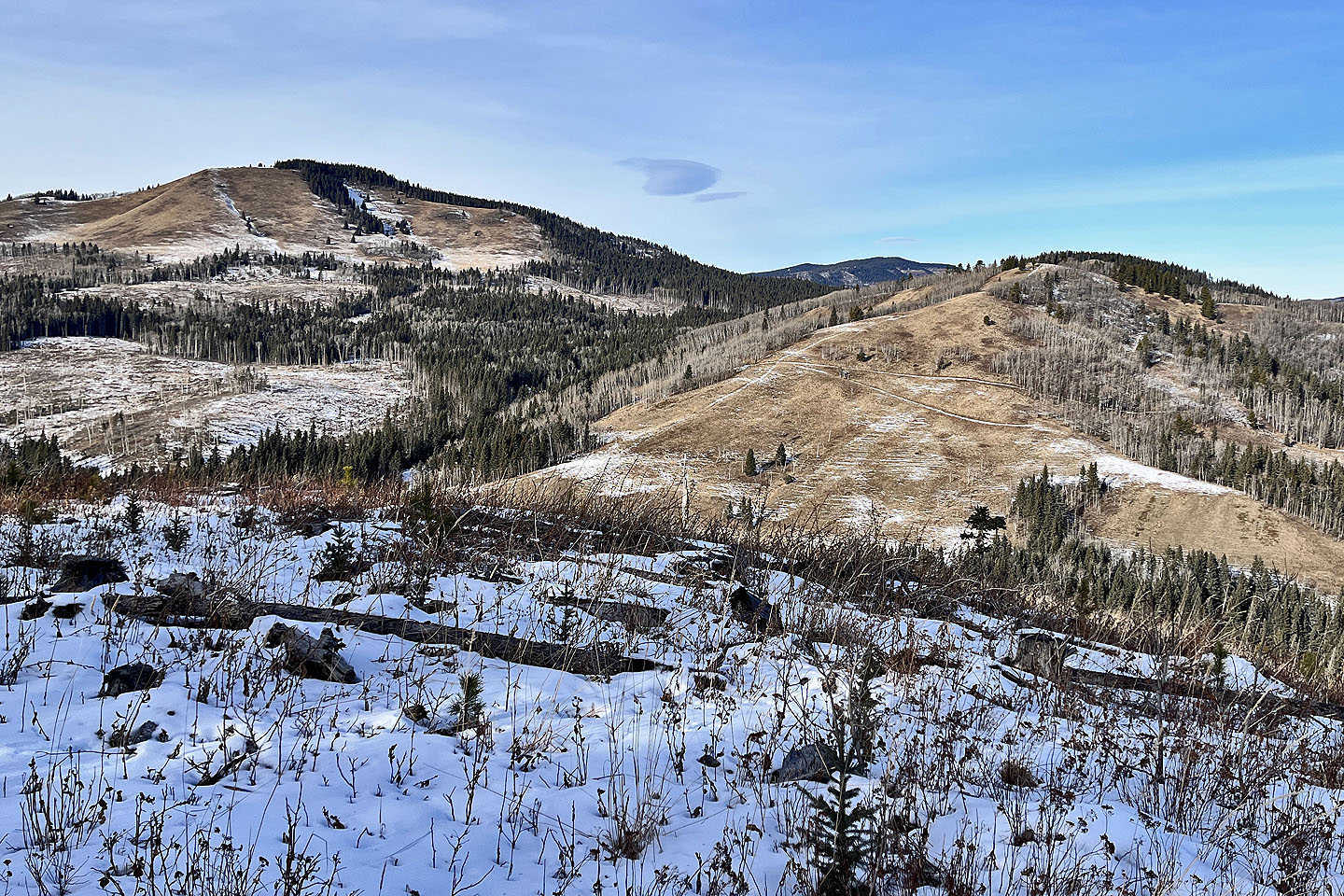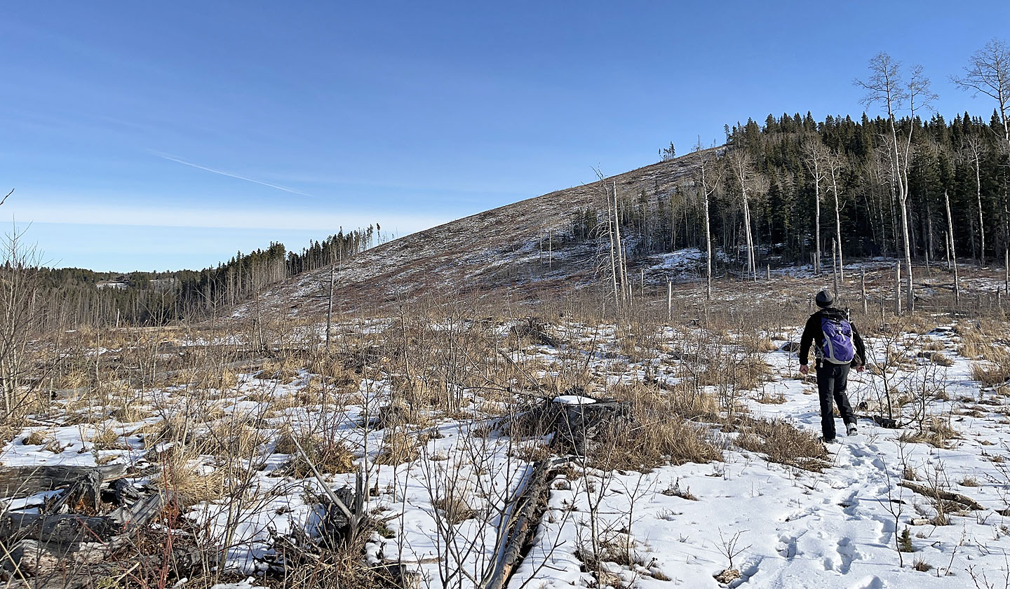 After parking at a gate, I walked up the well road. On an open rise 1.4 km from the gate, I turned onto Mesa Back Door Trail, which headed to the foot of Muffet’s Hill. The trail soon turned south and entered the forest. The trail climbs, but before it descended, I exited. I bushwhacked easily up the wooded slope and crossed a couple of glades. I kept left, knowing I would hit a cutblock that led to the summit. Muffet’s top is partially ringed with trees, but I had a fine view of Mesa Butte and Jack’s Hill. After looking around, I descended and returned to the trail.
