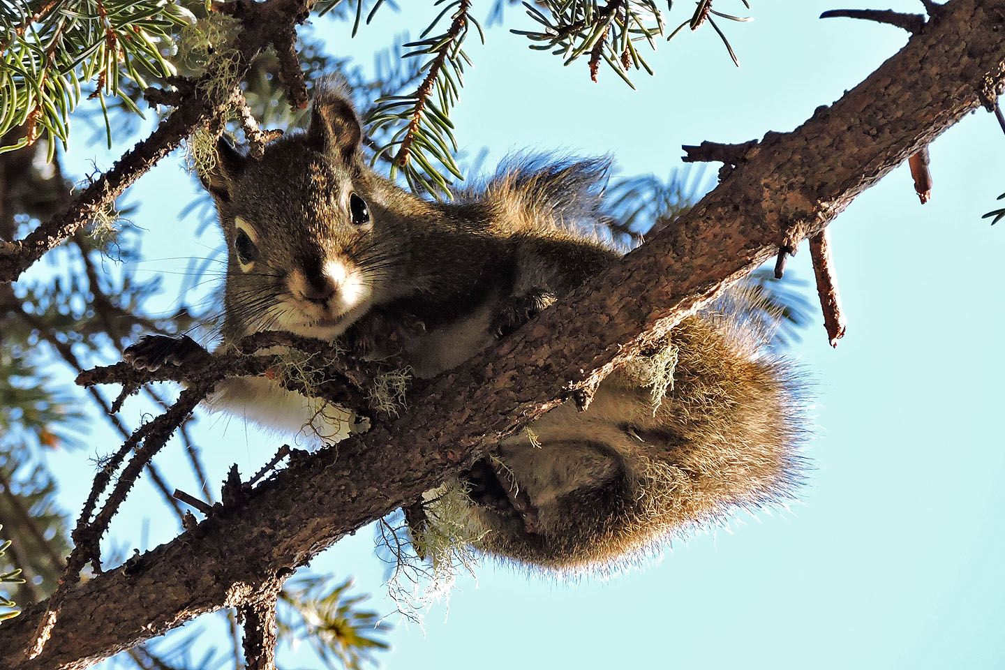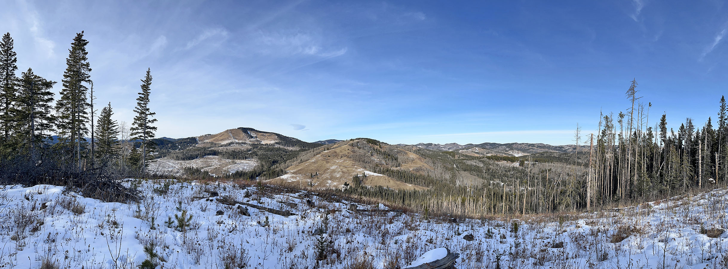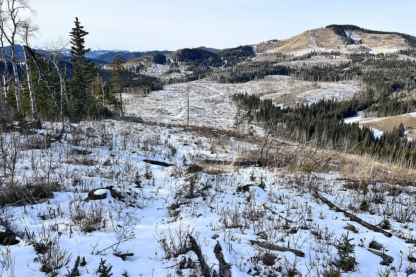 After parking at a gate, I walked up the well road. On an open rise 1.4 km from the gate, I turned onto Mesa Back Door Trail, which headed to the foot of Muffet’s Hill. The trail soon turned south and entered the forest. The trail climbs, but before it descended, I exited. I bushwhacked easily up the wooded slope and crossed a couple of glades. I kept left, knowing I would hit a cutblock that led to the summit. Muffet’s top is partially ringed with trees, but I had a fine view of Mesa Butte and Jack’s Hill. After looking around, I descended and returned to the trail.