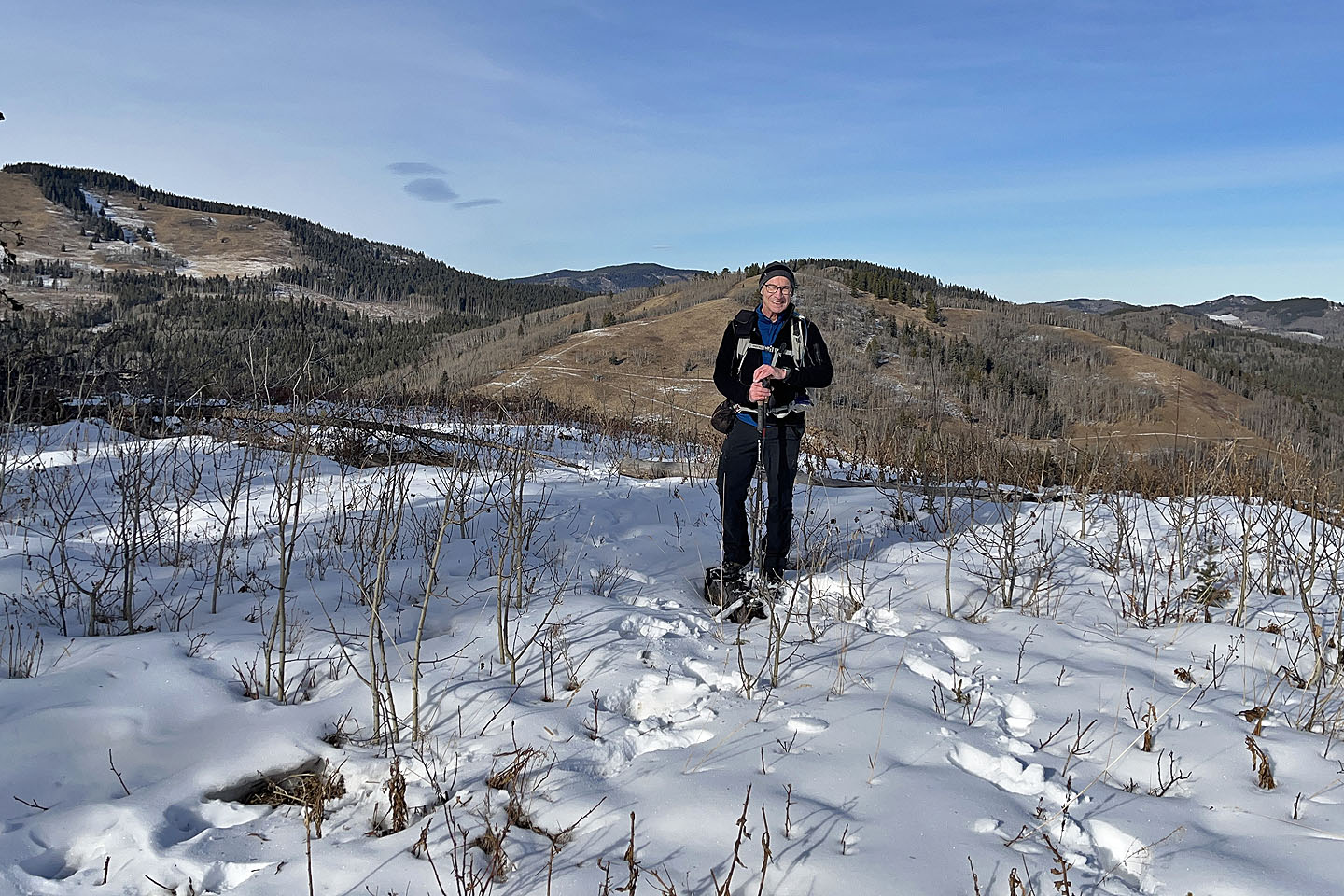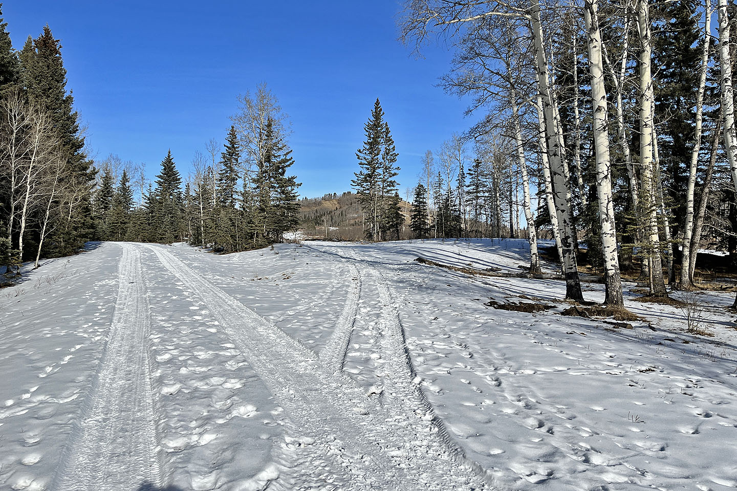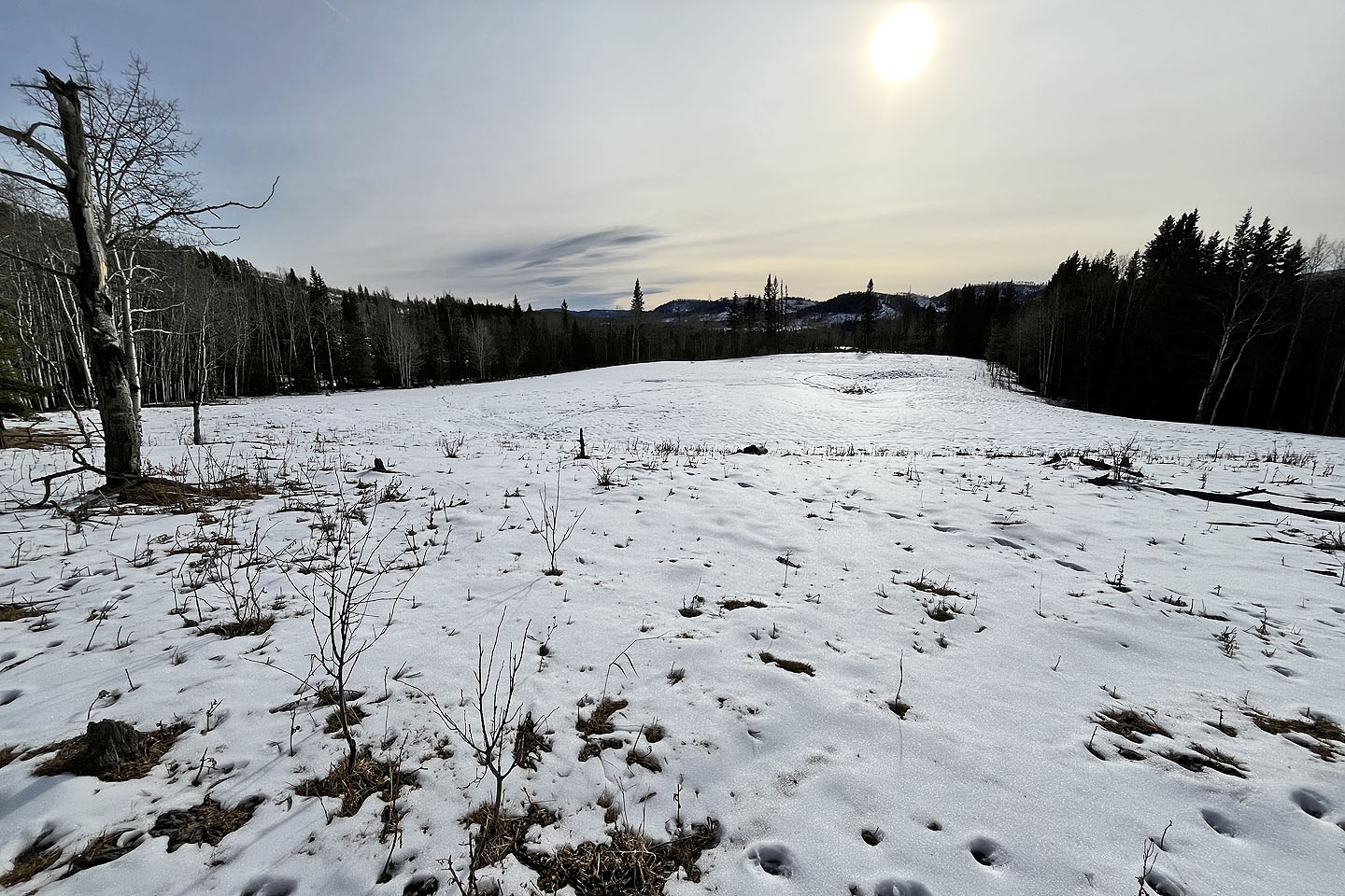 I continued south down the trail and passed a clearing with a view of Mesa Butte before re-entering the woods. Due to snow, the trail was difficult to follow in places, but flagging and footprints in the snow helped keep me on track. The trail exits the forest and crosses an immense meadow. At the end of the meadow, it merges with the well road 350 m from the gate. Muffet’s Hill is a nice, brief hike, but a longer trip could be made by adding Jack’s Hill.