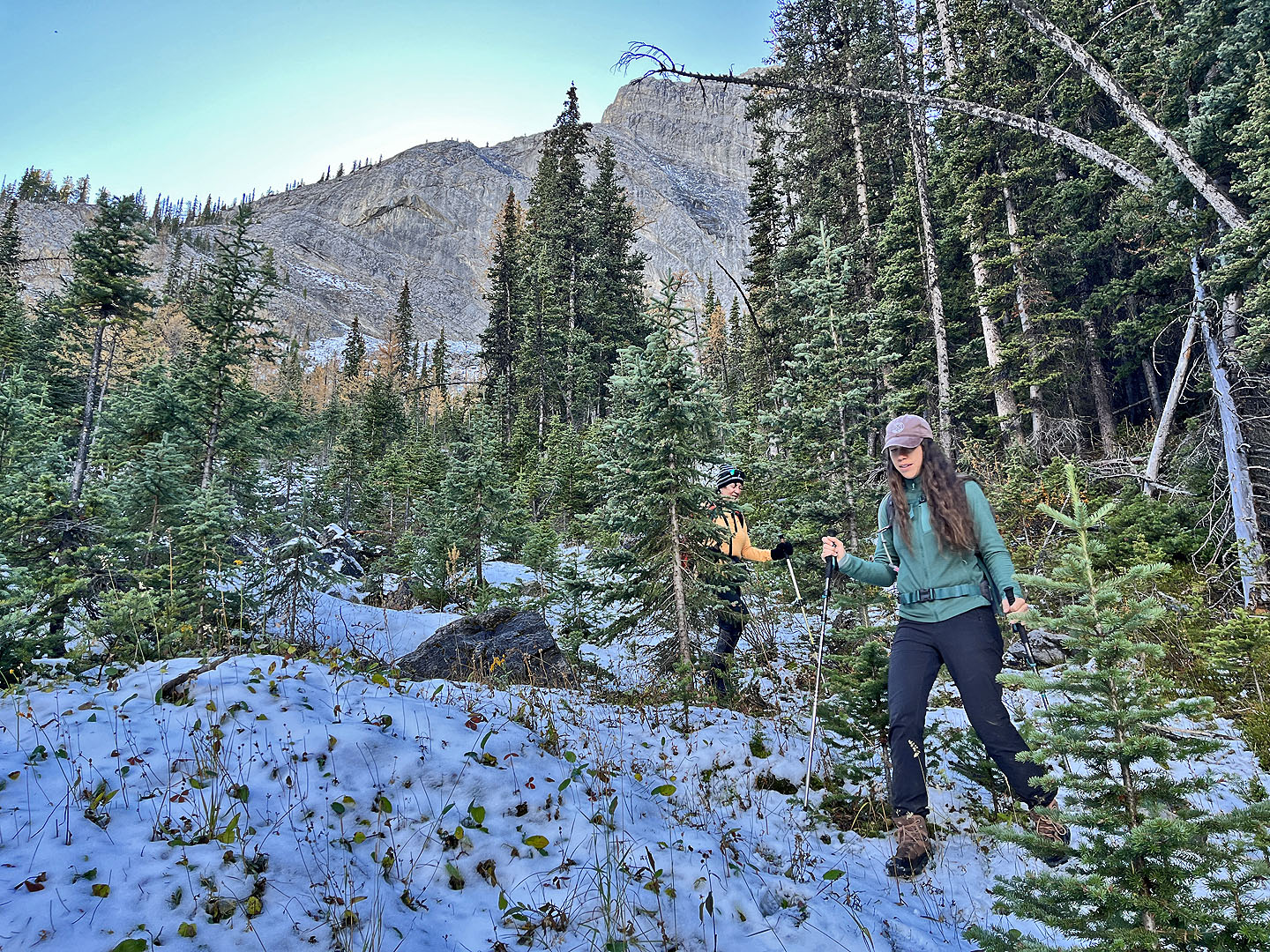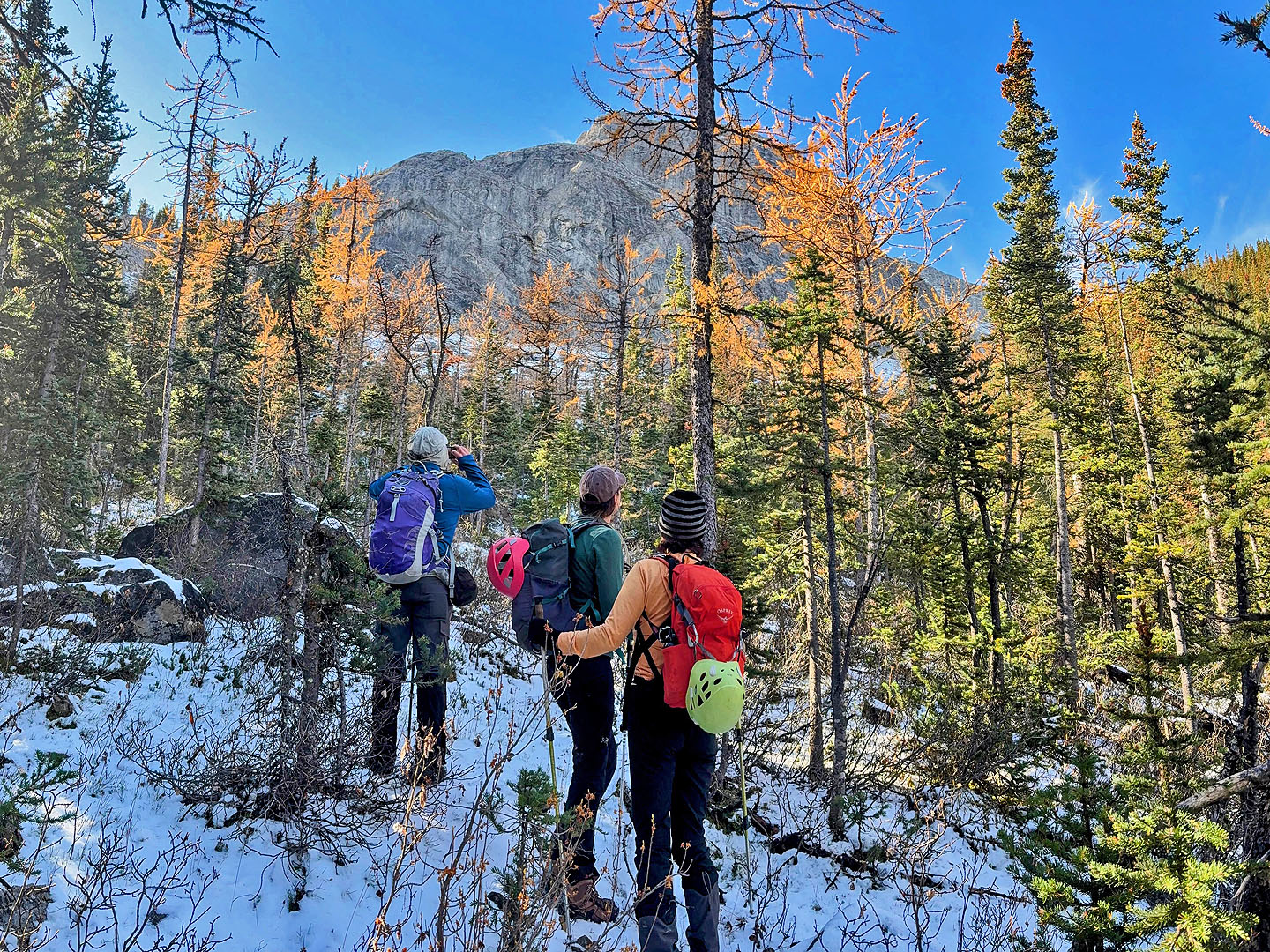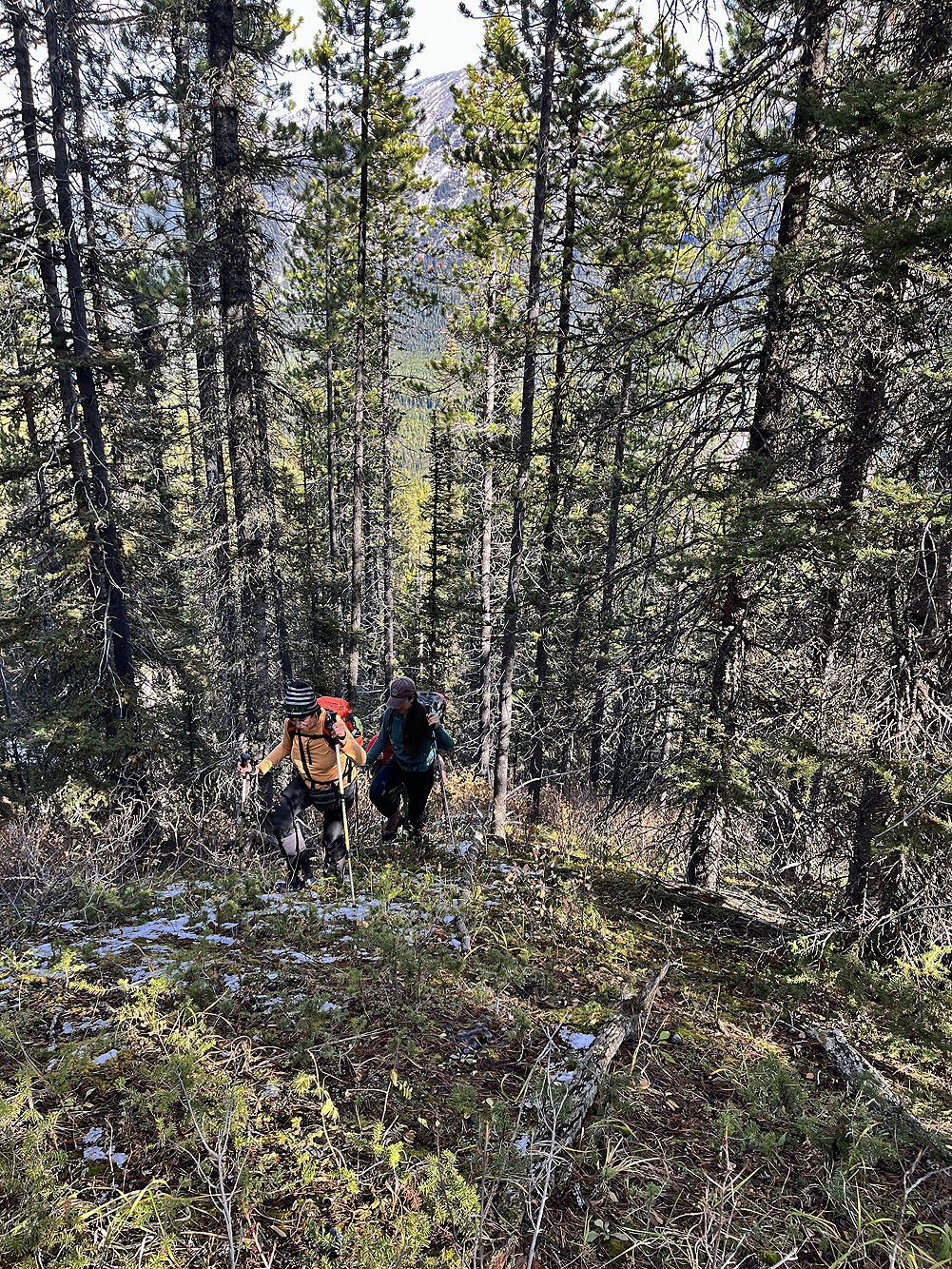 Strange to say, but when we stepped into the forest on that fall day, we didn’t have a clear destination, not from our unplanned starting point. We intended to start at Old Goat Glacier trailhead, unaware that the road there was closed for the season. We weren’t keen on walking up the road from the parking lot where we stopped, but maybe it was feasible to angle up the slope to reach our objective. Or perhaps we could change our goal to the tarn showing on the map. The terrain and bushwhacking would dictate our choice. With me were Doug, Rebecca and her daughter Ann.