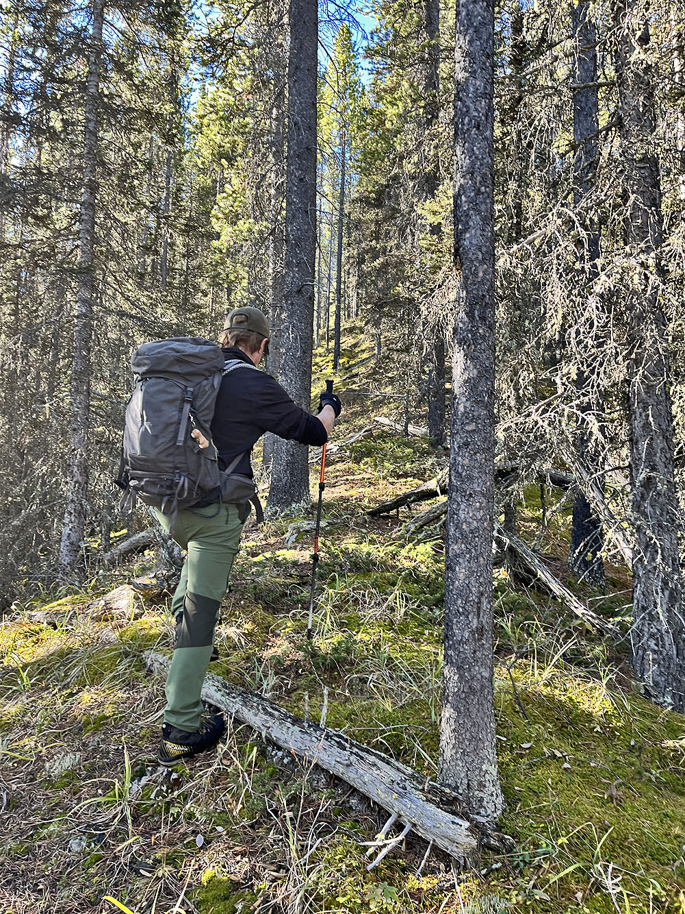 So we started up, angling left. We immediately came to a decommissioned corridor. It’s probably off-limits, but we merely crossed it. We continued angling up when we noticed a thin corridor in the trees. After following it, it resolved into a well-defined, lightly wooded ridge. When it petered out, we crossed over to another good ridge on our left. We were heading to the tarn.