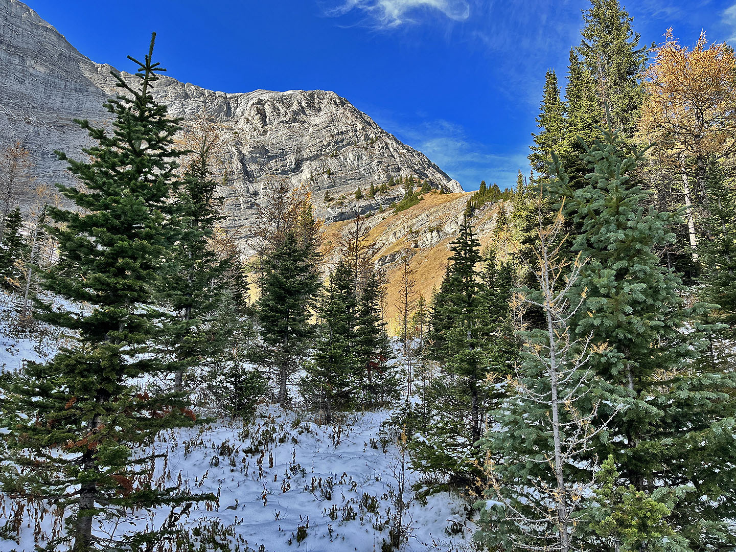 From a rocky ridge above a frozen tarn in a deep cirque, we viewed a knoll tantalisingly close. We hiked up a glade and passed through trees following a goat track. The path led to a low cliff band which we easily scrambled over. Then we hiked up a steep, grassy slope to the summit. Goat Pond and Spray Lakes Reservoir spread out below us, while familiar mountains rose above them. A fire pit indicated we weren’t the first to reach the top of what we called Old Goat Knoll.