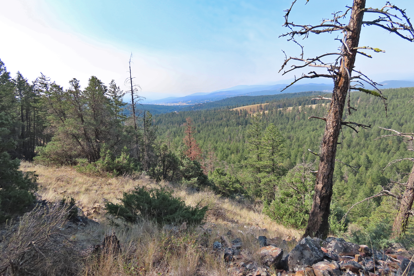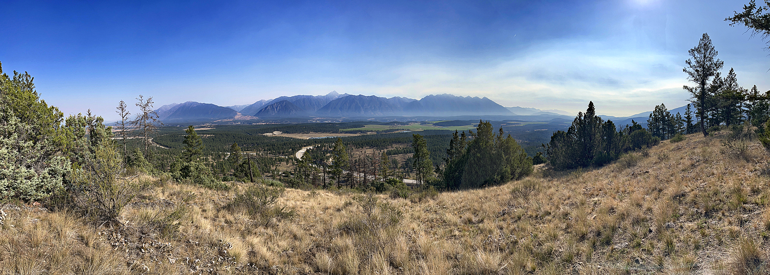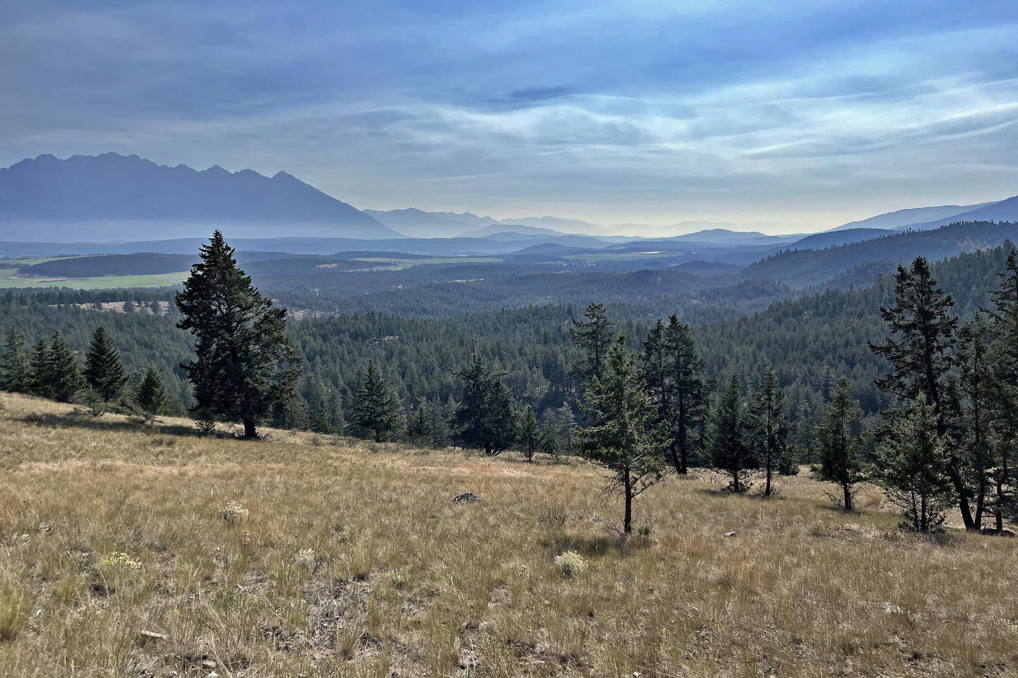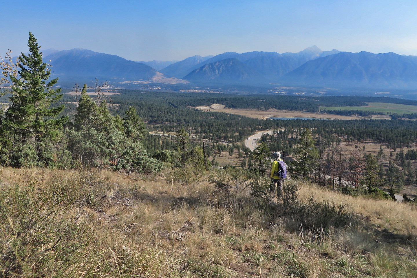 Just a few minutes’ drive east of Cranbrook, Eager Hills Lookout offers a short hike with worthwhile views. However, it was a bad day for viewing the mountains, but a good day to avoid a long hike. Wildfire smoke had enveloped the area, obscuring views and irritating our eyes. But despite the conditions, Dinah and I enjoyed the area and extended our trip by completing a loop.