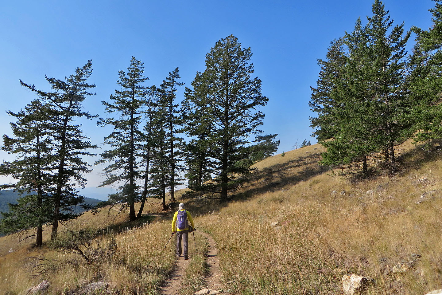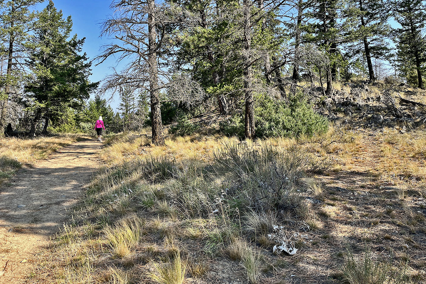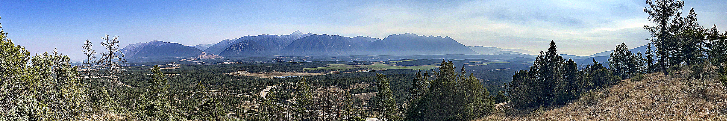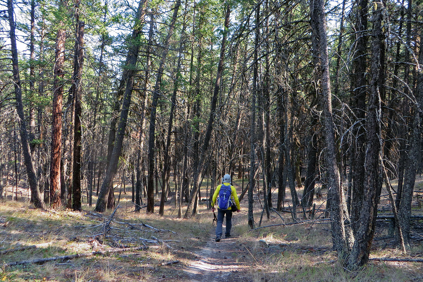 Just a few minutes’ drive east of Cranbrook, Eager Hills Lookout offers a short hike with worthwhile views. However, it was a bad day for viewing the mountains, but a good day to avoid a long hike. Wildfire smoke had enveloped the area, obscuring views and irritating our eyes. But despite the conditions, Dinah and I enjoyed the area and extended our trip by completing a loop.