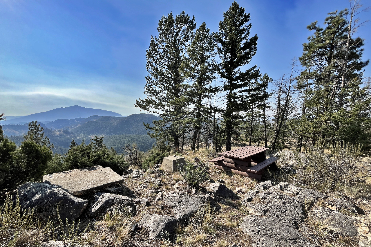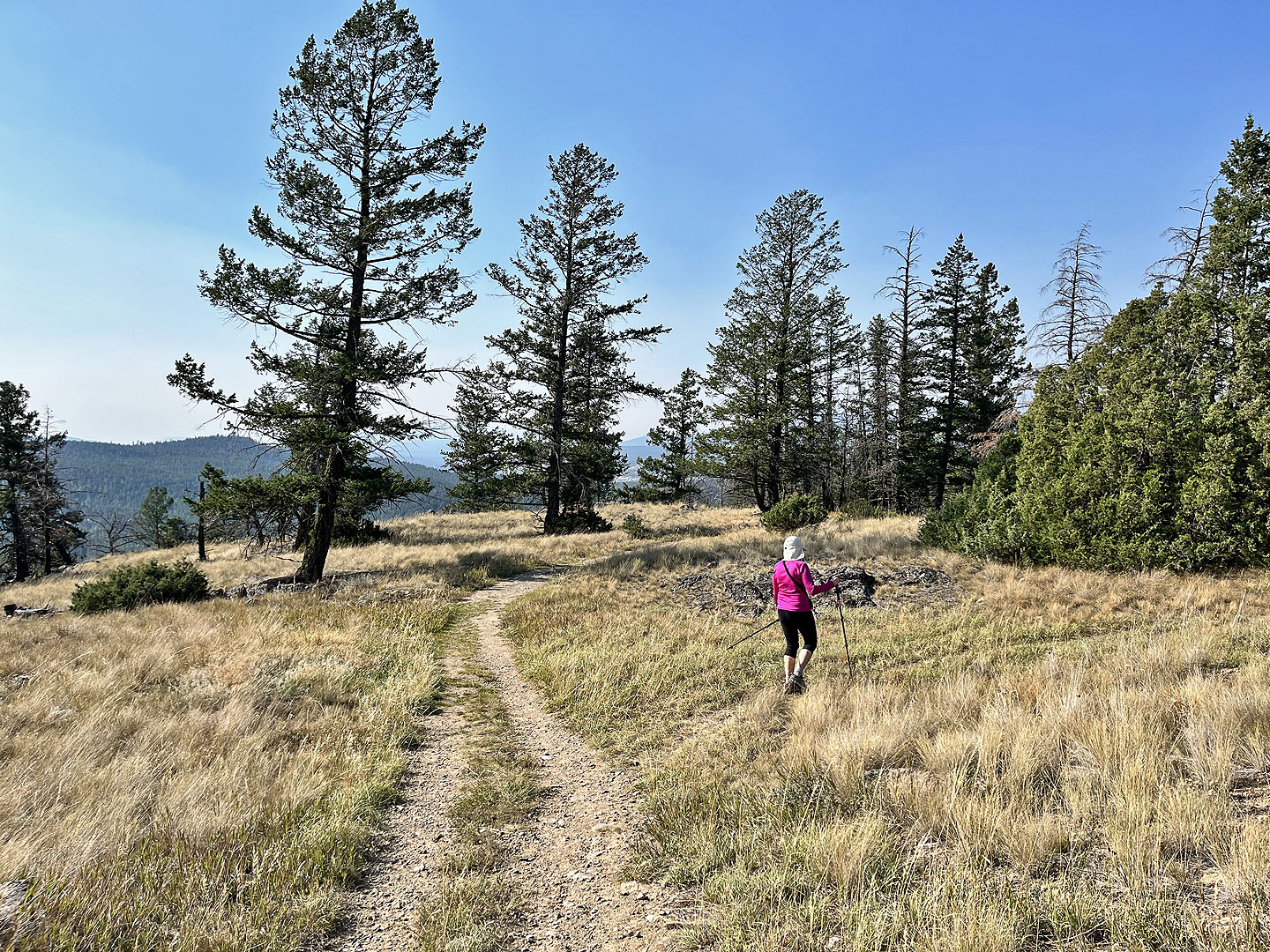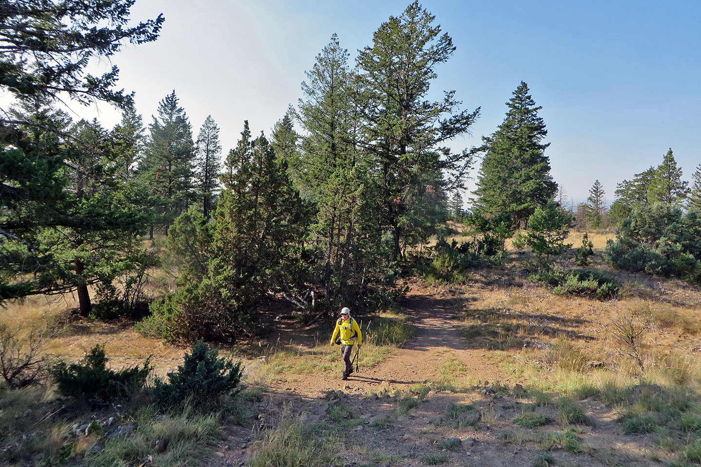 The hike begins on a long, gentle switchback up a grassy slope scattered with tall trees. The trail levels off on a broad top with a few high points. The first of these is Eager Fire Lookout at the southwest end. Then we continued along the trail to the northeast end where there’s a picnic table. Maps place the summit here, where I took my panorama. But afterwards, we wandered over to a slight mound that was higher.