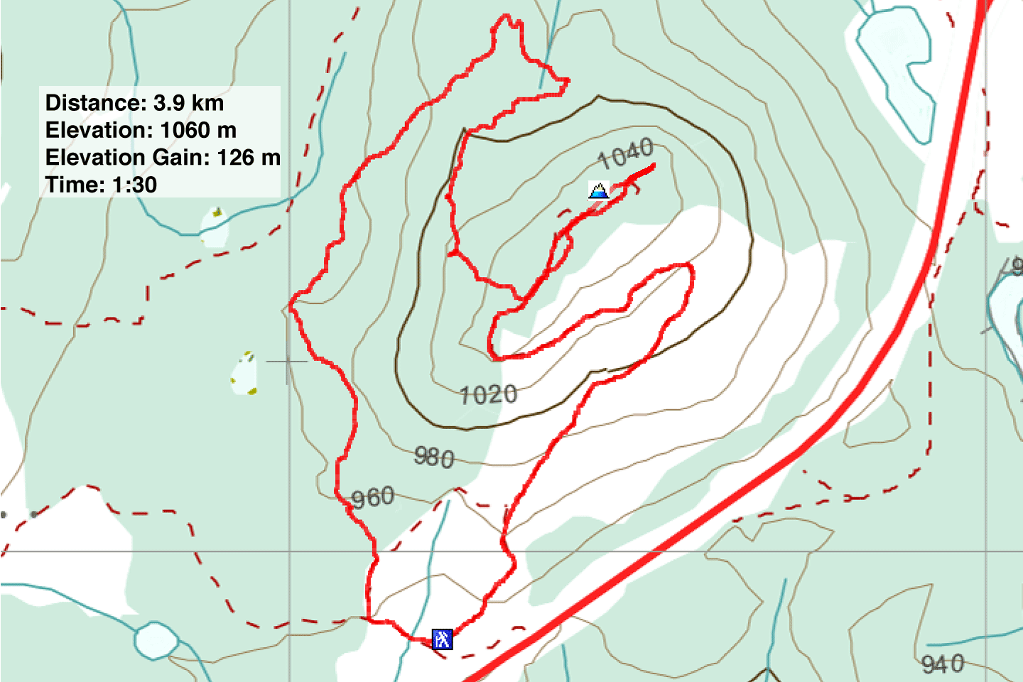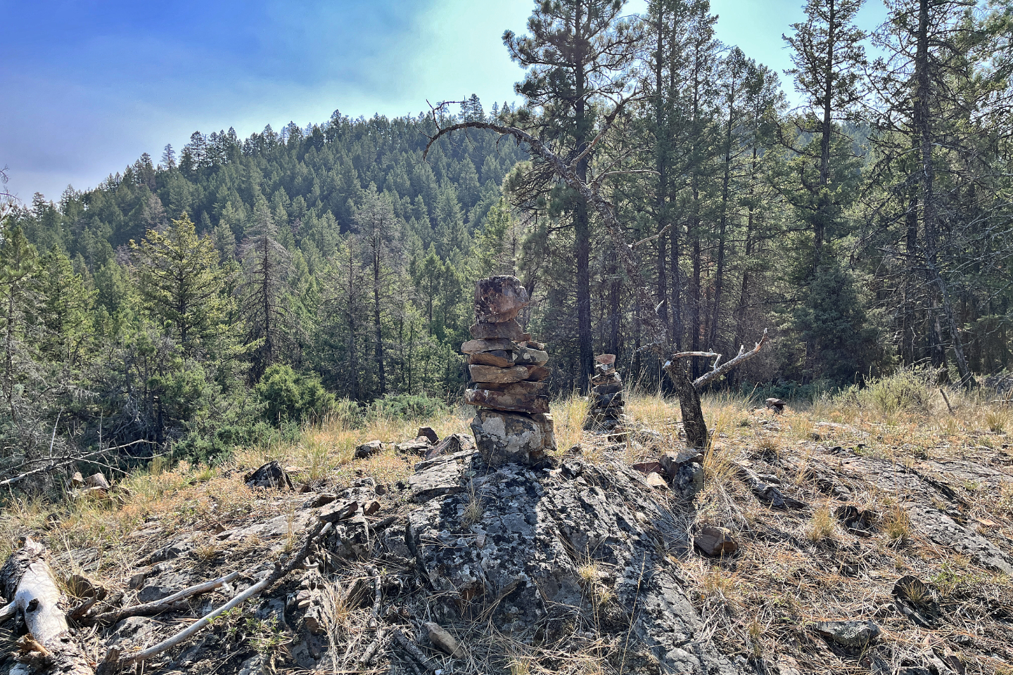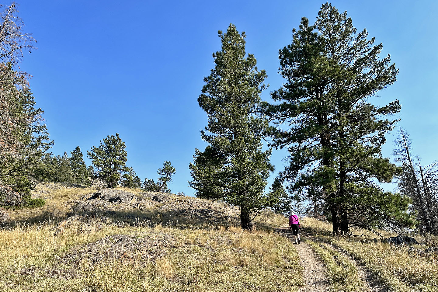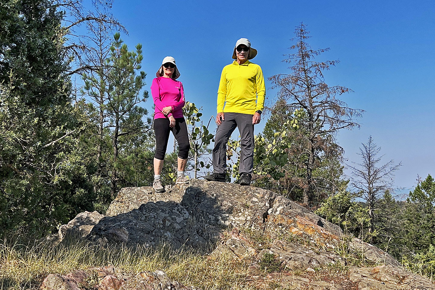 The hike begins on a long, gentle switchback up a grassy slope scattered with tall trees. The trail levels off on a broad top with a few high points. The first of these is Eager Fire Lookout at the southwest end. Then we continued along the trail to the northeast end where there’s a picnic table. Maps place the summit here, where I took my panorama. But afterwards, we wandered over to a slight mound that was higher.