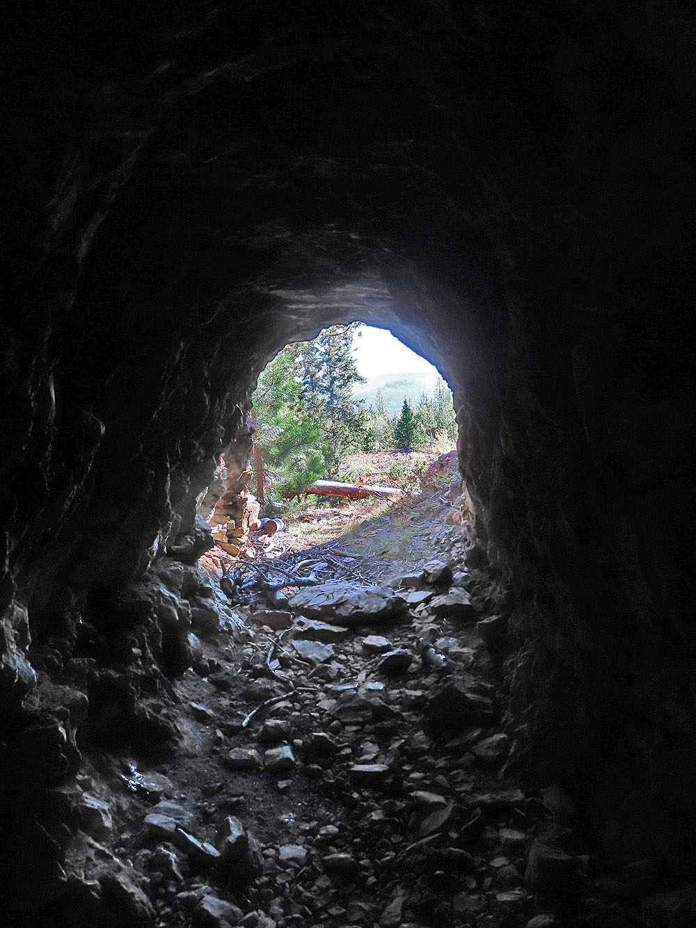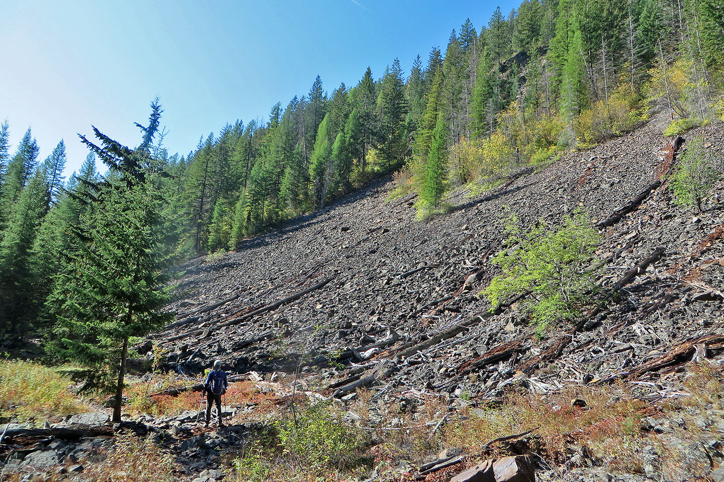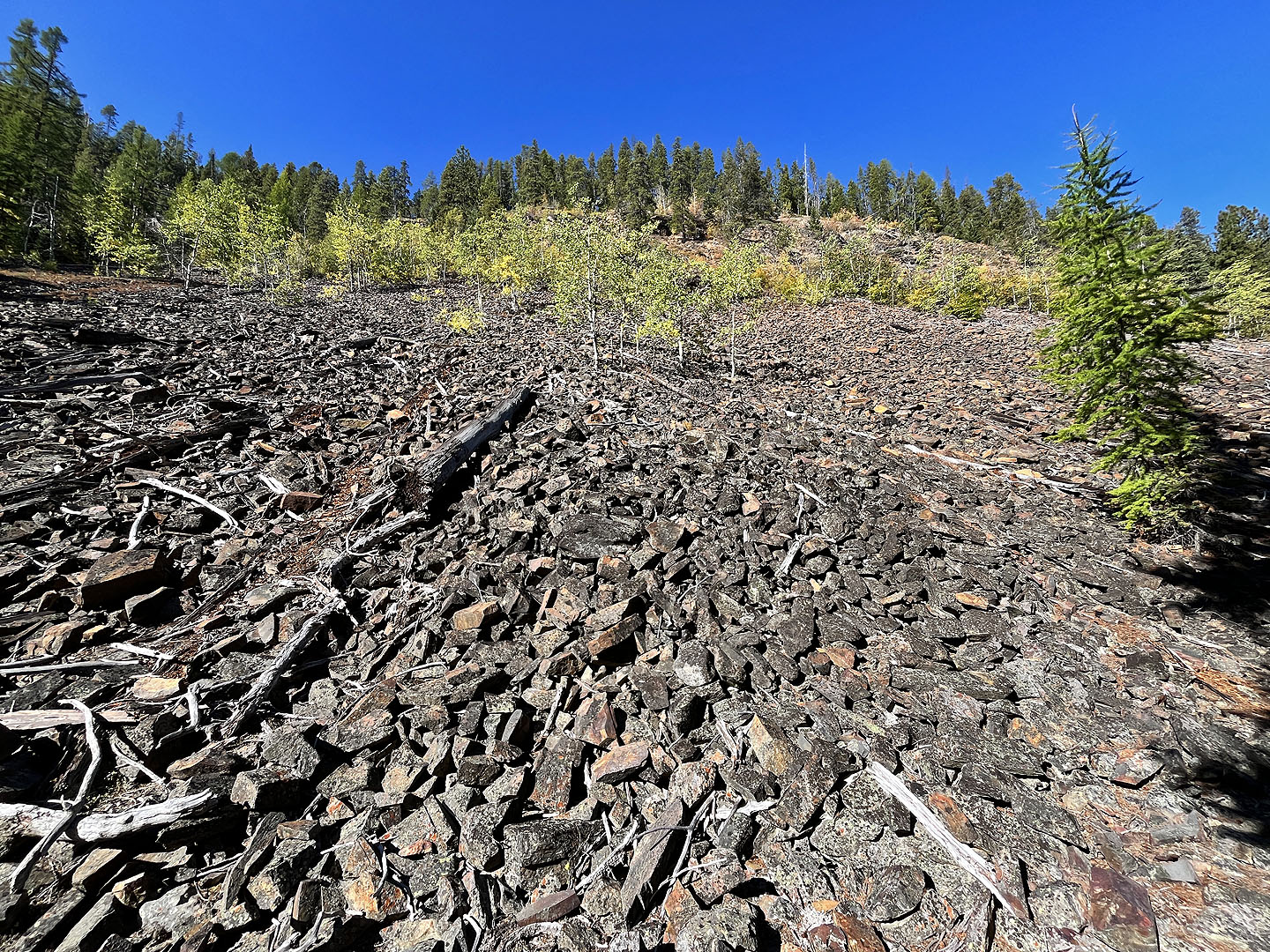 We followed the canyon trail as it climbed and then dropped down. We hiked through a forest punctuated with interesting clearings with steep talus slopes. At the end of the canyon, we made a sharp left onto Magic Line and began ascending the ridge. We had no views as we climbed nor when we traversed the top. Only on the descent were there breaks in the forest where we had limited views to the north. Also on the descent, the path became a wide mountain bike trail with undulations and banked corners. Undoubtedly, mountain bikers would be racing down here, but fortunately, we didn’t encounter any. We reached the end of the loop and returned on the hiking trail we started up.