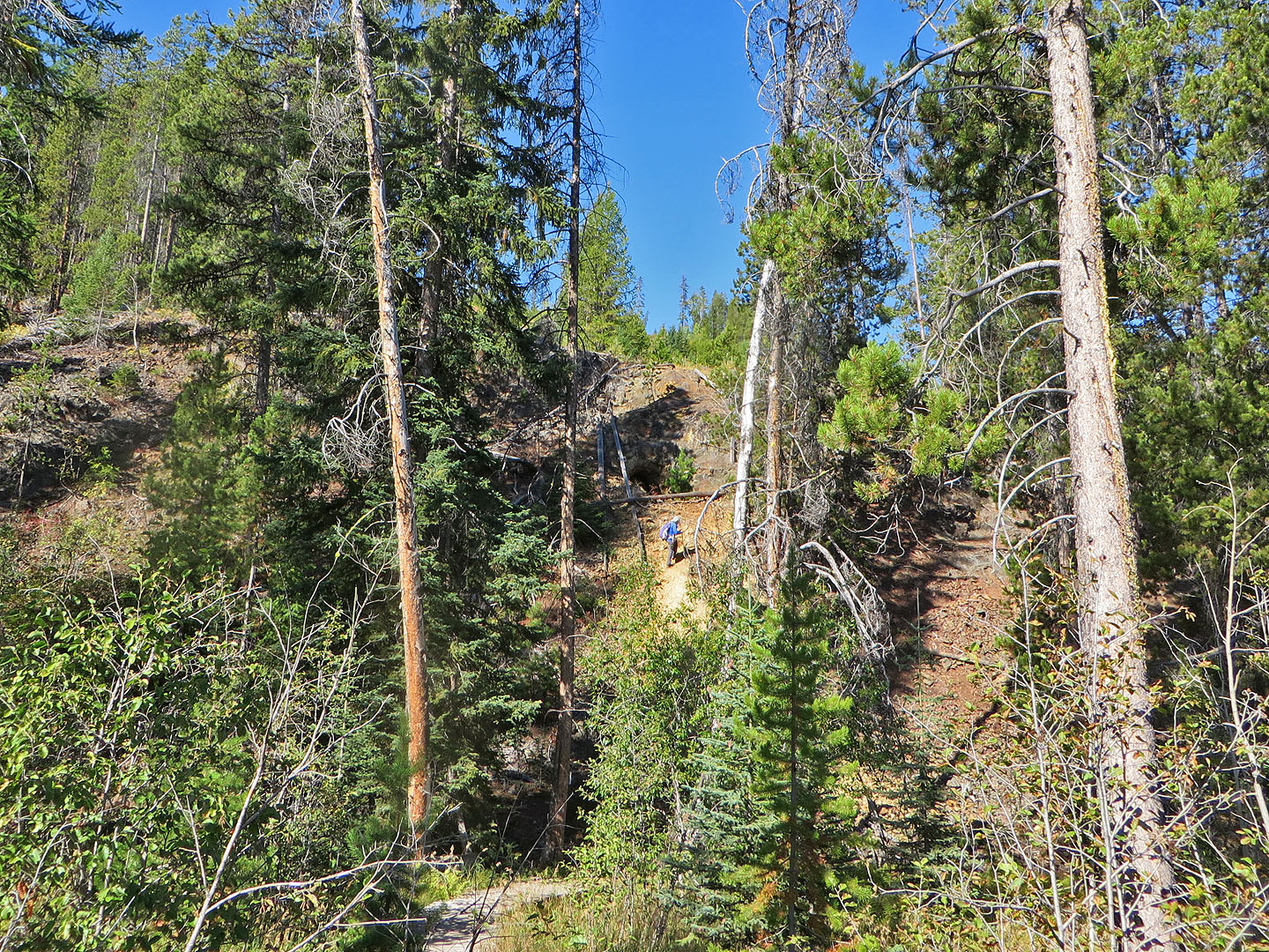 Coming up to the canyon. In the shadow above the yellow path is a cave.
