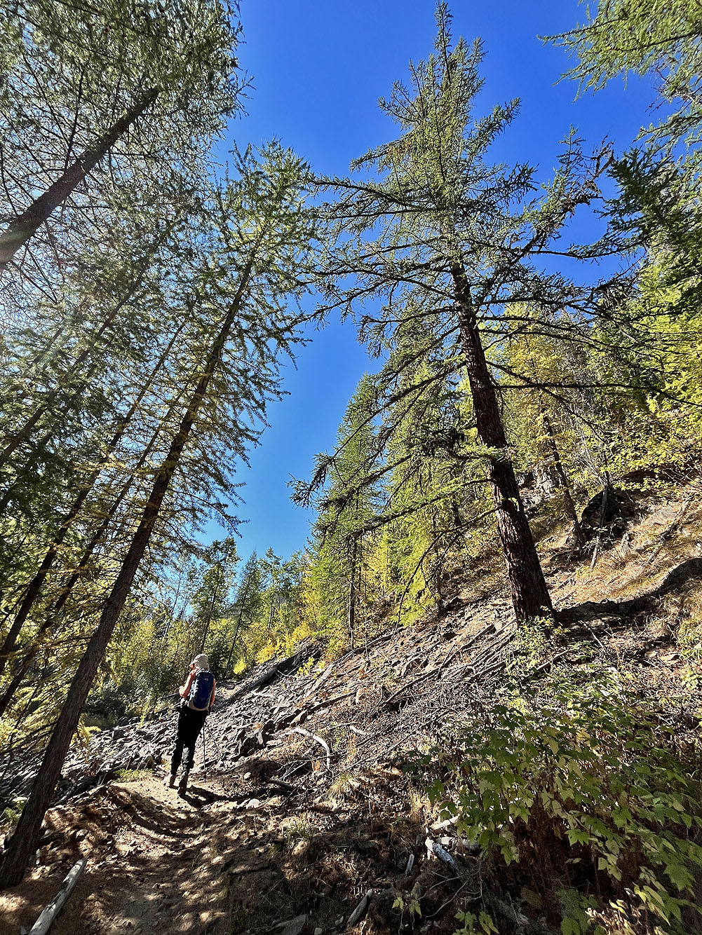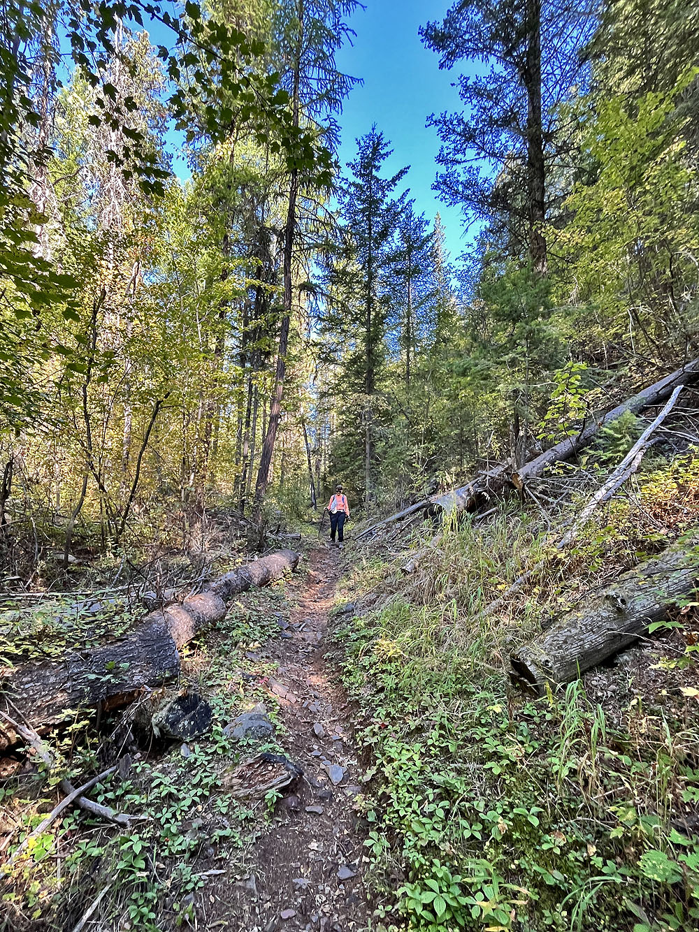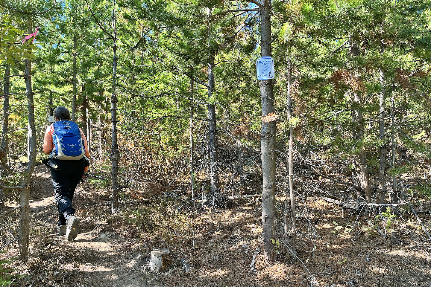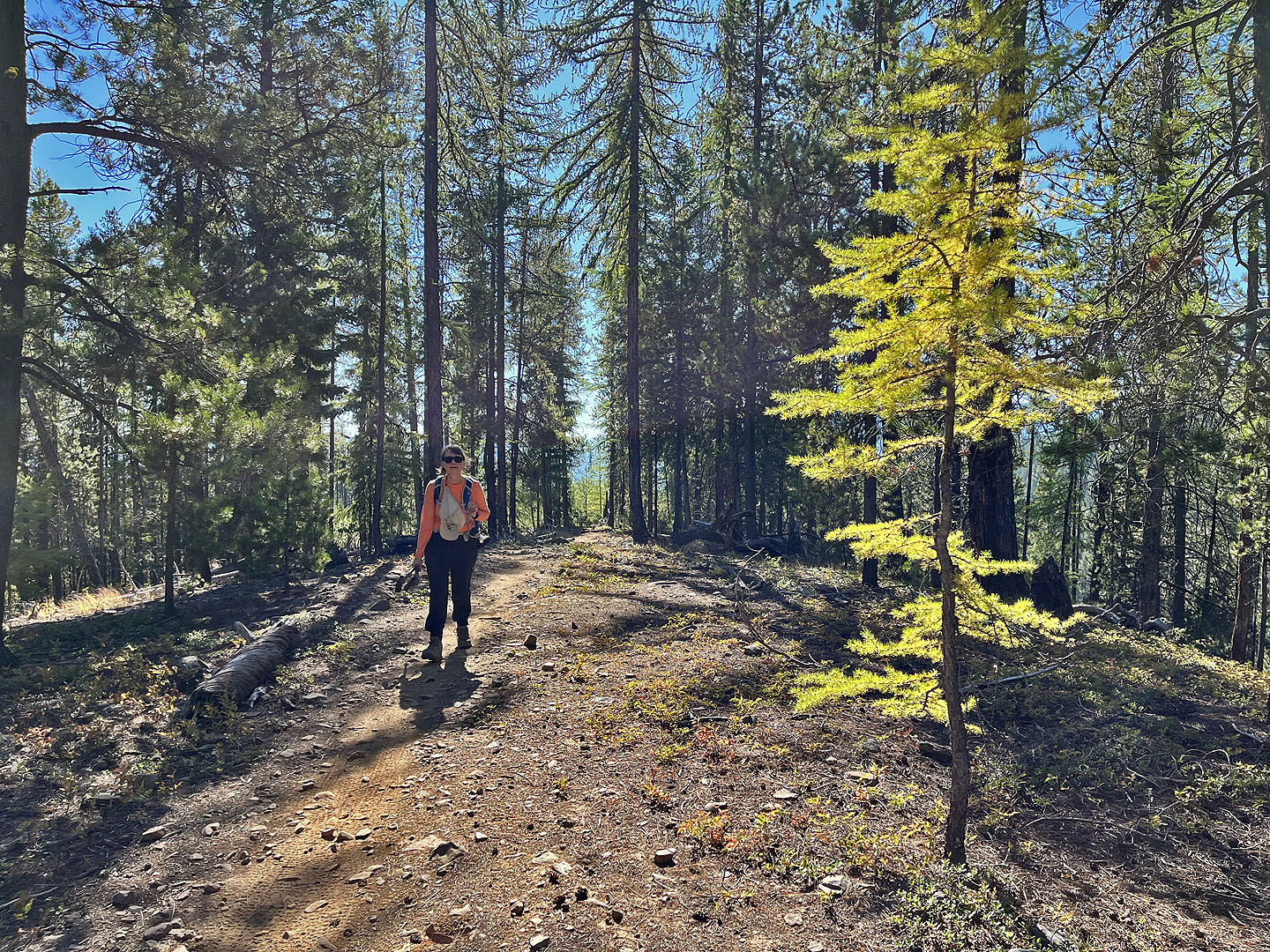 Hoping to see larches turning yellow, Dinah and I headed to the Nordic Centre west of Kimberley. Among the trails, two stood out: Moe’s Canyon and Magic Line. We planned a loop through the canyon and over an unnamed ridge. Unfortunately, we were too early to see the larches in their splendour, and trees prevented remarkable views from the ridge.