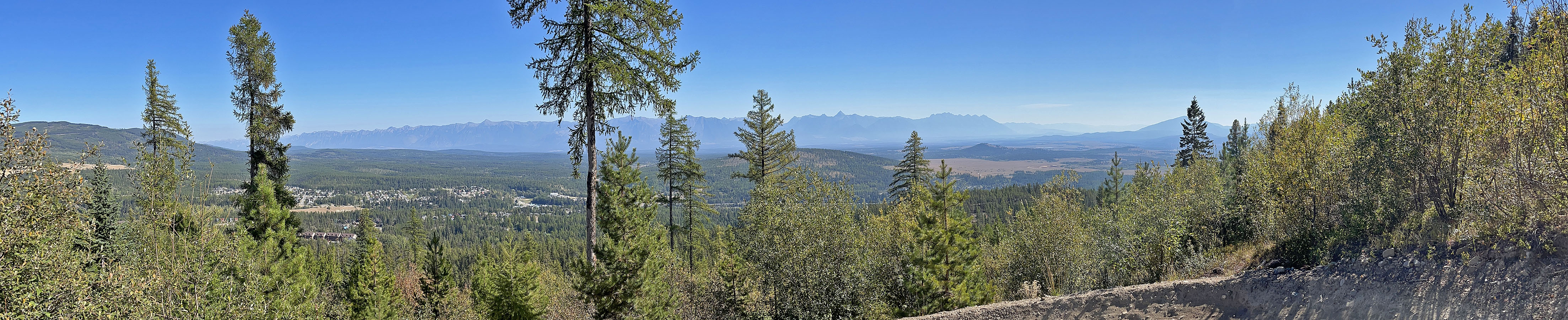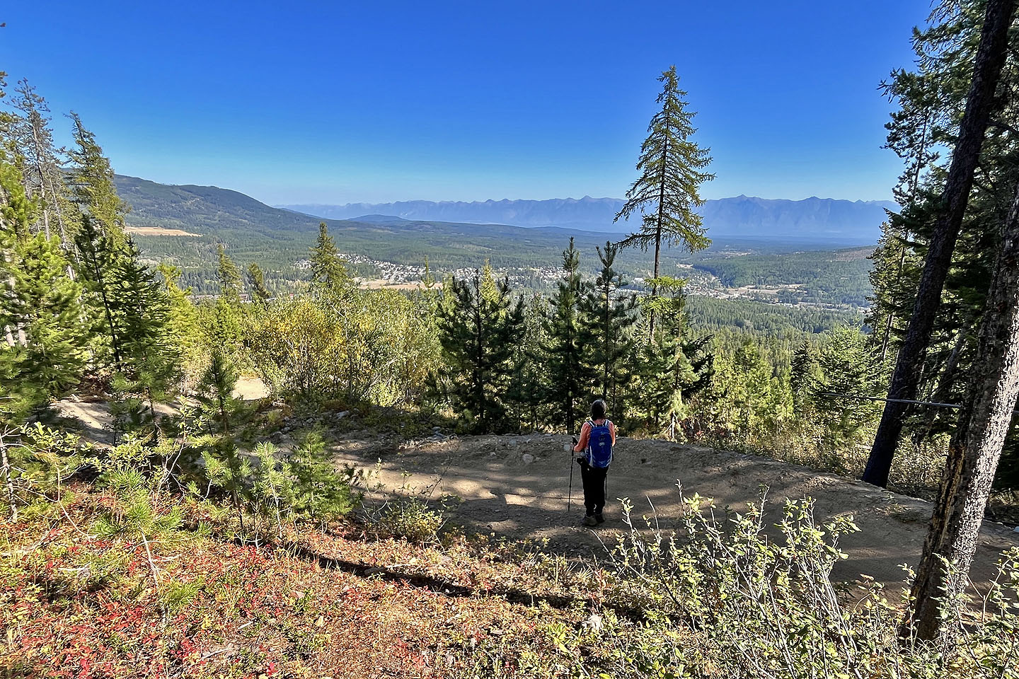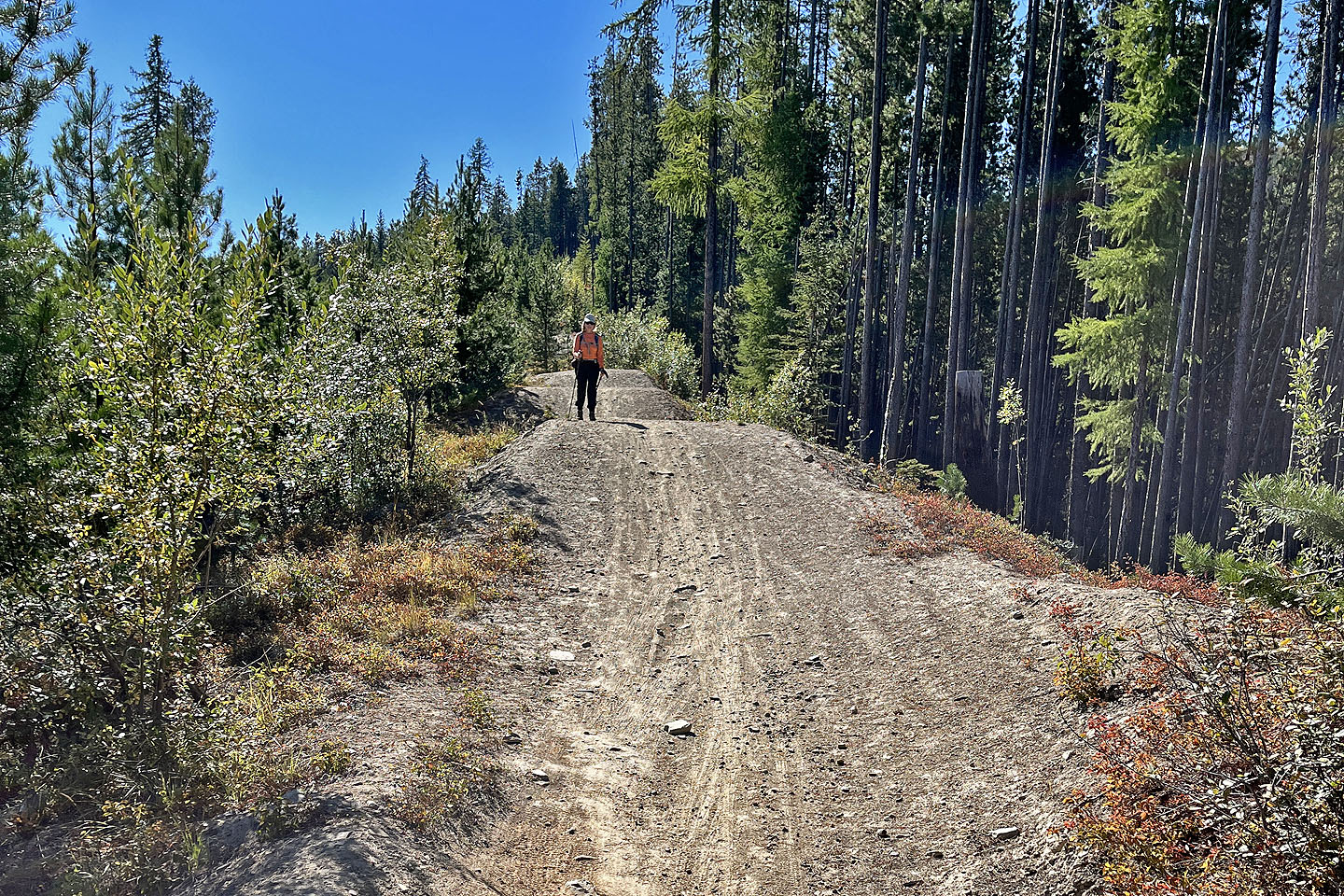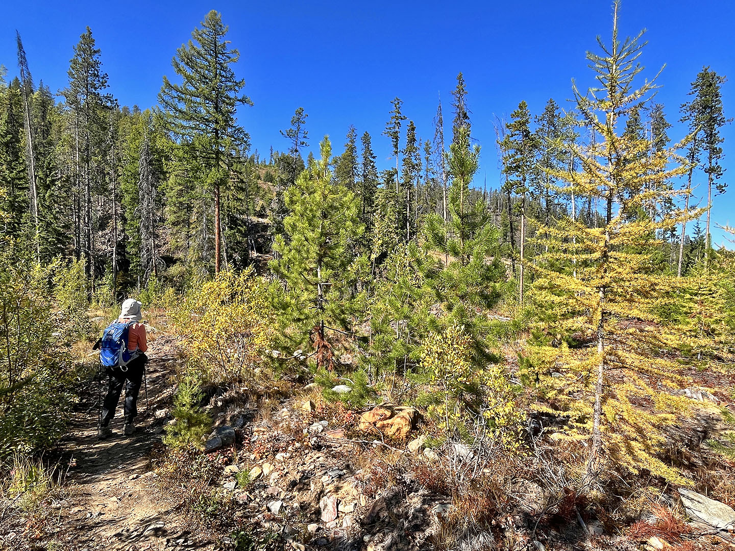 Hoping to see larches turning yellow, Dinah and I headed to the Nordic Centre west of Kimberley. Among the trails, two stood out: Moe’s Canyon and Magic Line. We planned a loop through the canyon and over an unnamed ridge. Unfortunately, we were too early to see the larches in their splendour, and trees prevented remarkable views from the ridge.