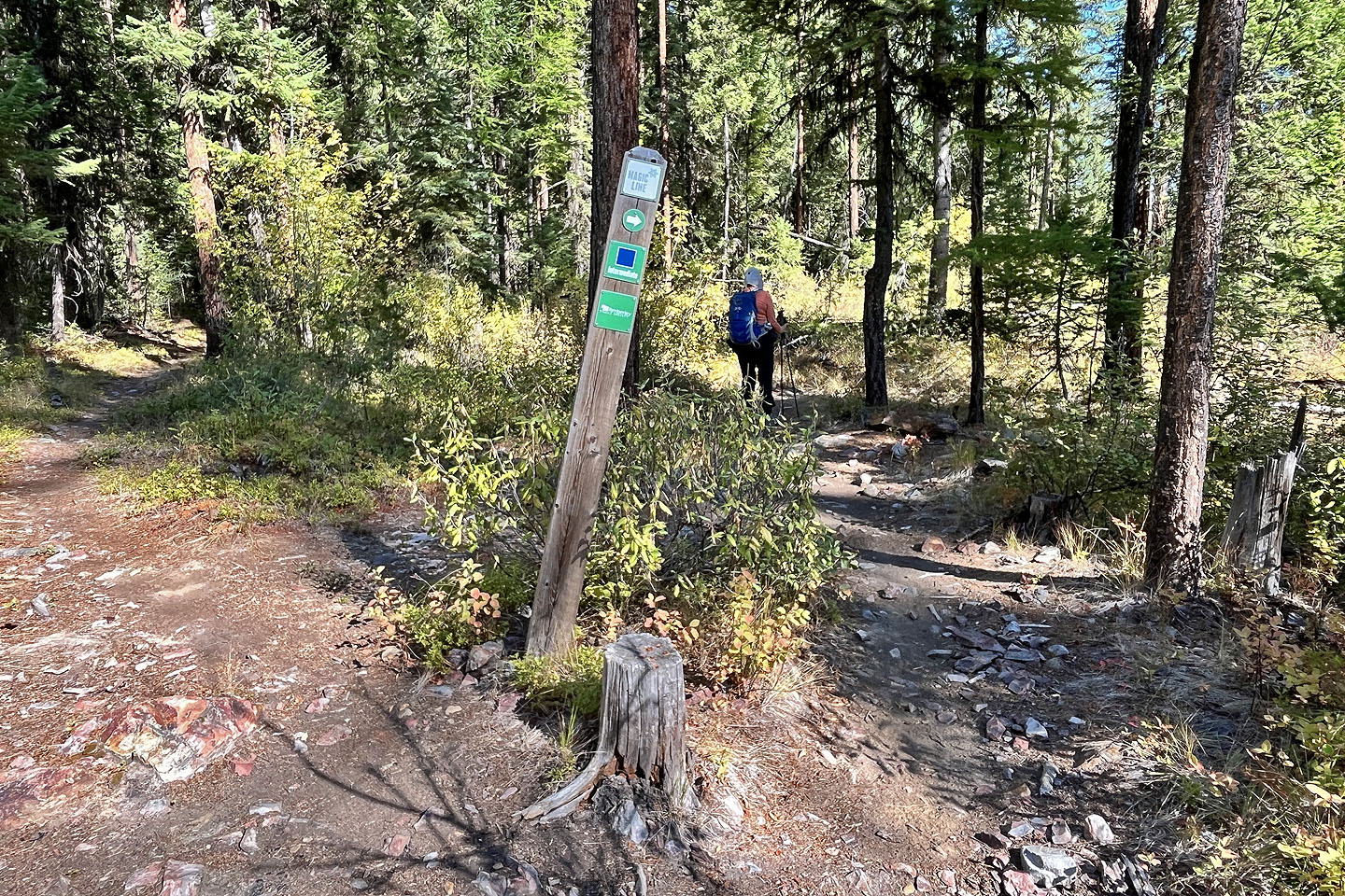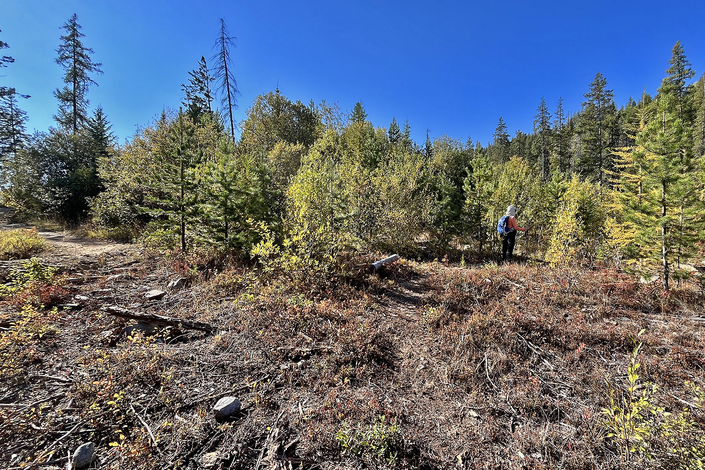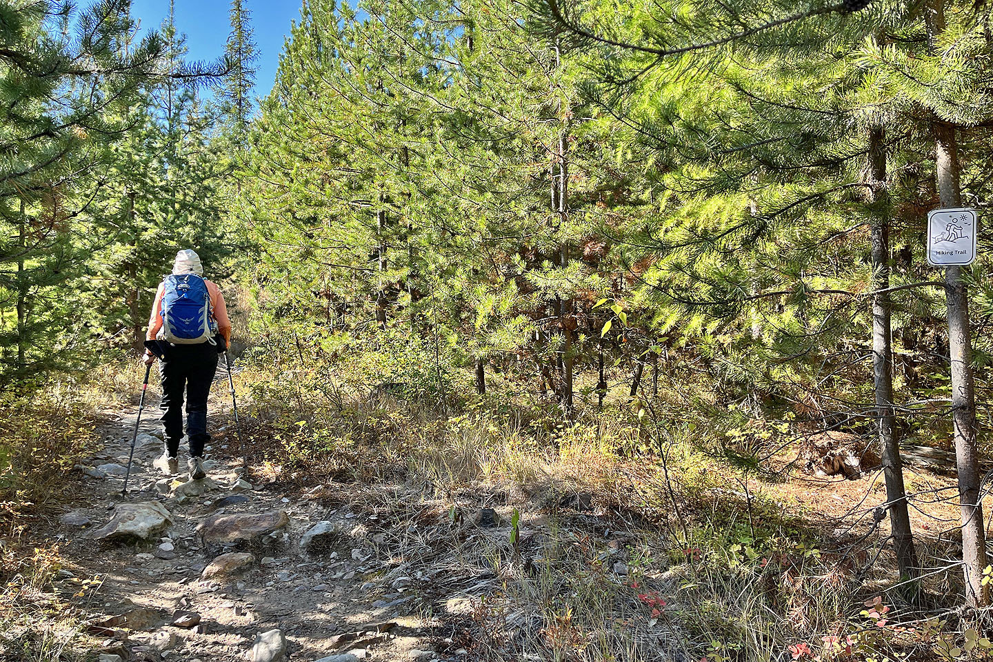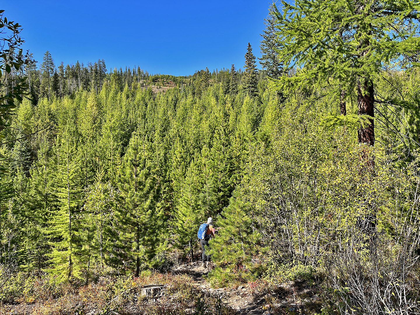Hoping to see larches turning yellow, Dinah and I headed to the Nordic Centre west of Kimberley. Among the trails, two stood out: Moe’s Canyon and Magic Line. We planned a loop through the canyon and over an unnamed ridge. Unfortunately, we were too early to see the larches in their splendour, and trees prevented remarkable views from the ridge.