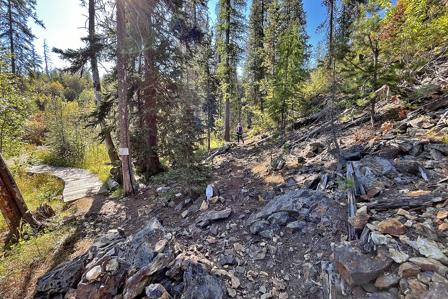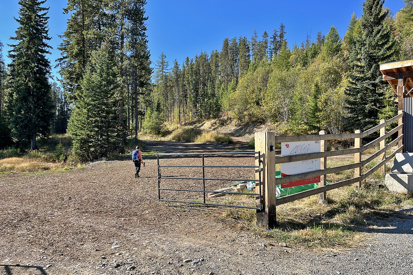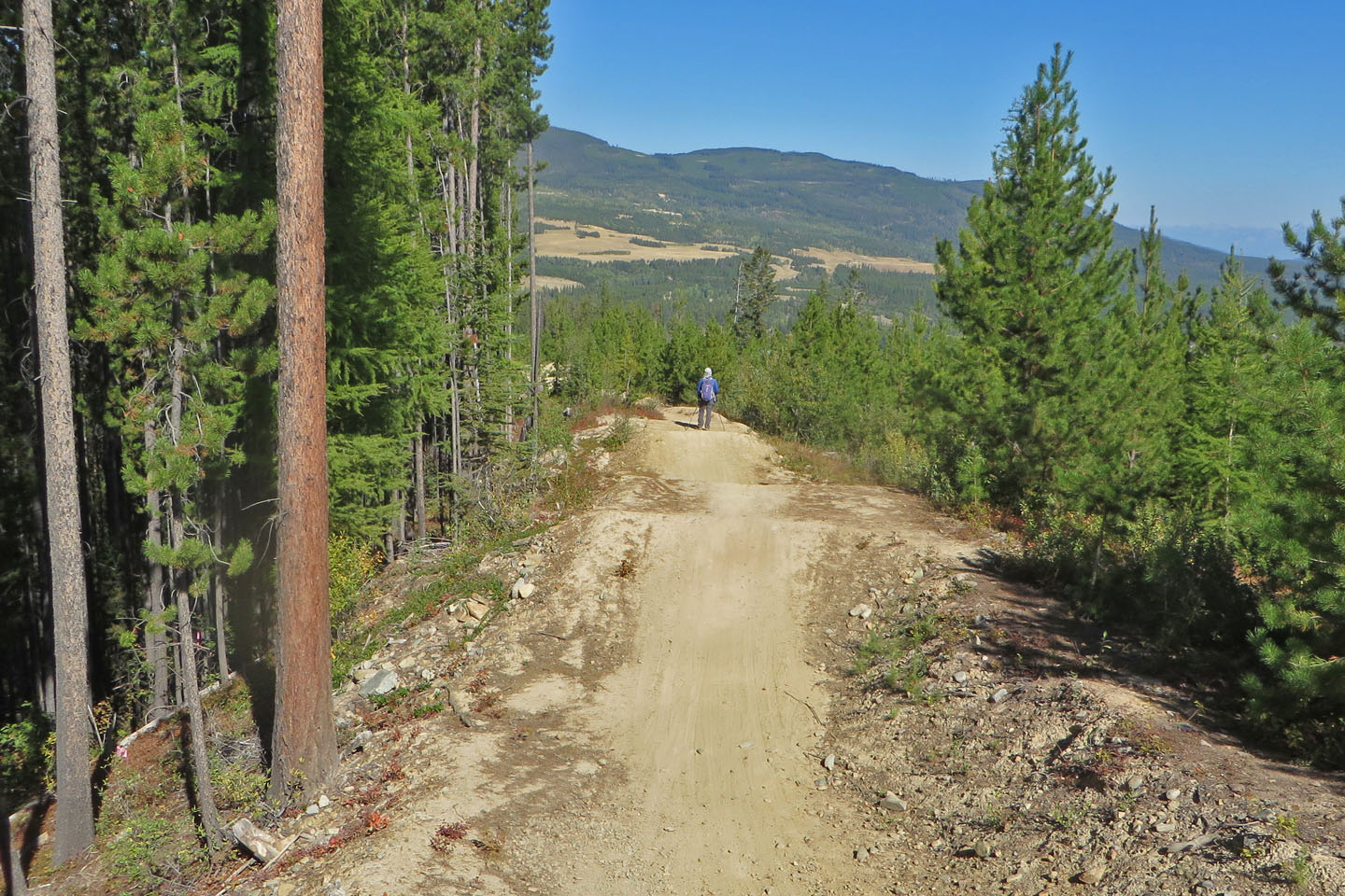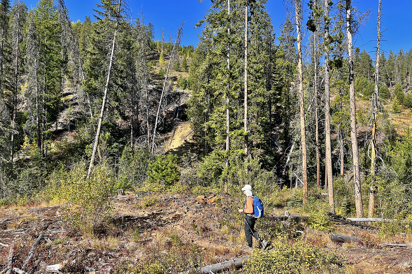 Hoping to see larches turning yellow, Dinah and I headed to the Nordic Centre west of Kimberley. Among the trails, two stood out: Moe’s Canyon and Magic Line. We planned a loop through the canyon and over an unnamed ridge. Unfortunately, we were too early to see the larches in their splendour, and trees prevented remarkable views from the ridge.