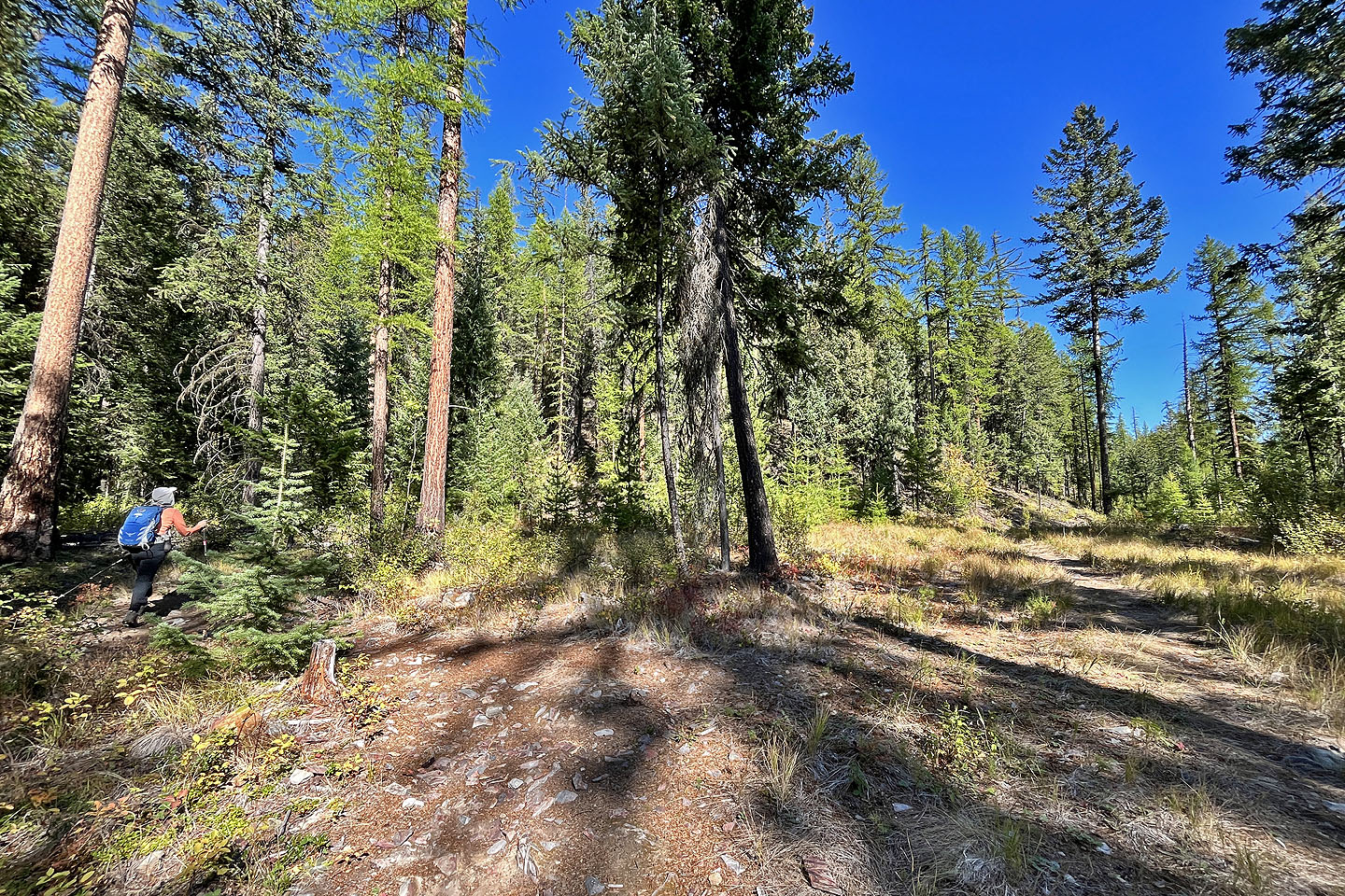 The trail switches between forest and clearings
