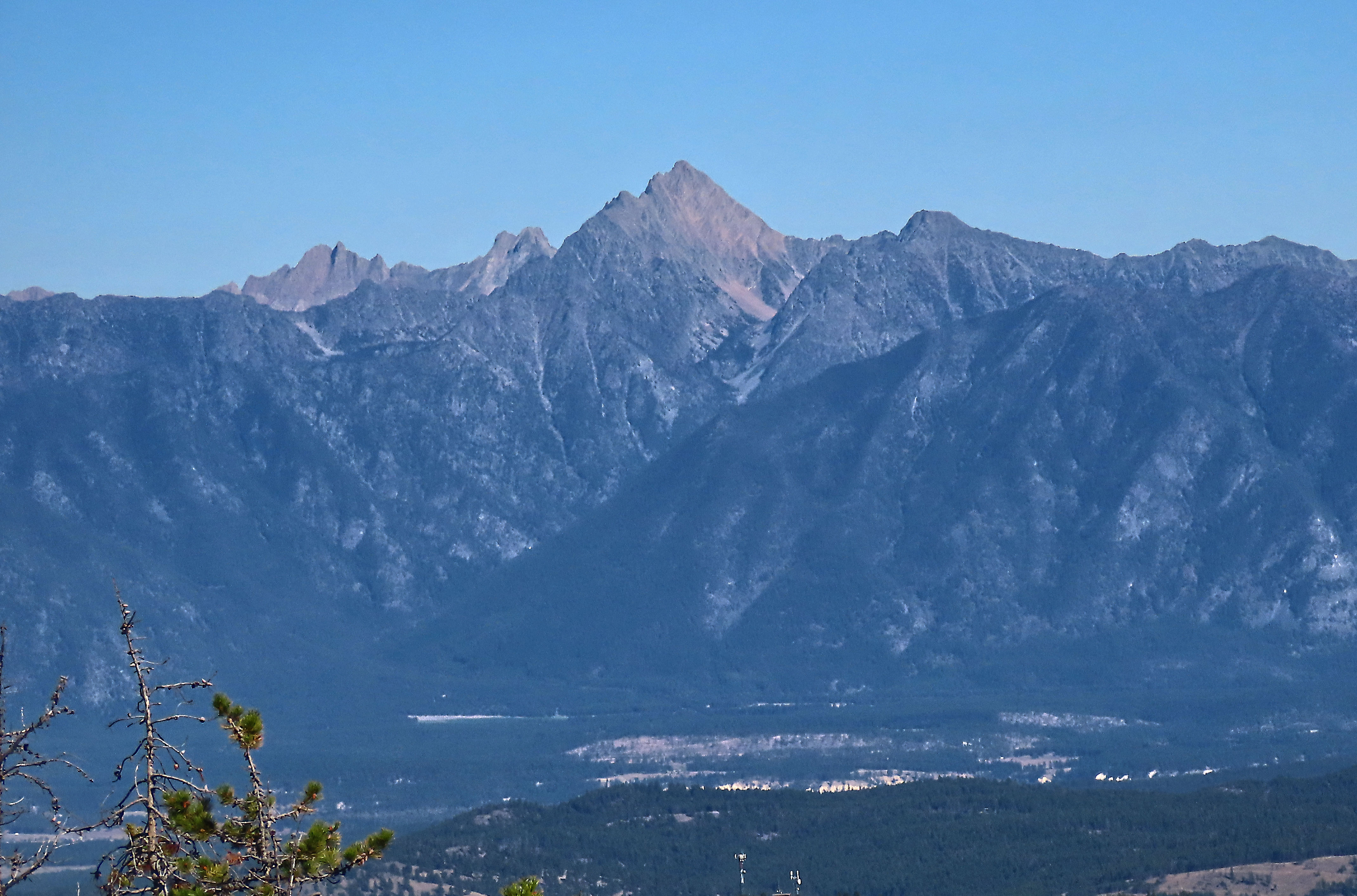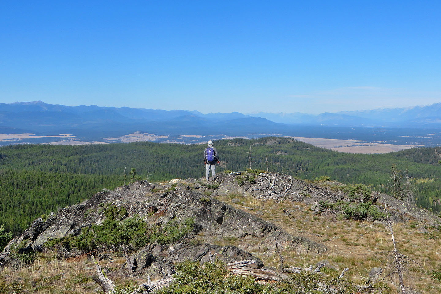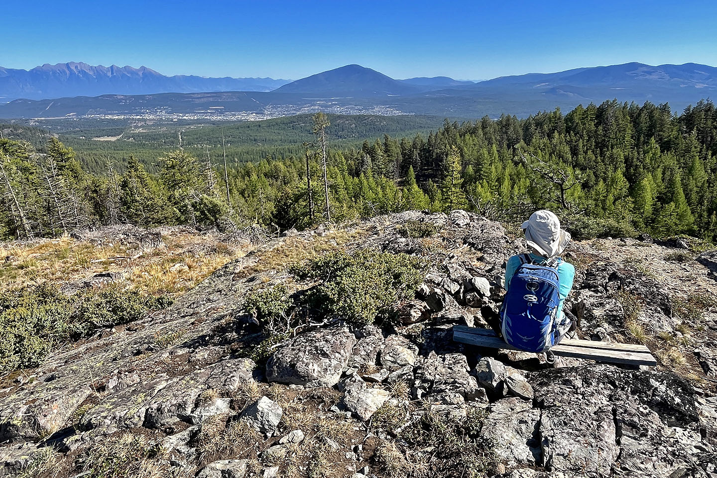 From a summit bench, Dinah looks down at the City of Cranbrook. Mount Baker in the centre.