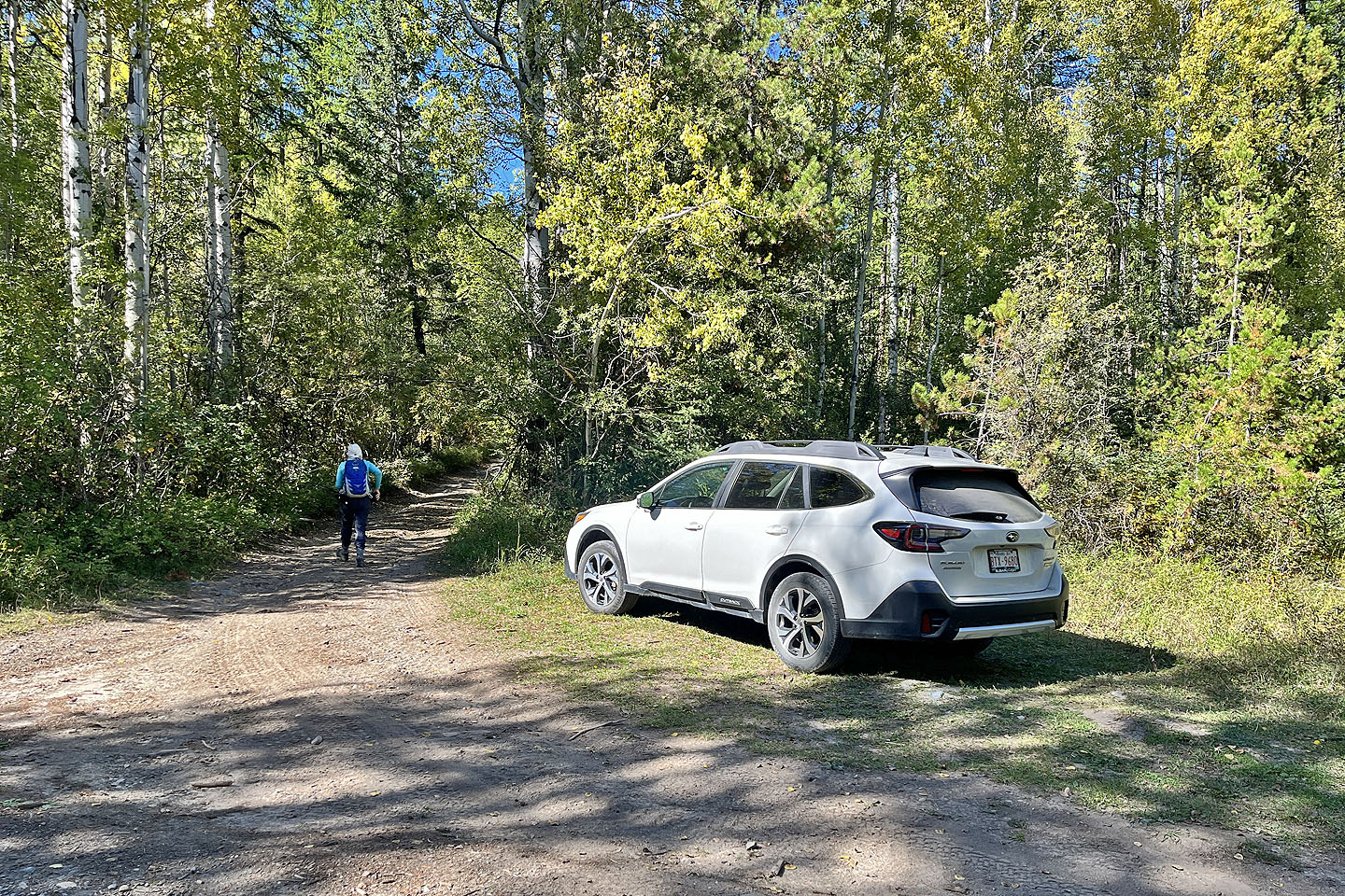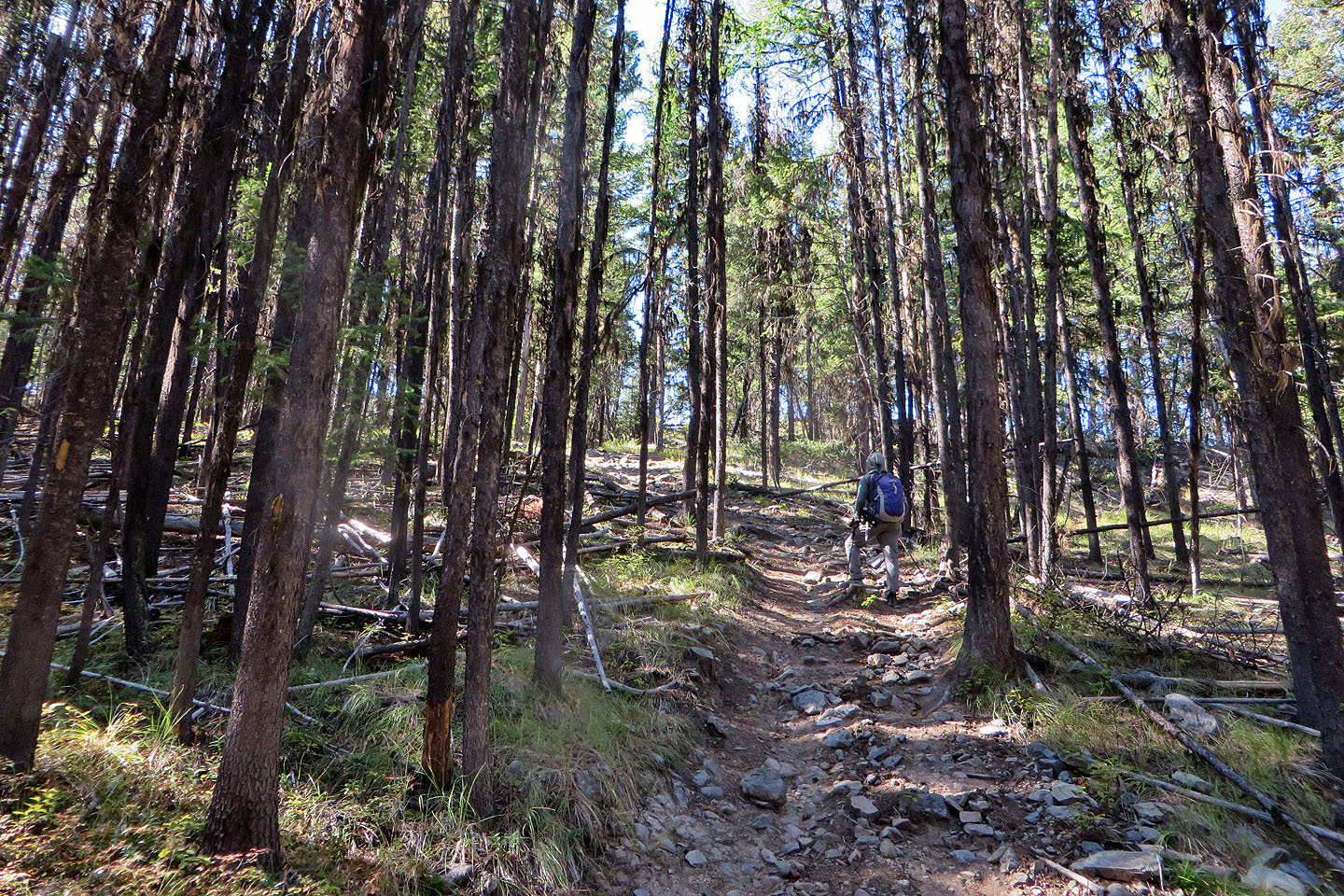 After driving several kilometers up a gravel road, high ground clearance not required, we parked at a small pullout and started up a quiet forest road. Larch trees were just starting to show a hint of colour change, but were a week or two from turning vivid yellow. The road gently climbed, but after passing two forks, it became slightly steeper. The forest thinned, but there were no views until just below the summit. The road ended, and we followed a brief path to a viewpoint with a little bench. Near the bench, we were surprised to see a turkey vulture perched in a tree a few metres away. I snapped a few photos before the big bird became annoyed and flew away.