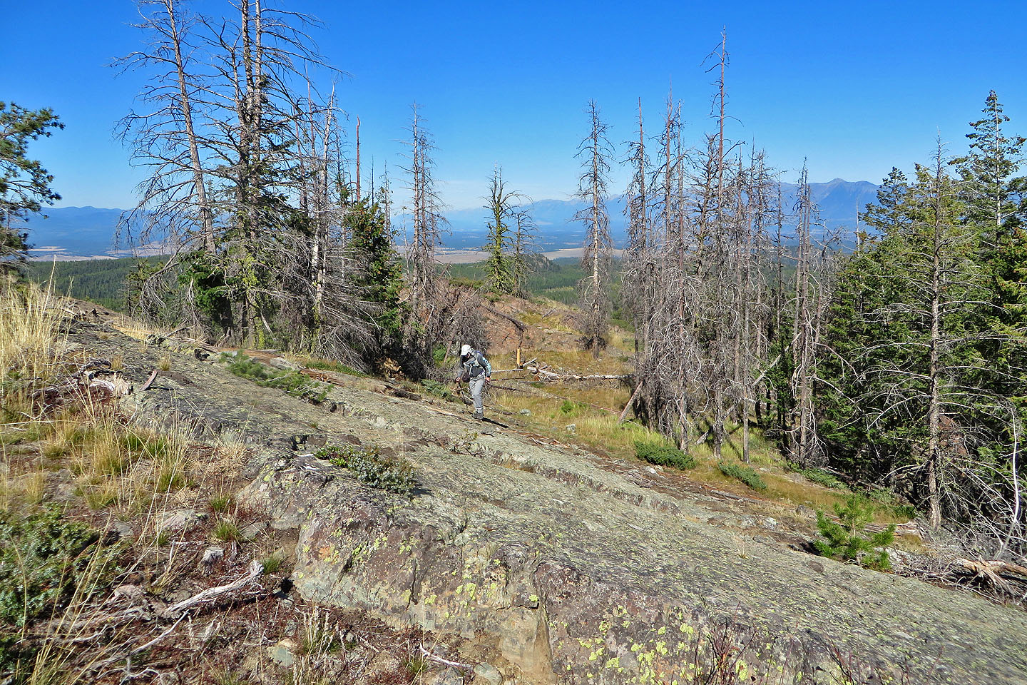 The summit was a short distance away. There’s no trail, but we easily crossed rock slabs to reach the top. As expected, there was a 360° view. However, trees prevented us from looking down at New Lake, and wildfire smoke veiled distant views. Despite this, it was a pleasant trip, and we lingered on the summit before heading back down.