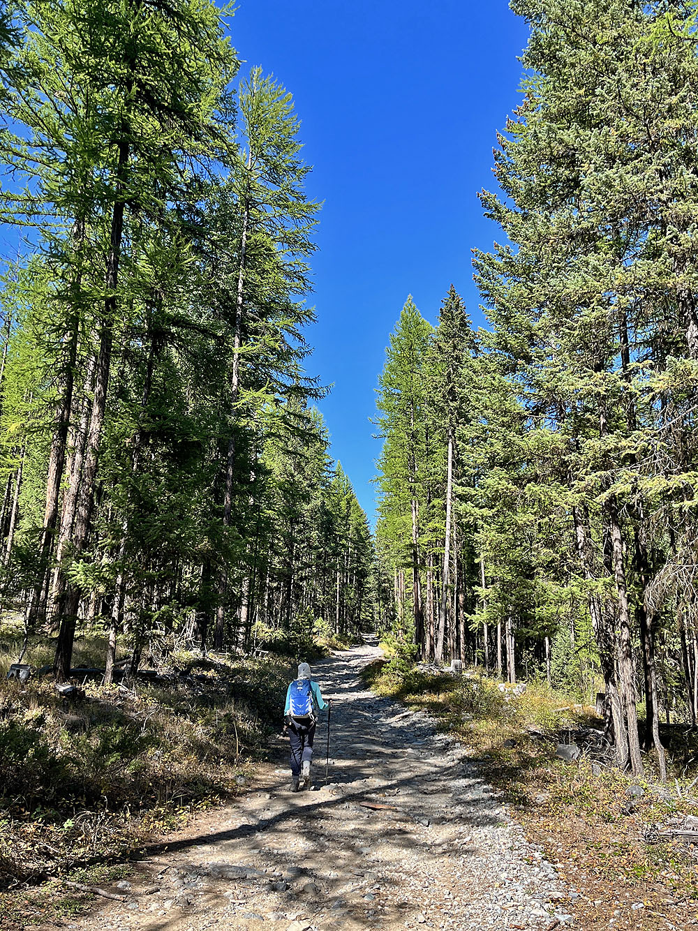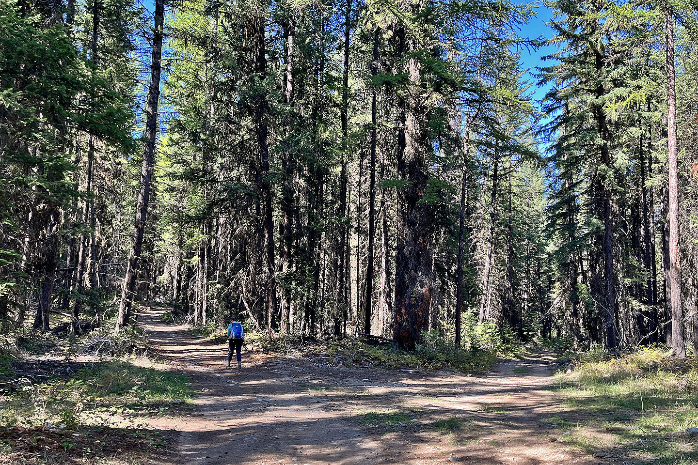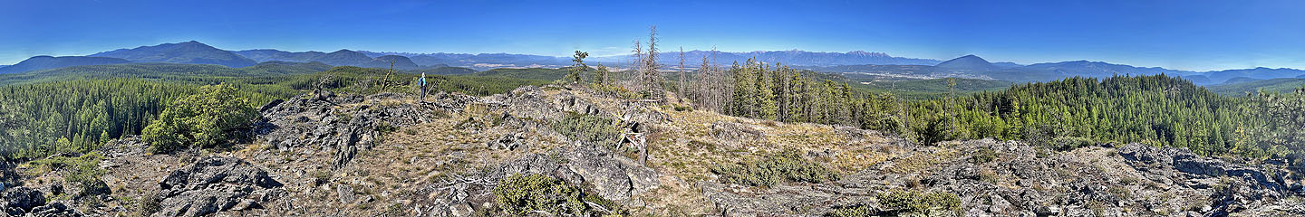 Ten minutes northwest of Cranbrook is a trail that AllTrails awkwardly calls New Lake 360 Viewpoint (I’ve shortened it to New Lake Viewpoint). It’s a short hike up an exploration road to an open summit. Three months ago, Dinah and I aborted the hike at the trailhead when a wildfire crew arrived to manage a fire near the summit. This time, there was no wildfire nearby.