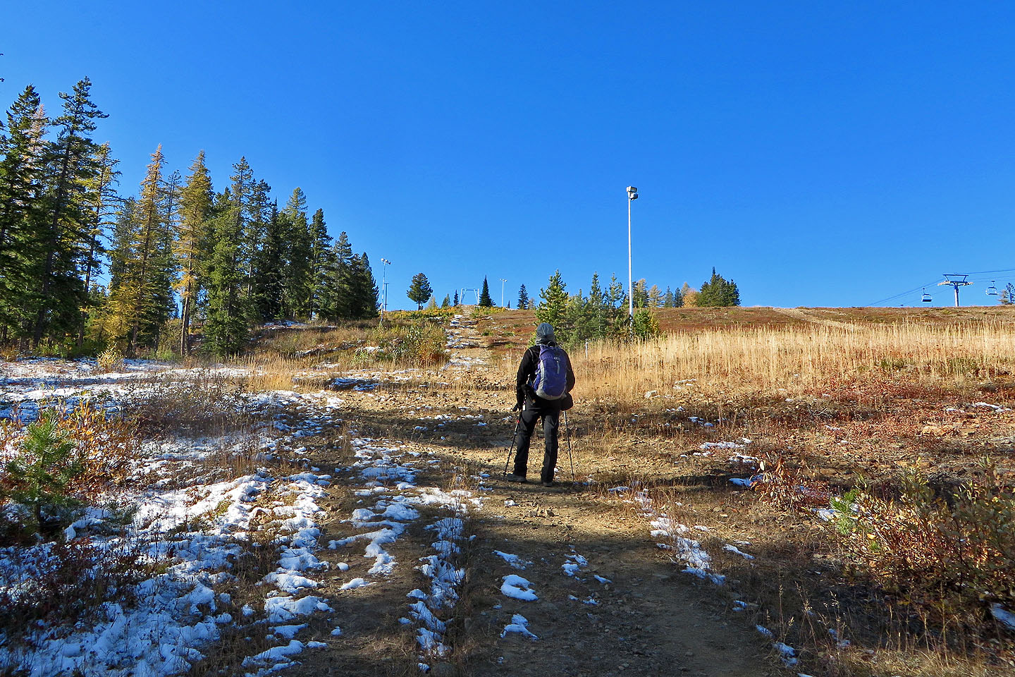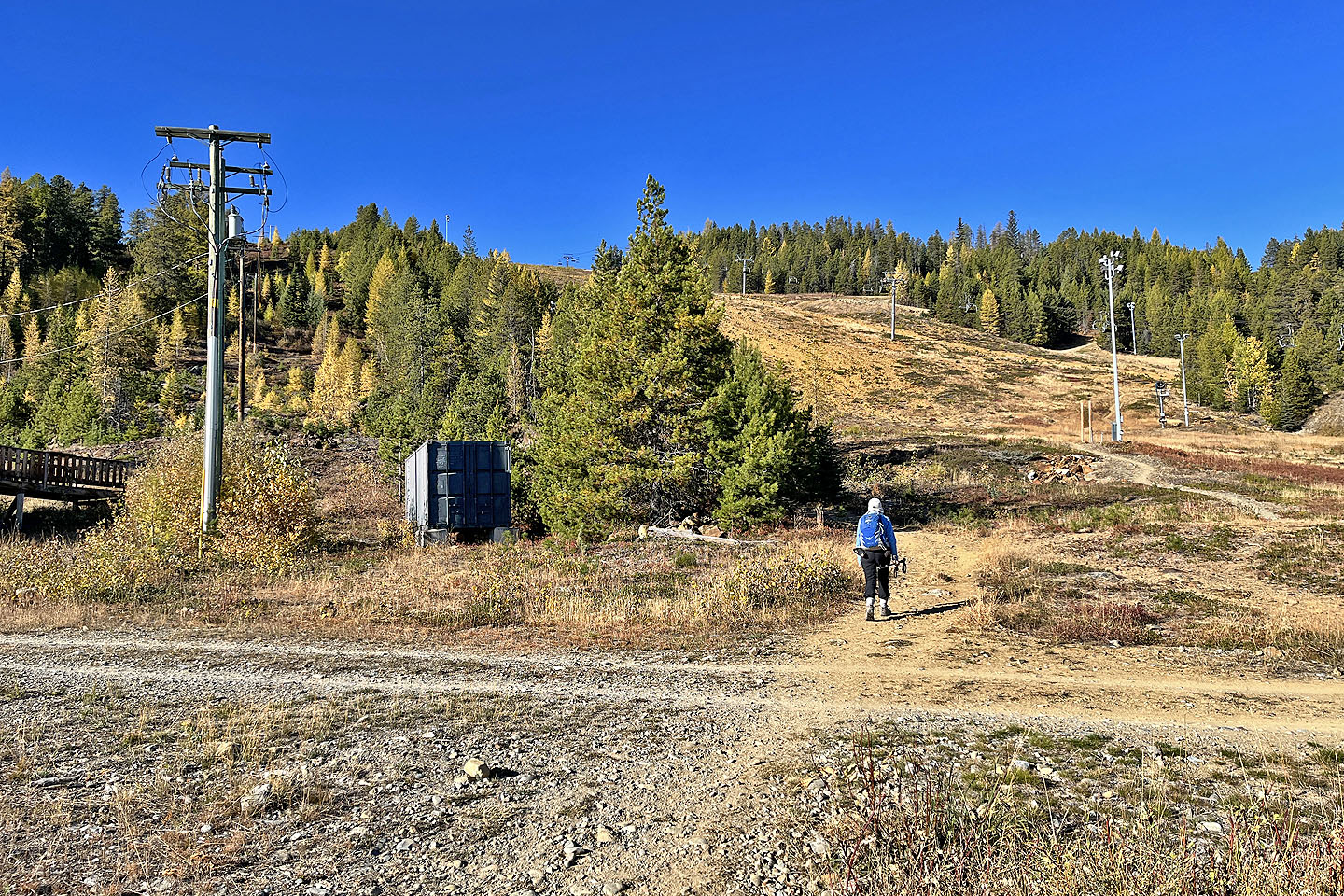 From the parking lot near the chairlift, Dinah and I started up a broad trail. We passed a couple of intersections before reaching Ego Alley Trail. Running parallel to the chairlift, the trail goes straight up a wooded slope. We began seeing yellow larches.