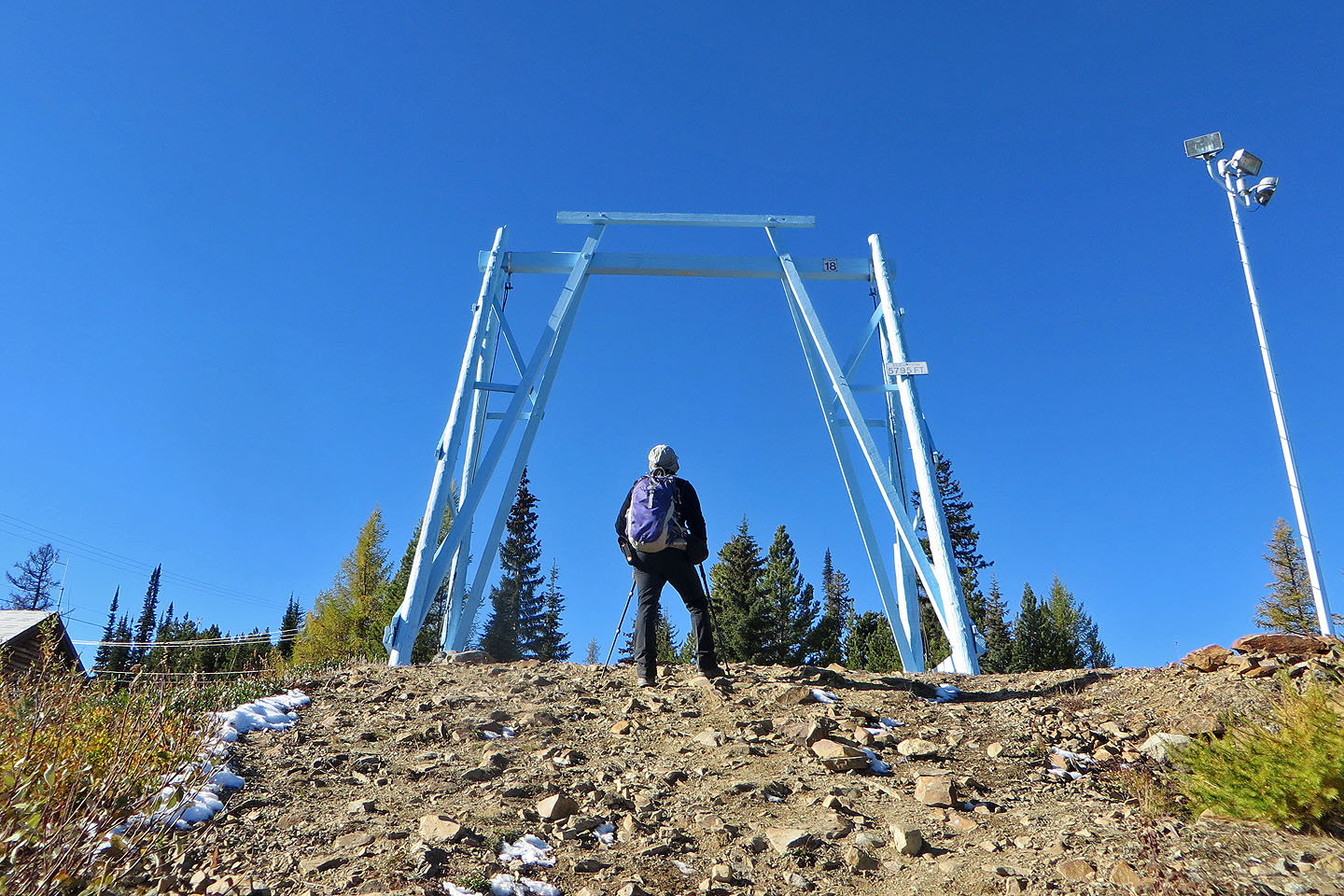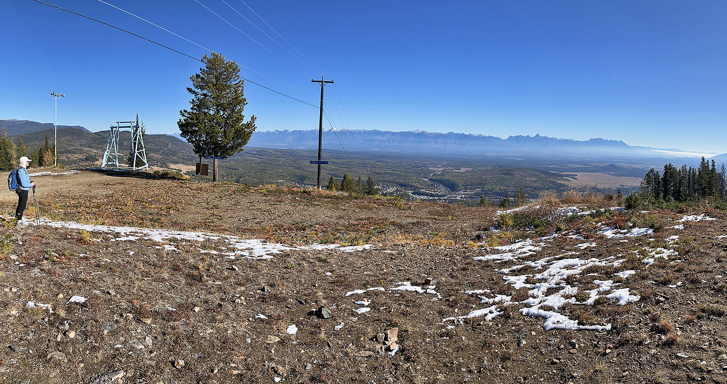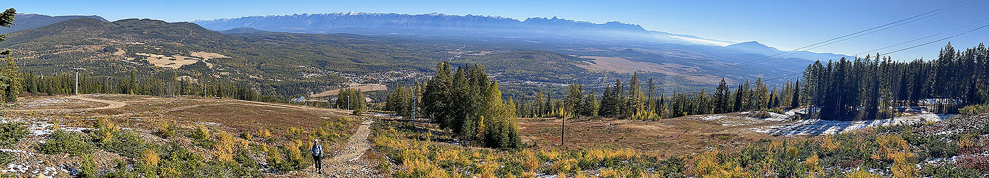The trail ends at the top of the old T-bar lift in a clearing. From there, we gazed back across the Rocky Mountain Trench to an impressive sight. Stretching across the east horizon over 30 kilometres away were the Rockies.