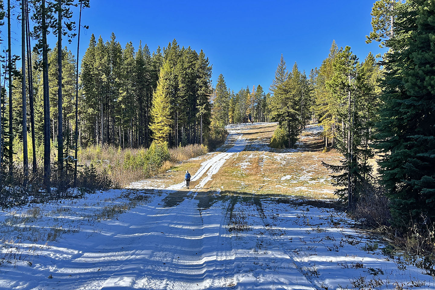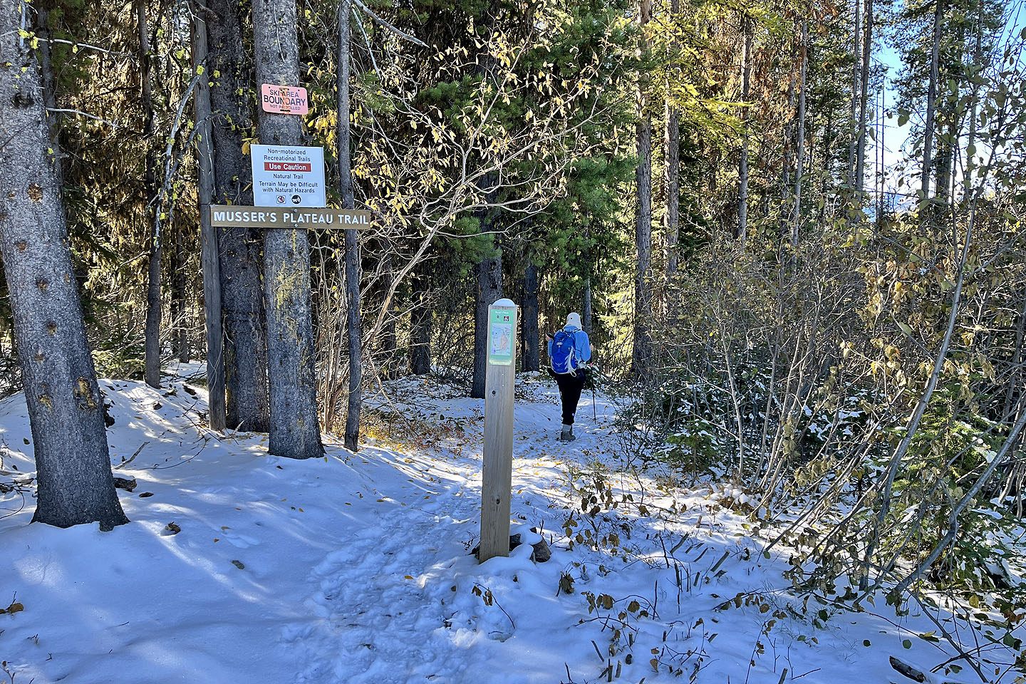 to Musser’s Plateau Trail. It descends through forest with scattered larches. We passed through small clearings,