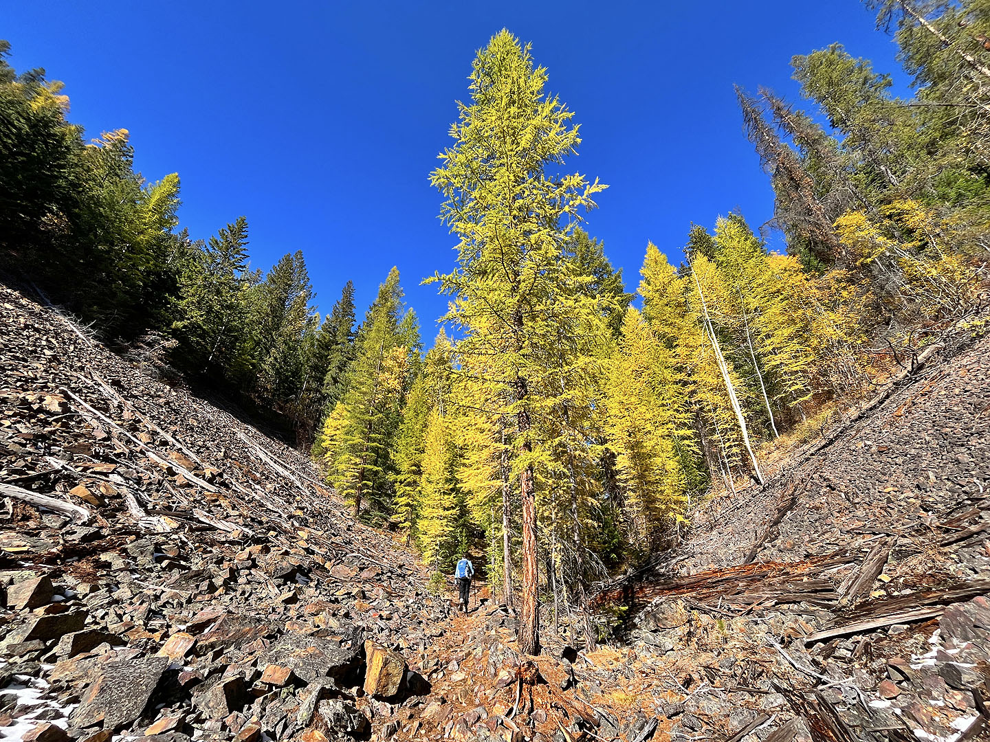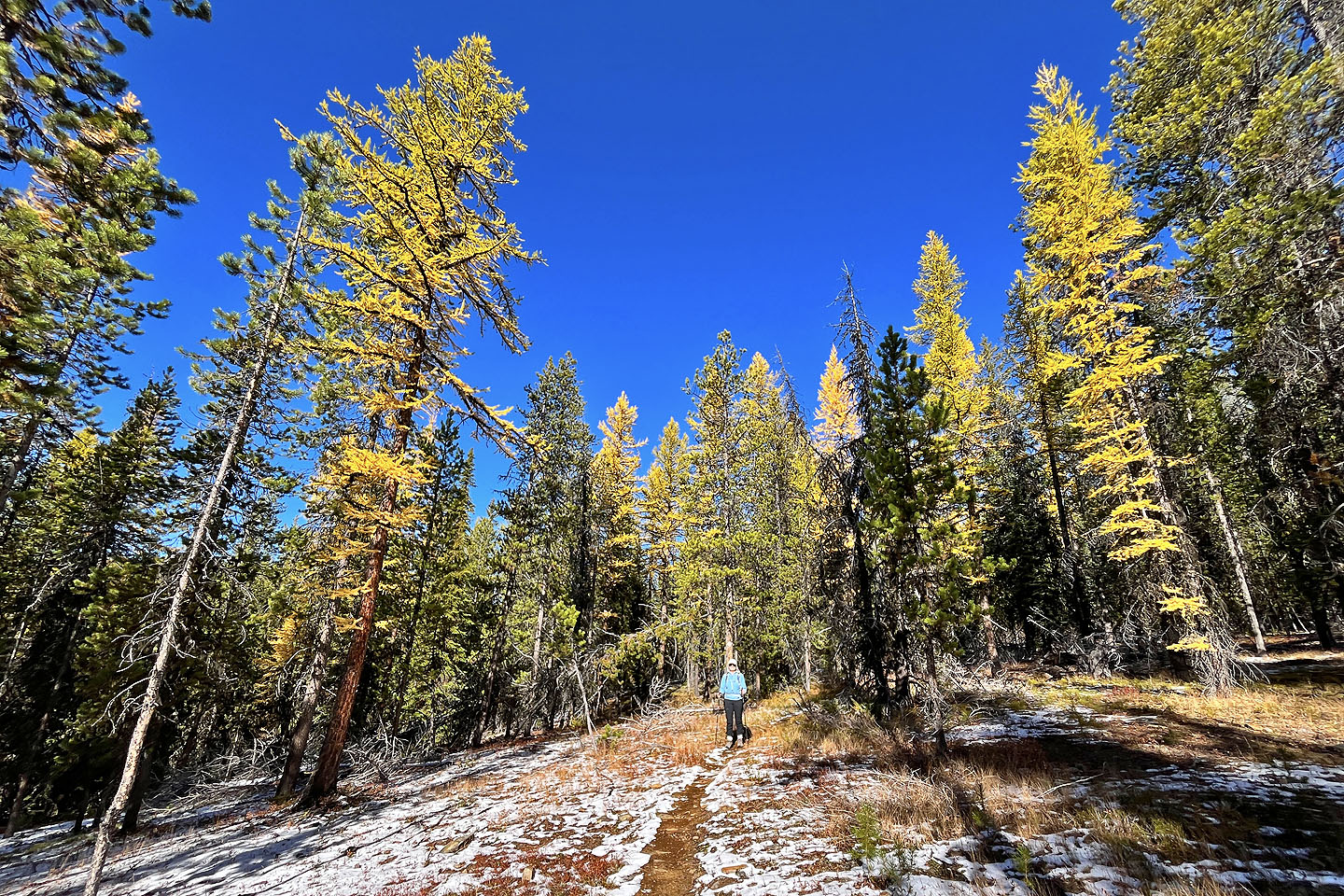 but the views were unremarkable. Eventually, we reached Moe’s Canyon. In clearings, the larches really glowed.