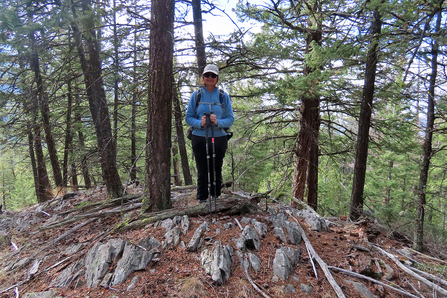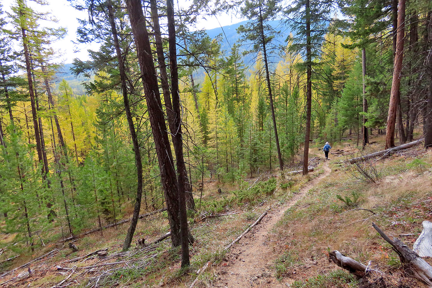 We started on Kinnikinnick Trail. Although it makes a nice loop that passes near our objective, it was too long for us because of the pending rain. We soon left Kinnikinnick and turned onto Arnica. We continued choosing trails that led directly to Kinnikinnick where it crosses high on a ridge. As we hiked, we enjoyed the sight of bright yellow larches lining the paths.