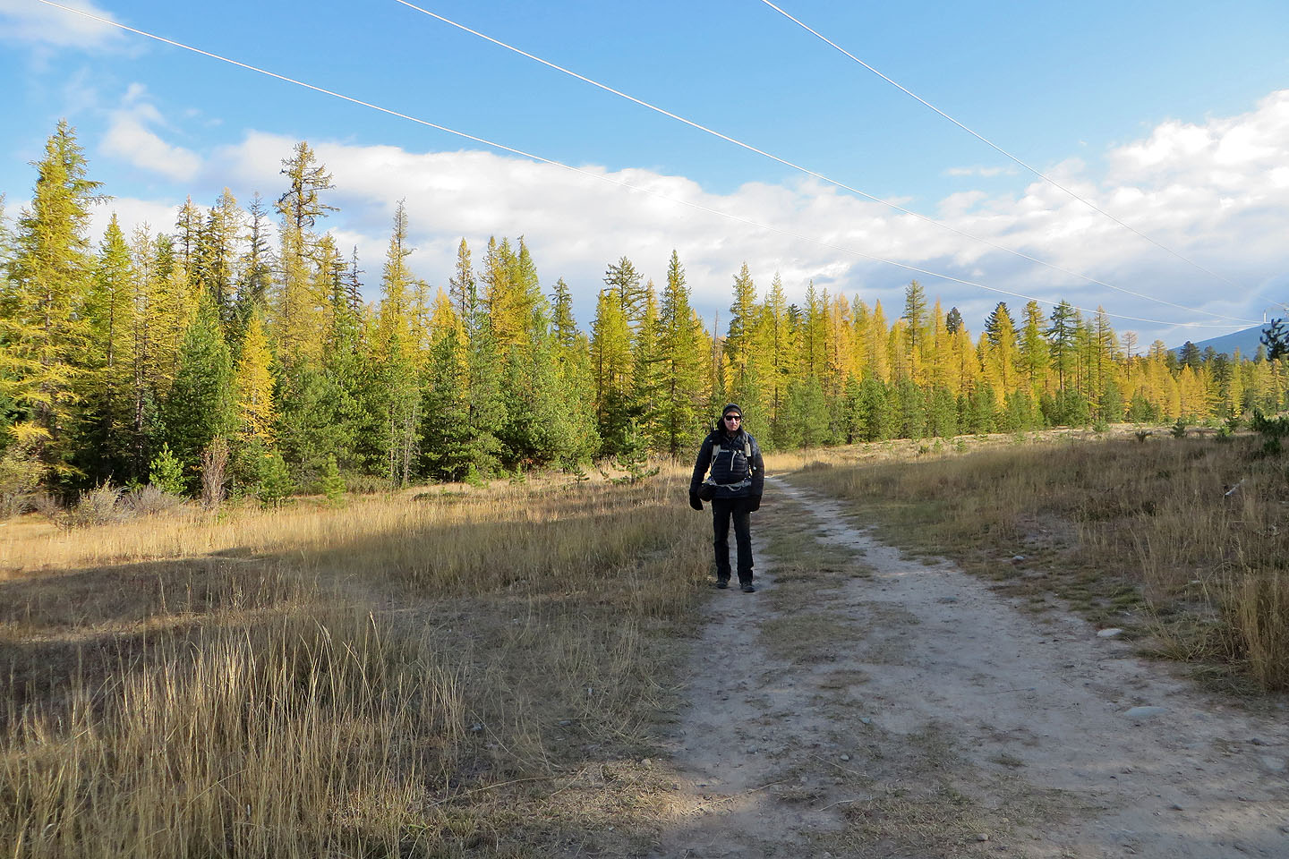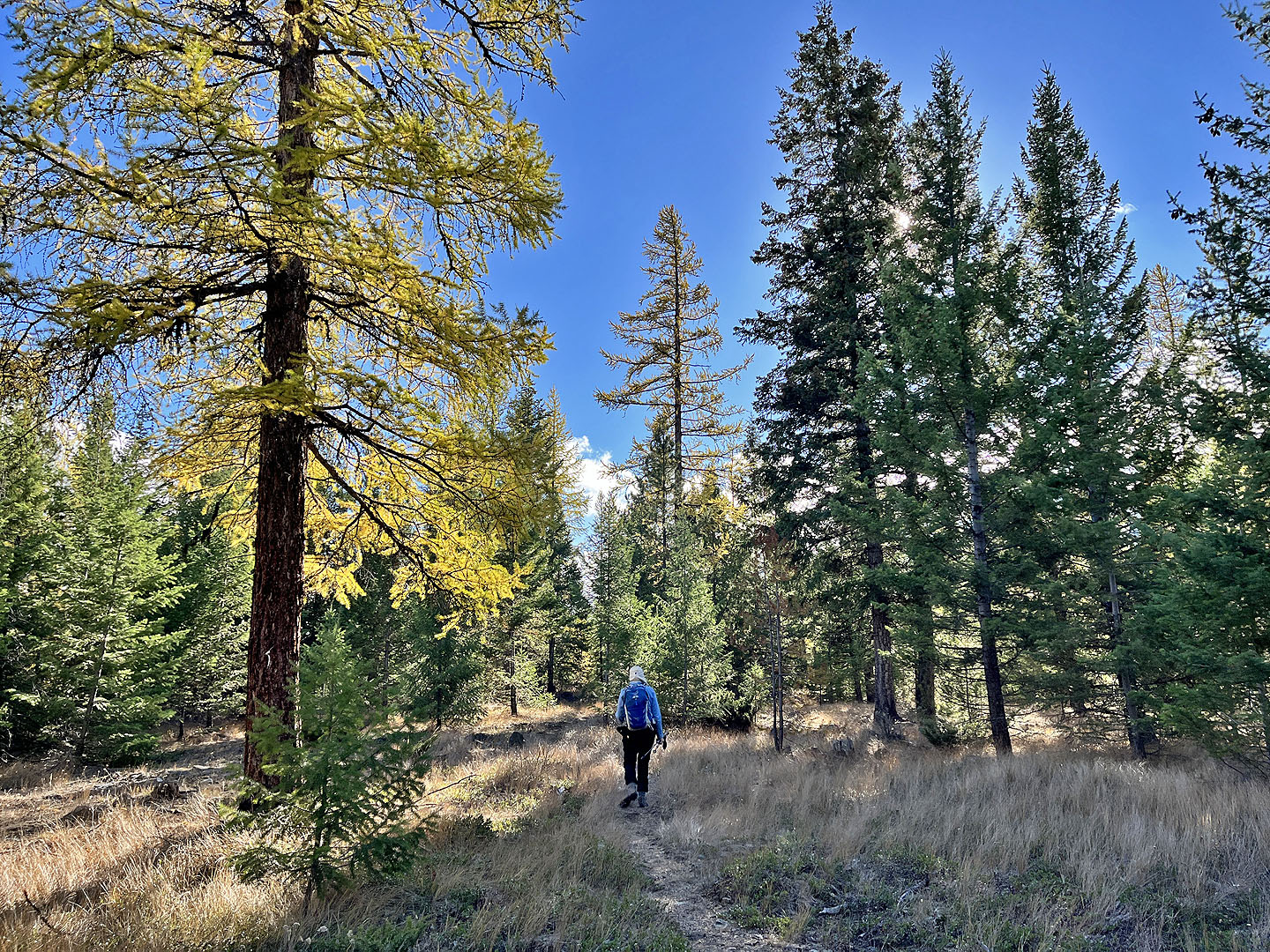 With the forecast threatening afternoon rain, Dinah and I decided on a morning hike ten minutes southeast of Cranbrook. Choosing from the network of trails in South Star Recreation Area, we planned to complete a loop and reach the second highest point in the park. We didn’t expect to find a viewpoint in the forested park, but the colourful larches on an autumn day would keep us engaged.