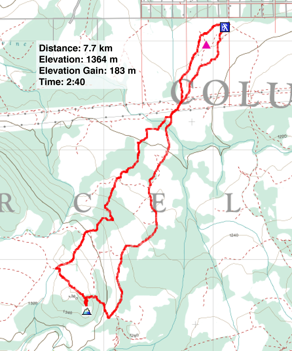 We reached Kinnikinnick and continued up the ridge. We came to small clearings but none with views. We were far from the highest point in the park, but Kinnikinnick passes within 100 m of the second highest point. After a brief bushwhack, we reached the top and returned to Kinnikinnick. We continued down the trail until it intersected Easy Street. We turned left and followed the road-like trail back to the parking lot.