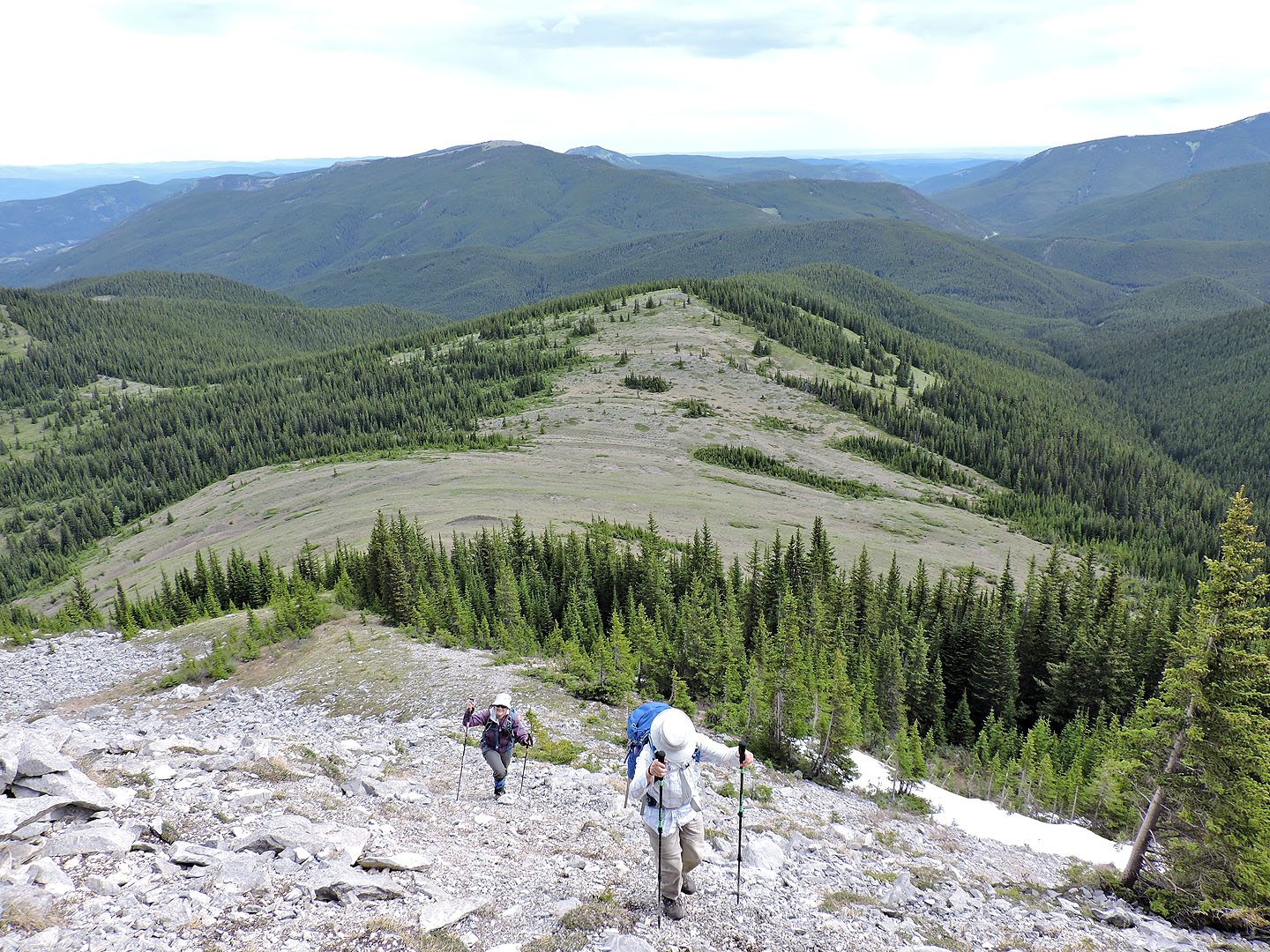 Mike and Kirsten are two specks in the gray scree below a high point