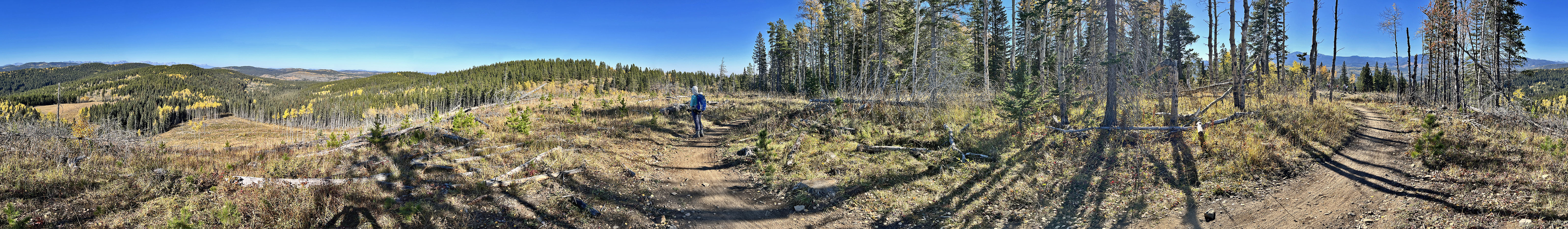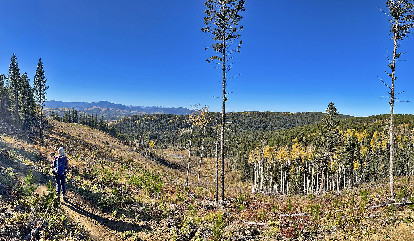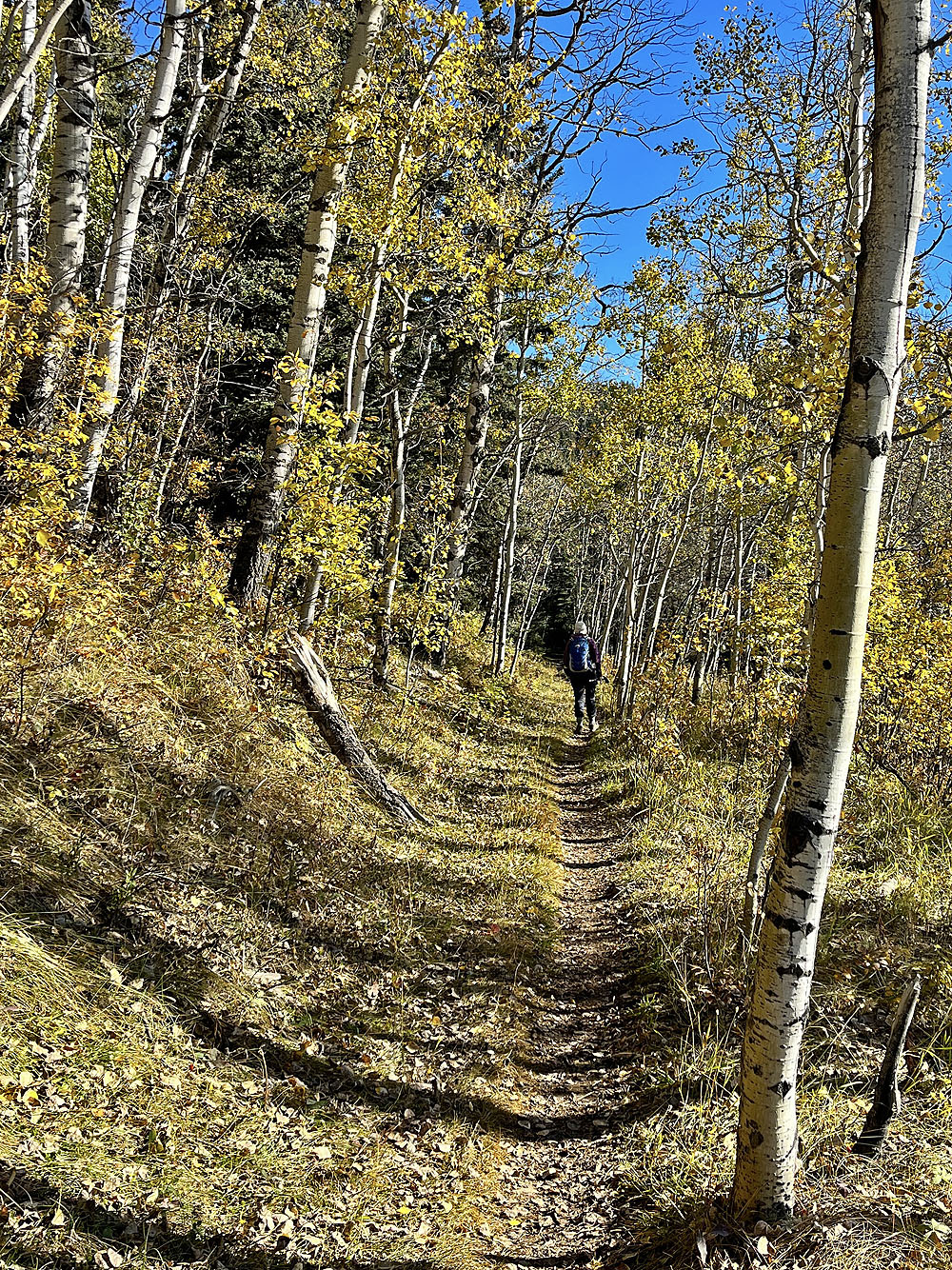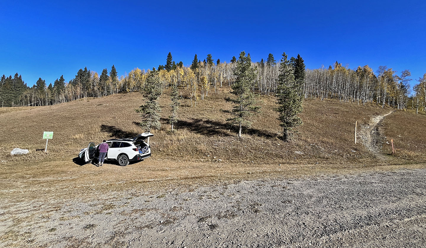 We started at the western trailhead for Jumpingpound Loop and followed a path lined with yellowing aspens. We soon reached a junction and turned left onto Trampled Underfoot. We tramped up a wooded slope to a viewpoint. We continued north up the trail before it turned east to reach the edge of a meadow where we spied Zeppelin Hill. The trail climbs an open slope to a partially treed summit.