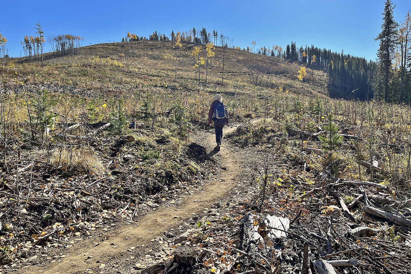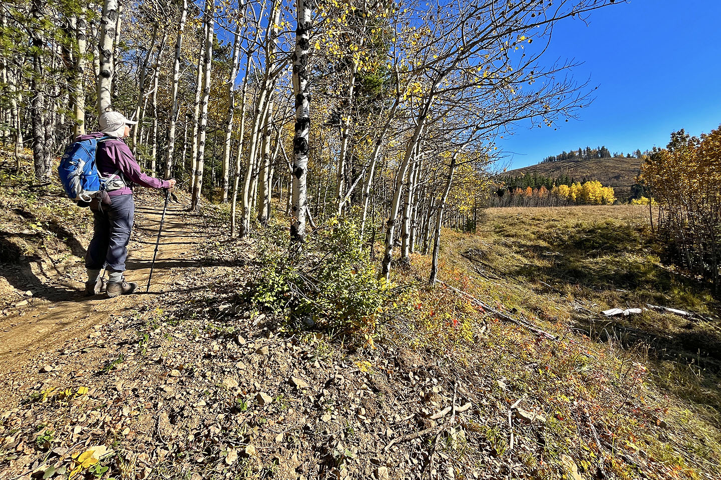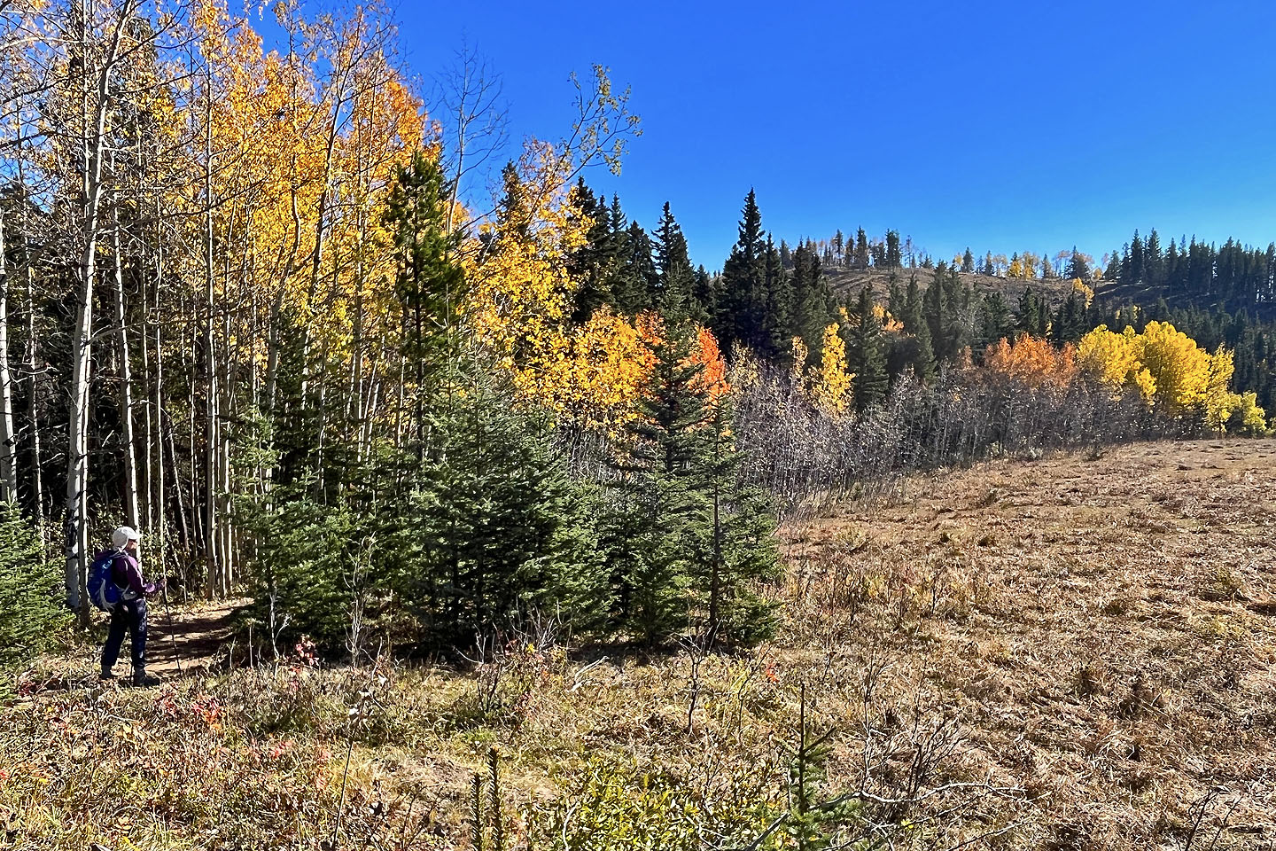 We started at the western trailhead for Jumpingpound Loop and followed a path lined with yellowing aspens. We soon reached a junction and turned left onto Trampled Underfoot. We tramped up a wooded slope to a viewpoint. We continued north up the trail before it turned east to reach the edge of a meadow where we spied Zeppelin Hill. The trail climbs an open slope to a partially treed summit.