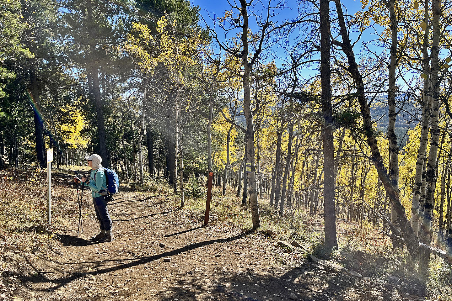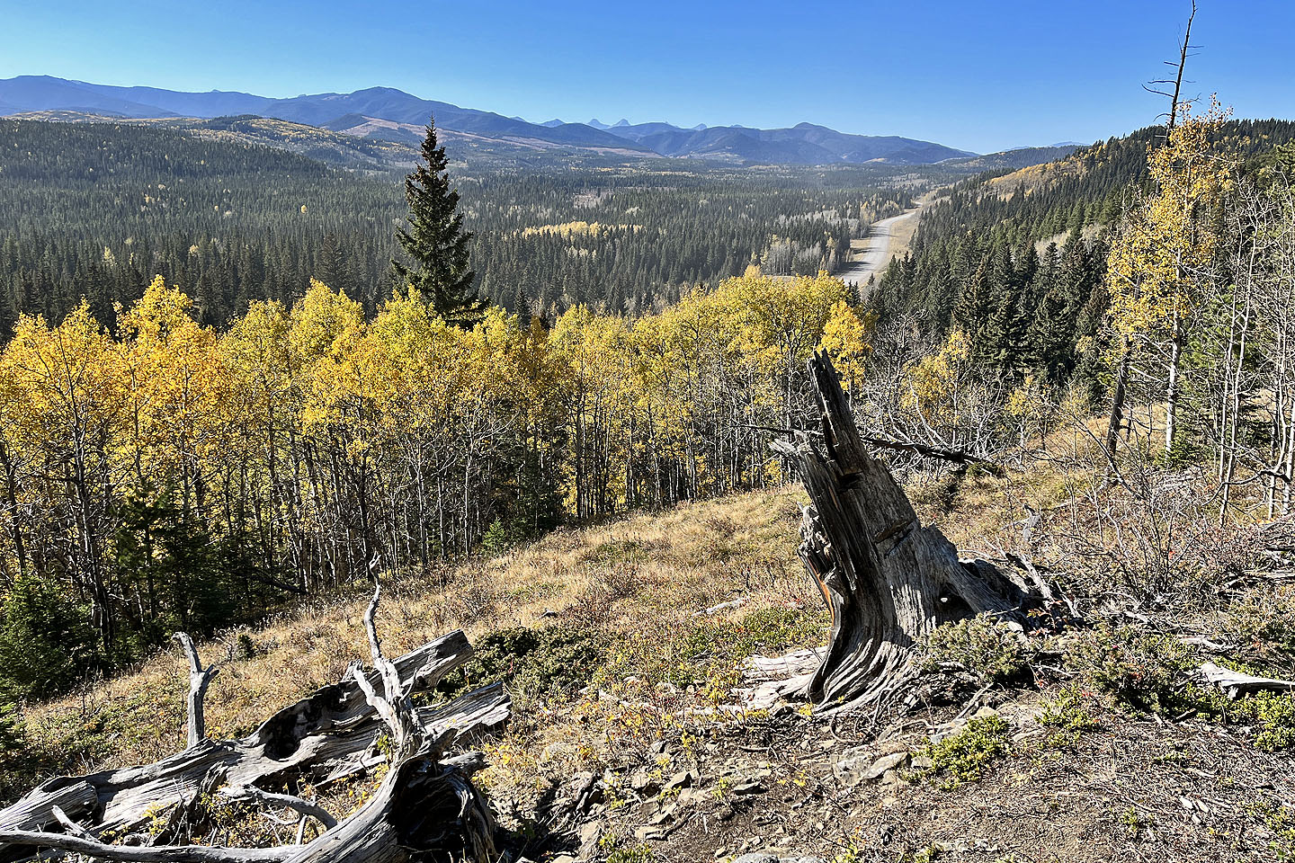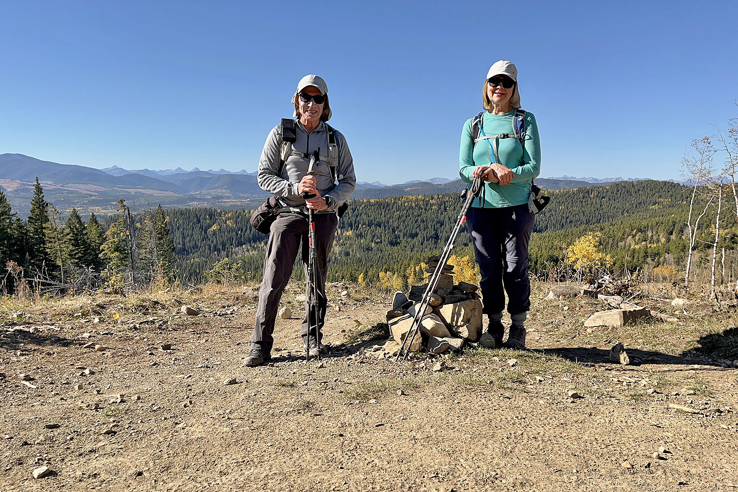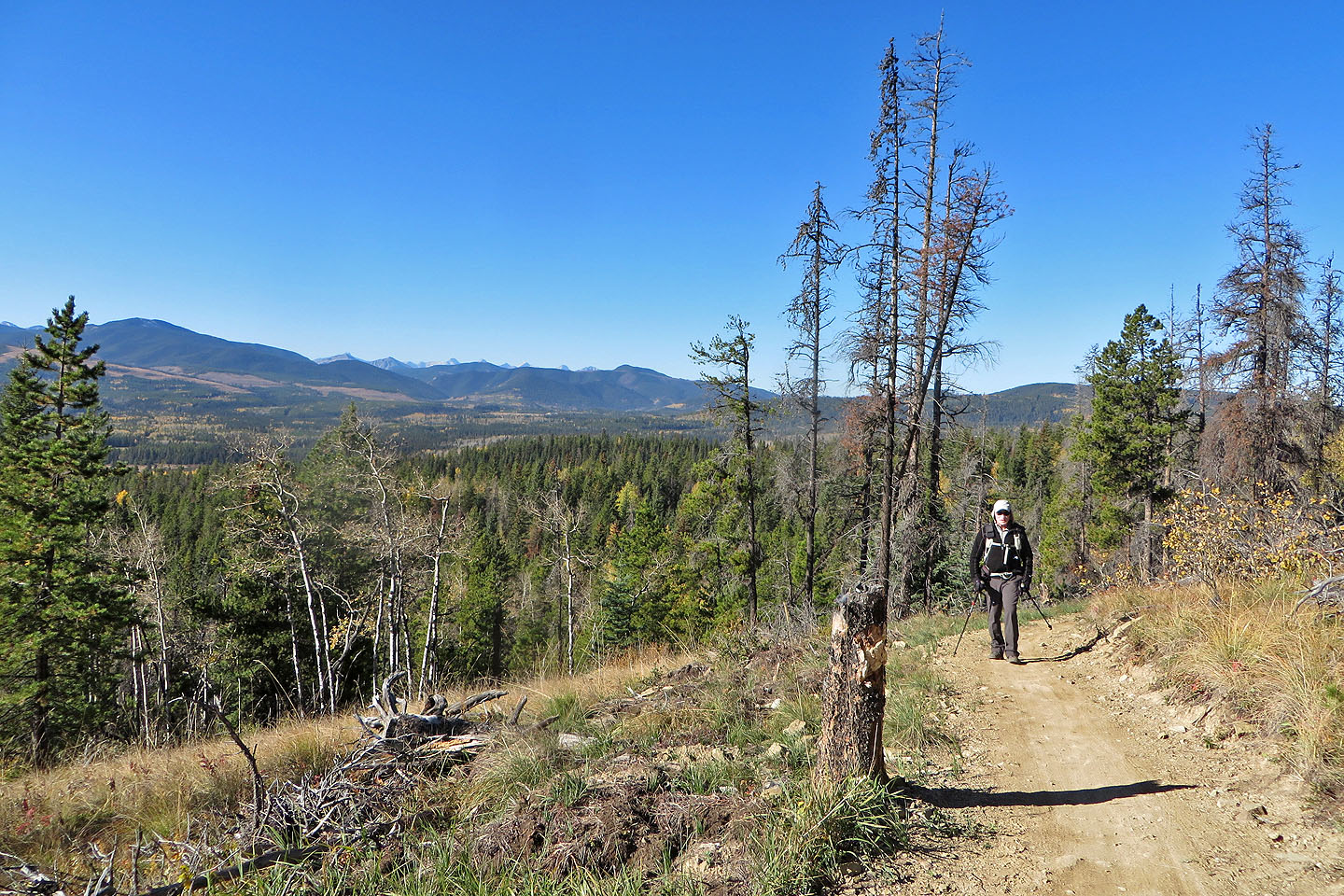 We started at the western trailhead for Jumpingpound Loop and followed a path lined with yellowing aspens. We soon reached a junction and turned left onto Trampled Underfoot. We tramped up a wooded slope to a viewpoint. We continued north up the trail before it turned east to reach the edge of a meadow where we spied Zeppelin Hill. The trail climbs an open slope to a partially treed summit.