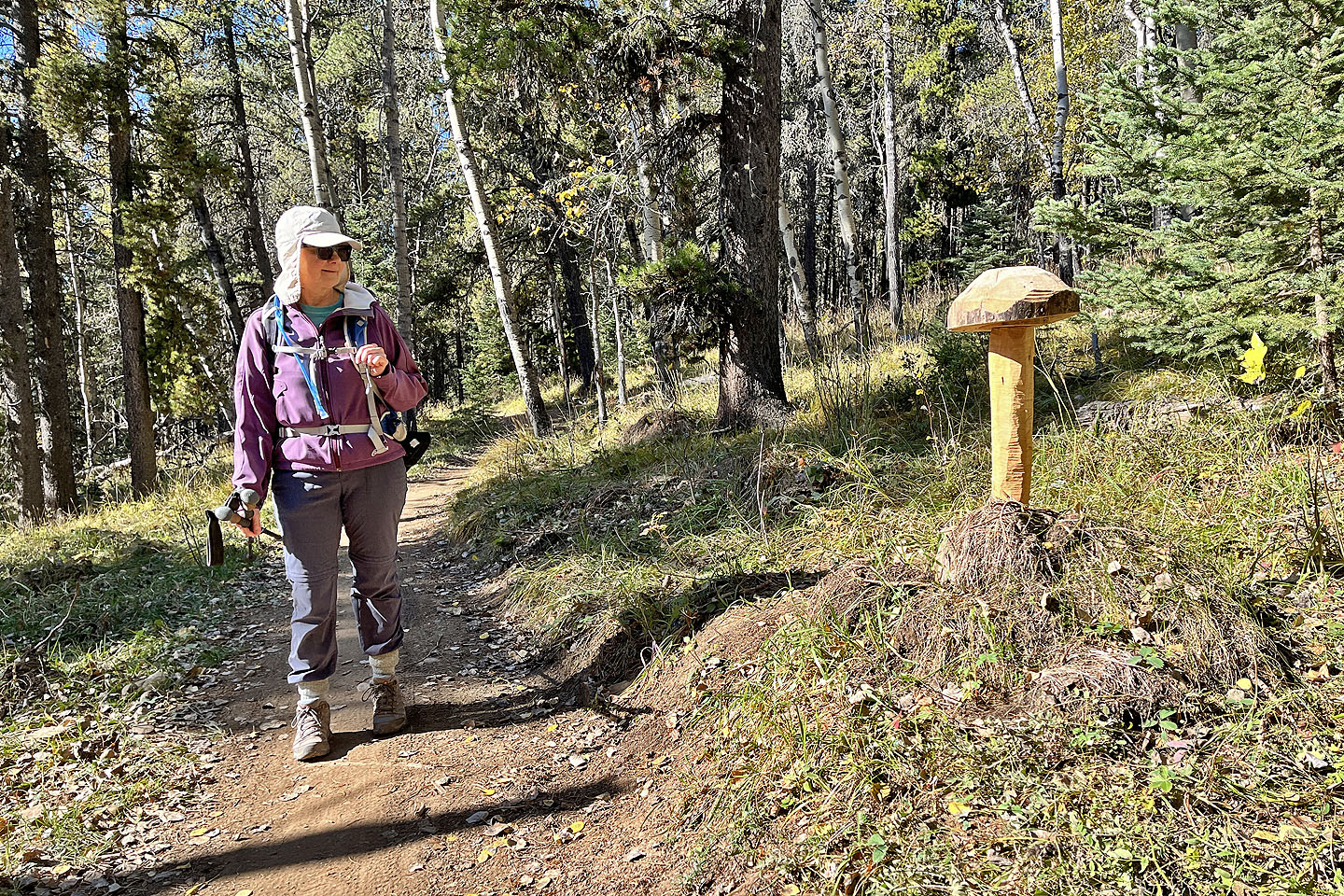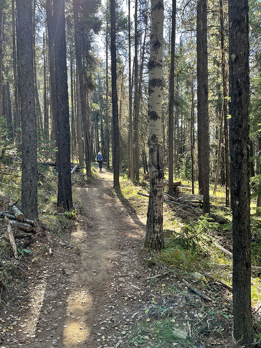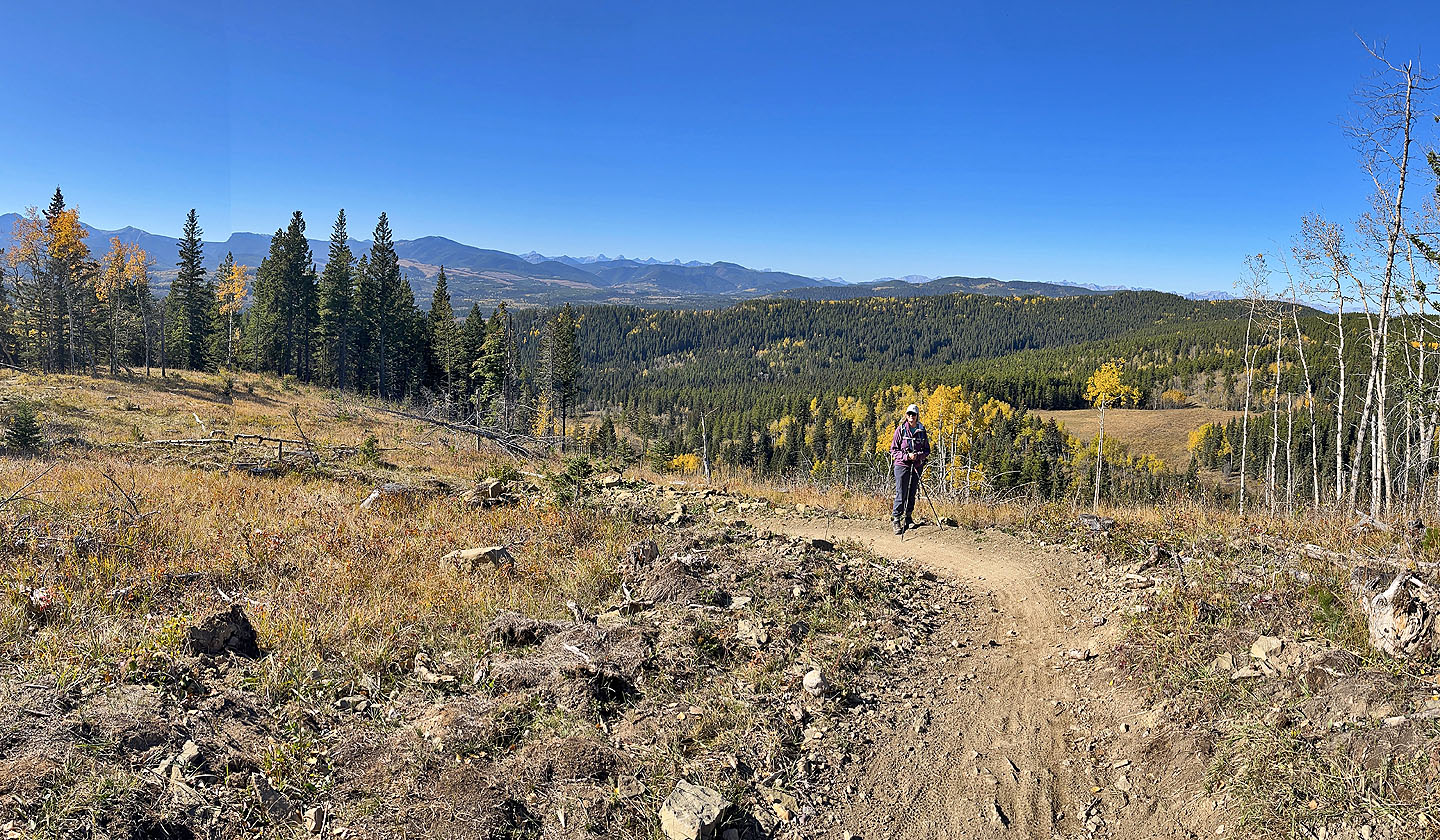 Trampled Under Foot, Kashmir, and Ten Years Gone – trails revering Led Zeppelin songs – converge at the top, where several cyclists gathered, some relaxing on log benches. Everyone was in high spirits on this beautiful autumn day. We chatted and joked with a few riders before descending Kashmir and Jumpingpound Loop back to the parking lot. We’re looking forward to returning to the Jumped Up Loops to hike the east loop.