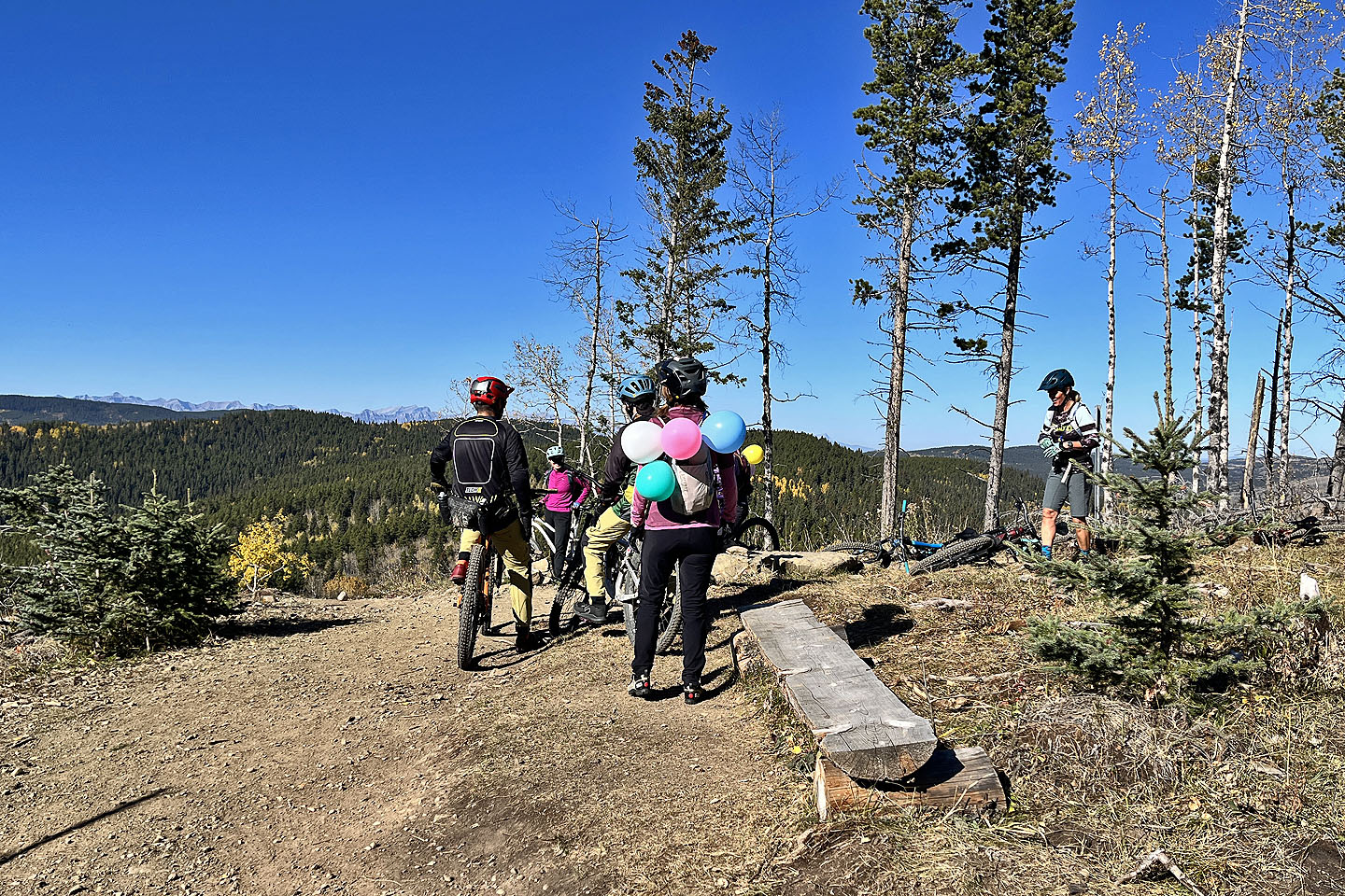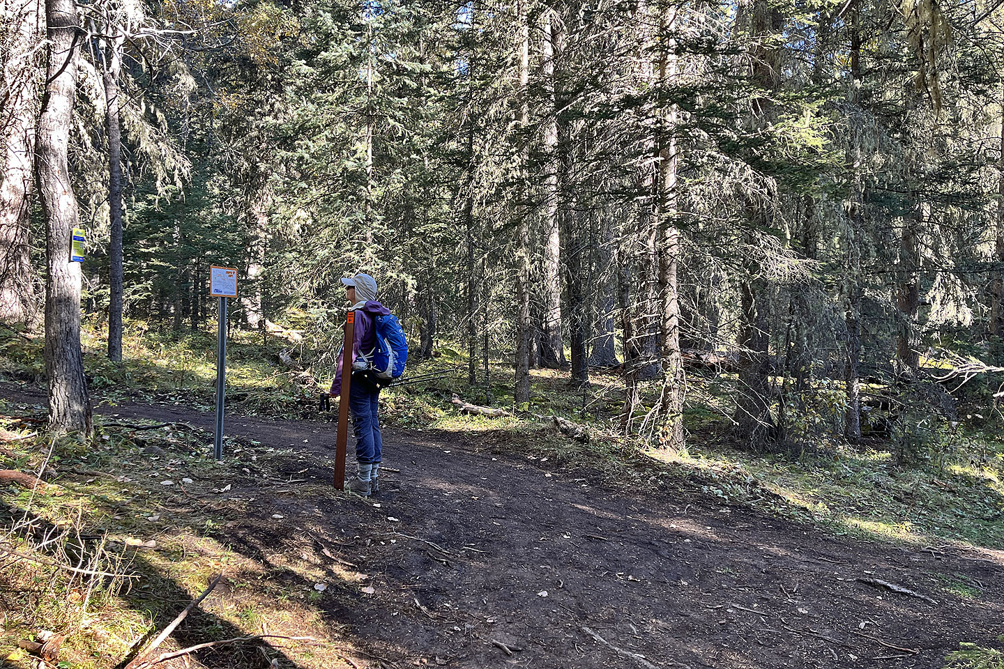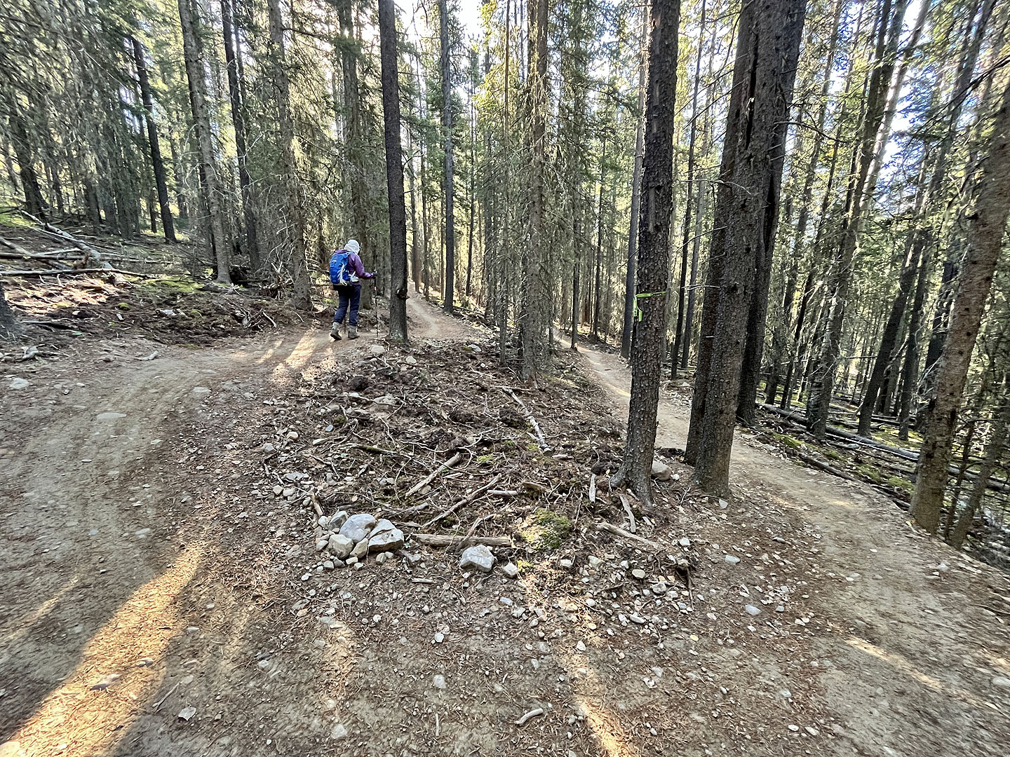 Trampled Under Foot, Kashmir, and Ten Years Gone – trails revering Led Zeppelin songs – converge at the top, where several cyclists gathered, some relaxing on log benches. Everyone was in high spirits on this beautiful autumn day. We chatted and joked with a few riders before descending Kashmir and Jumpingpound Loop back to the parking lot. We’re looking forward to returning to the Jumped Up Loops to hike the east loop.