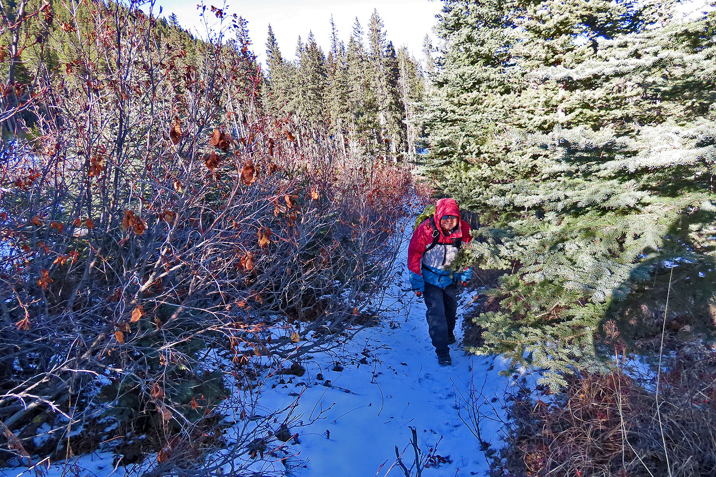Sonny pushes through foliage on a tight trail