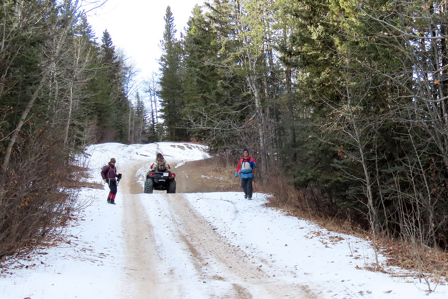 An ATV passes Zosia and Sonny on the road back to the parking lot