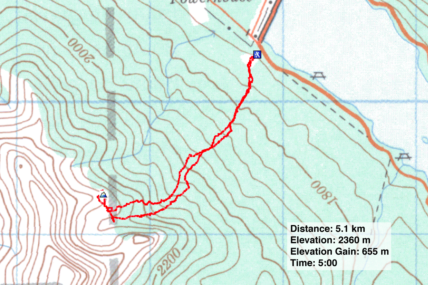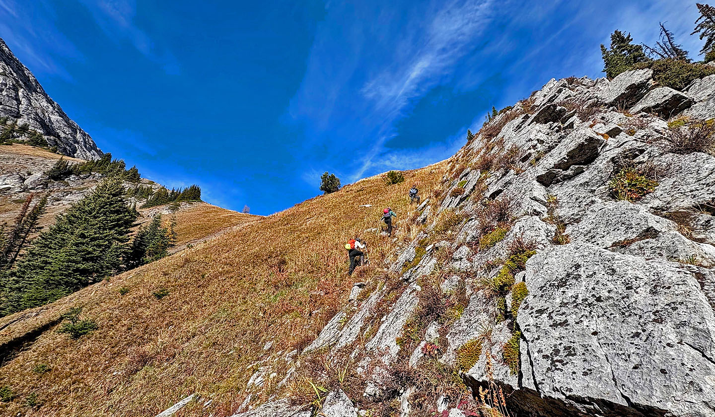After climbing 300 m, the ridge disappeared, and we continued up a slope. Dense foliage forced us left, away from the gully going to the tarn and to a long talus slope beneath a cliff. We hiked up the rocks for a few hundred metres, then the trees thinned, allowing us to reach the gully. By then, we were nearly at the tarn.
