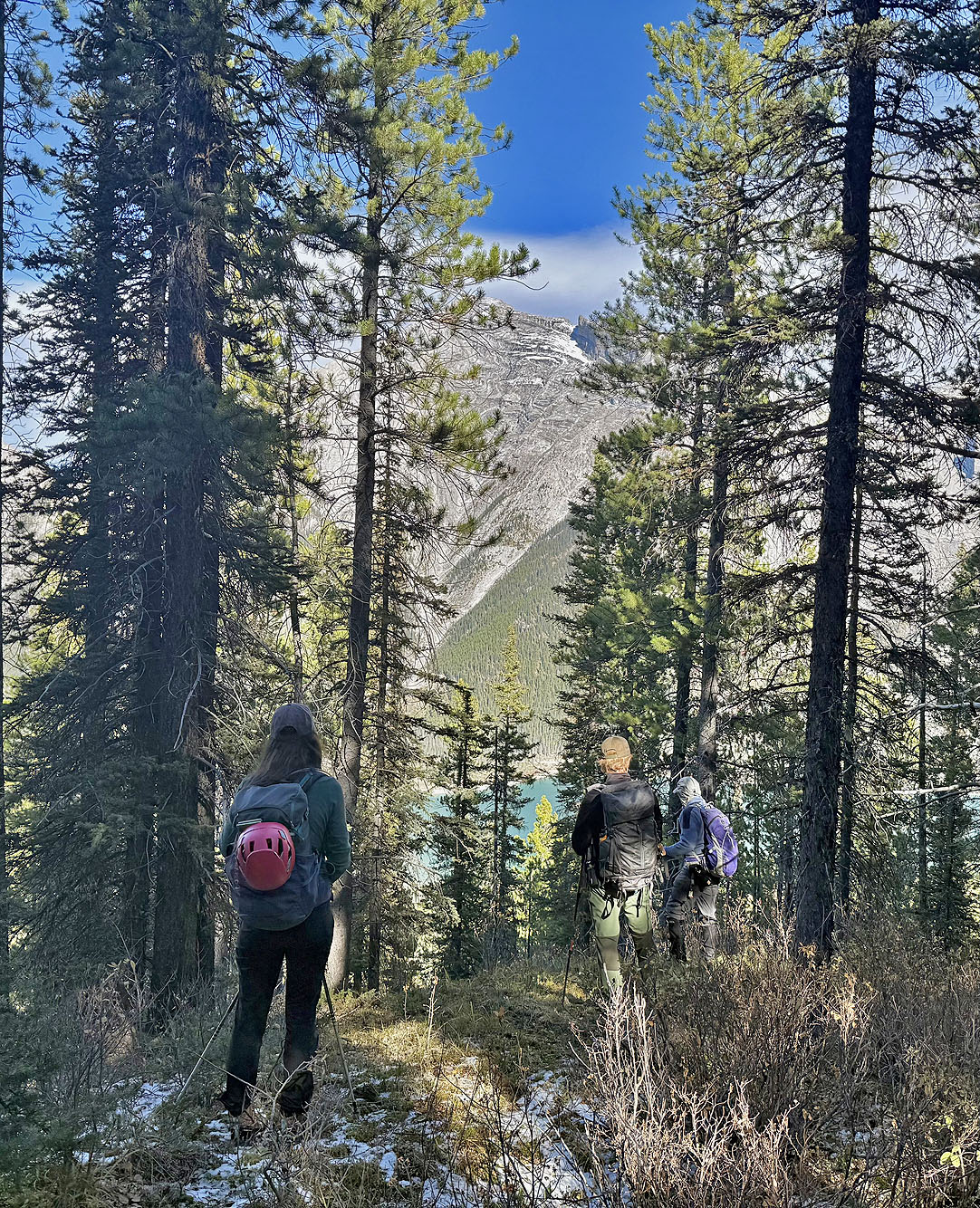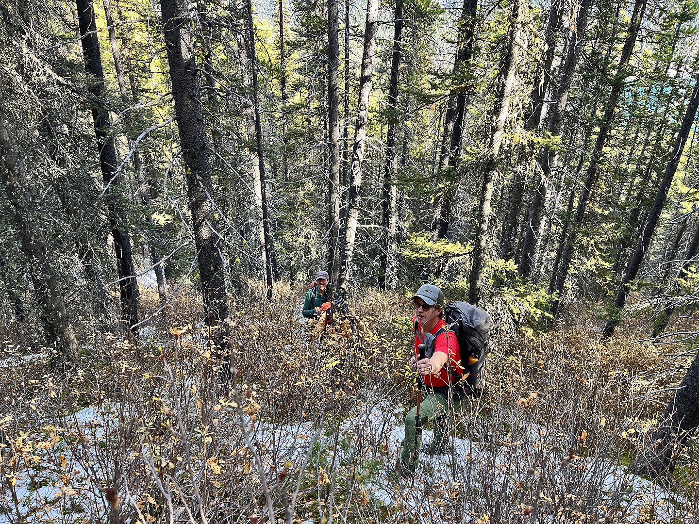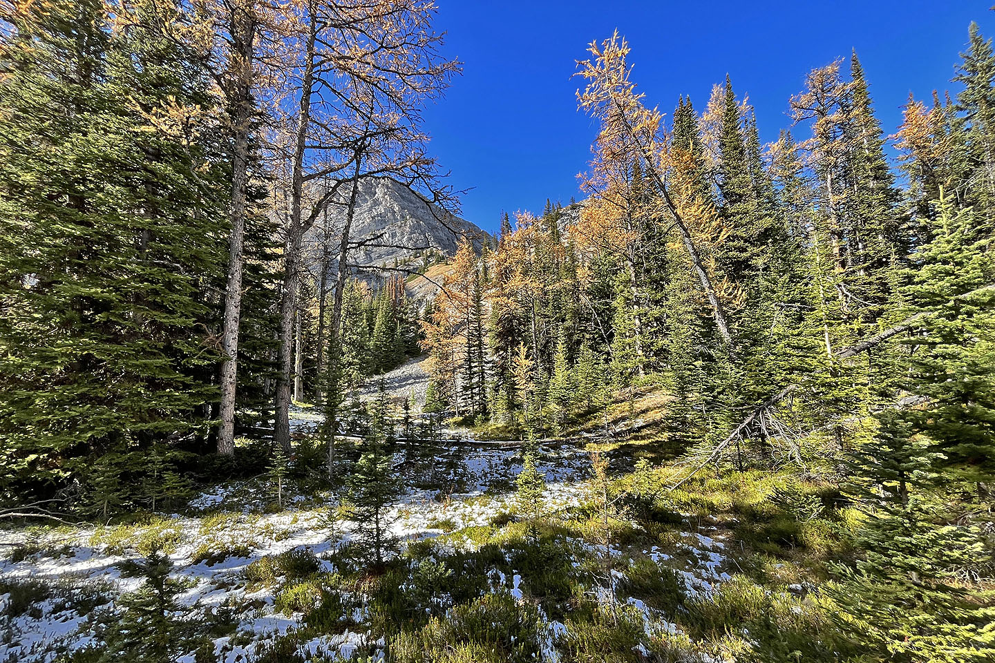 Strange to say, but when we stepped into the forest on that fall day, we didn’t have a clear destination, not from our unplanned starting point. We intended to start at Old Goat Glacier trailhead, unaware that the road there was closed for the season. We weren’t keen on walking up the road from the parking lot where we stopped, but maybe it was feasible to angle up the slope to reach our objective. Or perhaps we could change our goal to the tarn showing on the map. The terrain and bushwhacking would dictate our choice. With me were Doug, Rebecca and her daughter Ann.