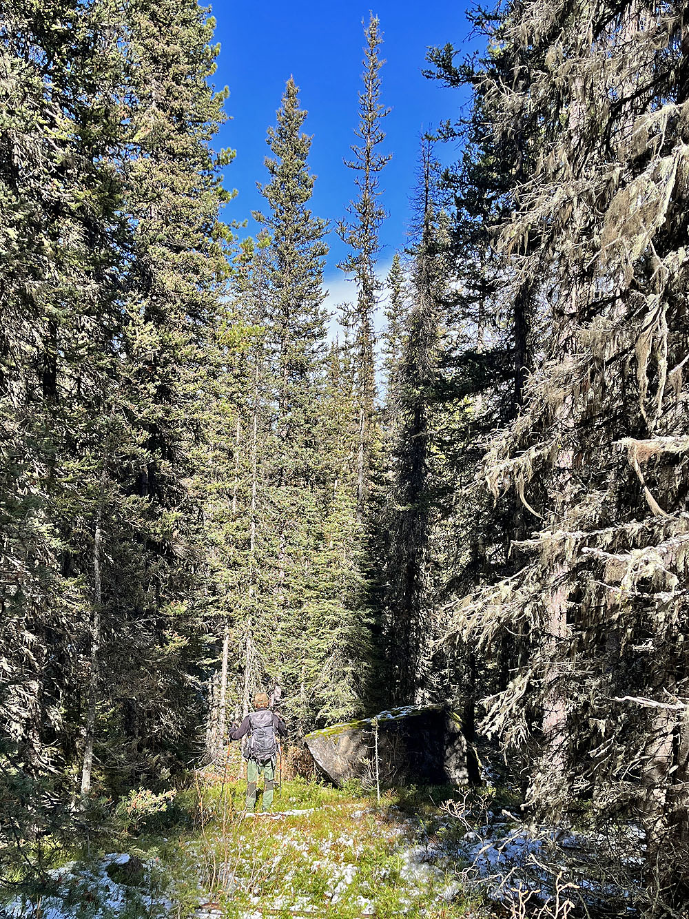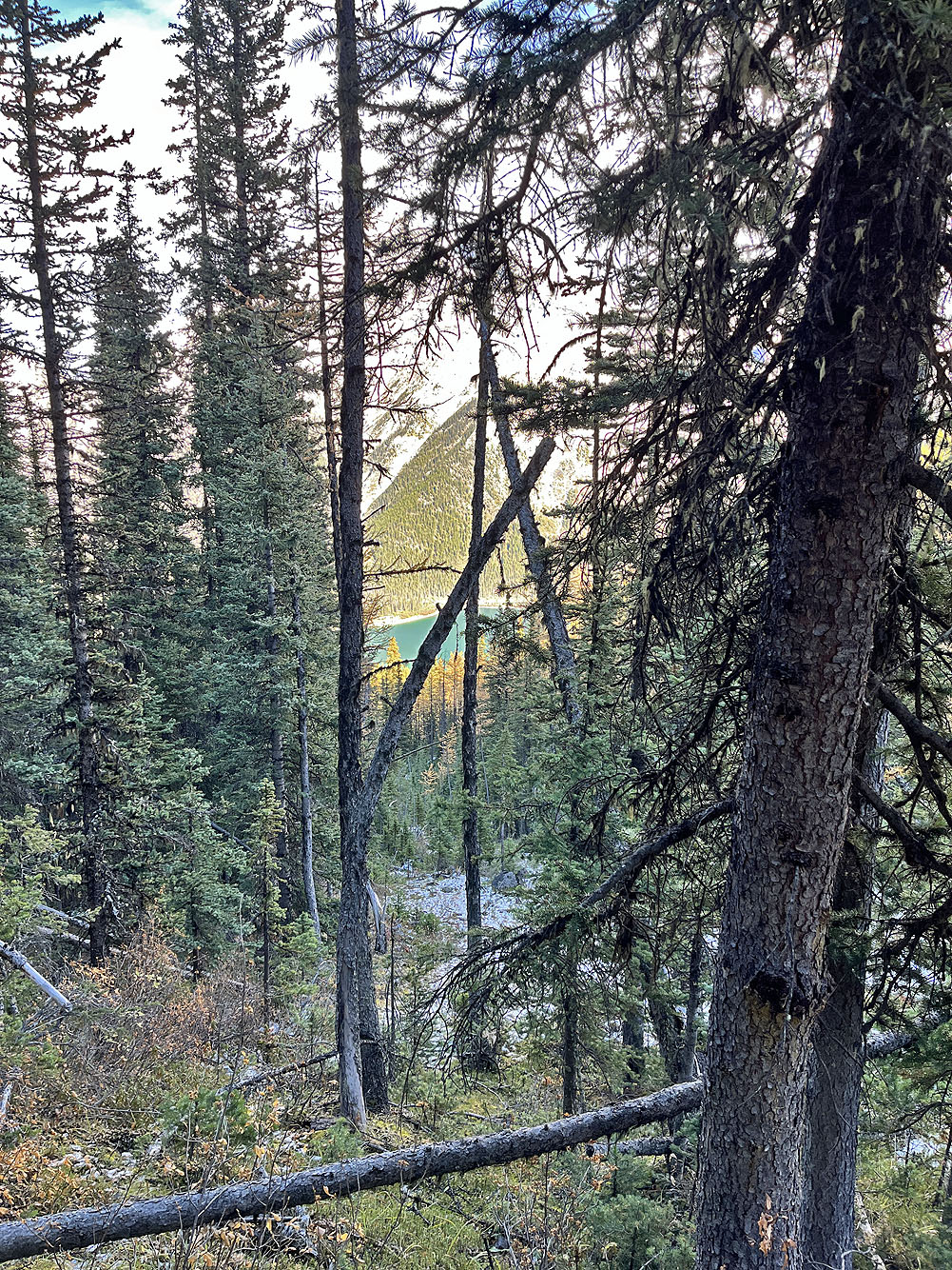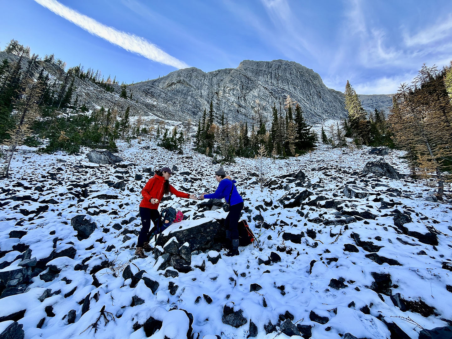 Strange to say, but when we stepped into the forest on that fall day, we didn’t have a clear destination, not from our unplanned starting point. We intended to start at Old Goat Glacier trailhead, unaware that the road there was closed for the season. We weren’t keen on walking up the road from the parking lot where we stopped, but maybe it was feasible to angle up the slope to reach our objective. Or perhaps we could change our goal to the tarn showing on the map. The terrain and bushwhacking would dictate our choice. With me were Doug, Rebecca and her daughter Ann.